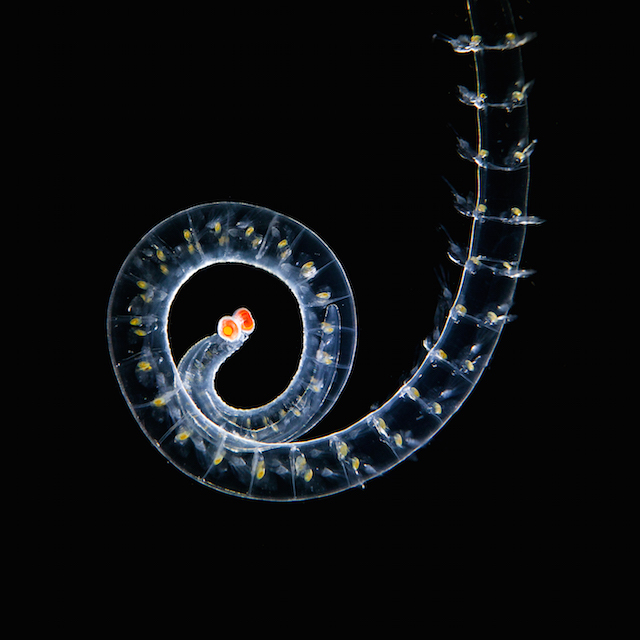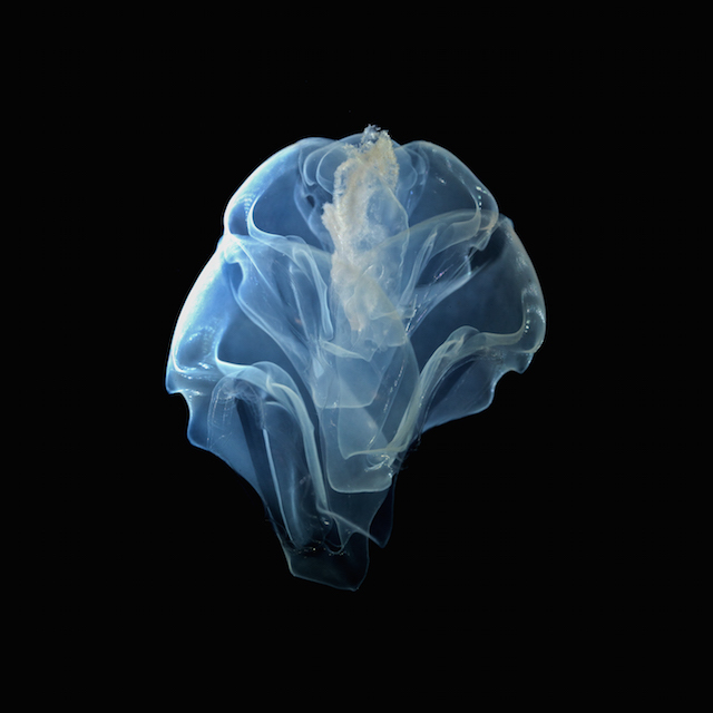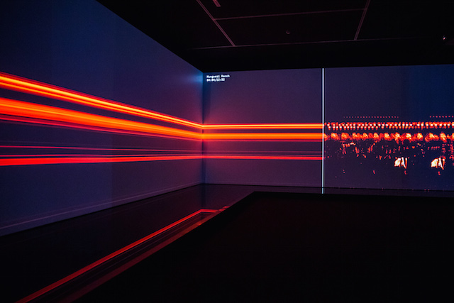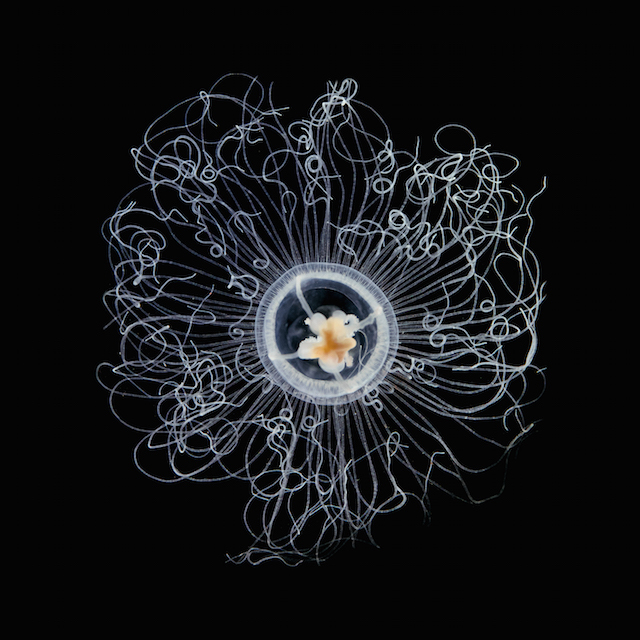視覚で動物たちの様々な表情を観察した後には、地下の展示スペースでは視覚と聴覚を同時に刺激してくれるユニークな作品たちが待ち受けている。イギリスのコレクティヴ・ユナイテッド・ヴィジュアル・アーティスト (UVA) は、Bernie Krause が録音し再編した動物たちのオーケストラを、サウンドスケープで視覚的に翻訳した3Dの電子インスタレーションを制作。もう一方の部屋では、フランス国立科学研究センター (CNRS) のディレクターであり、タラ海洋プロジェクトの創始者の一人でもある Christian Sardet (クリスチャン・サルデ) が撮影した写真を使ったインスタレーションを公開。
