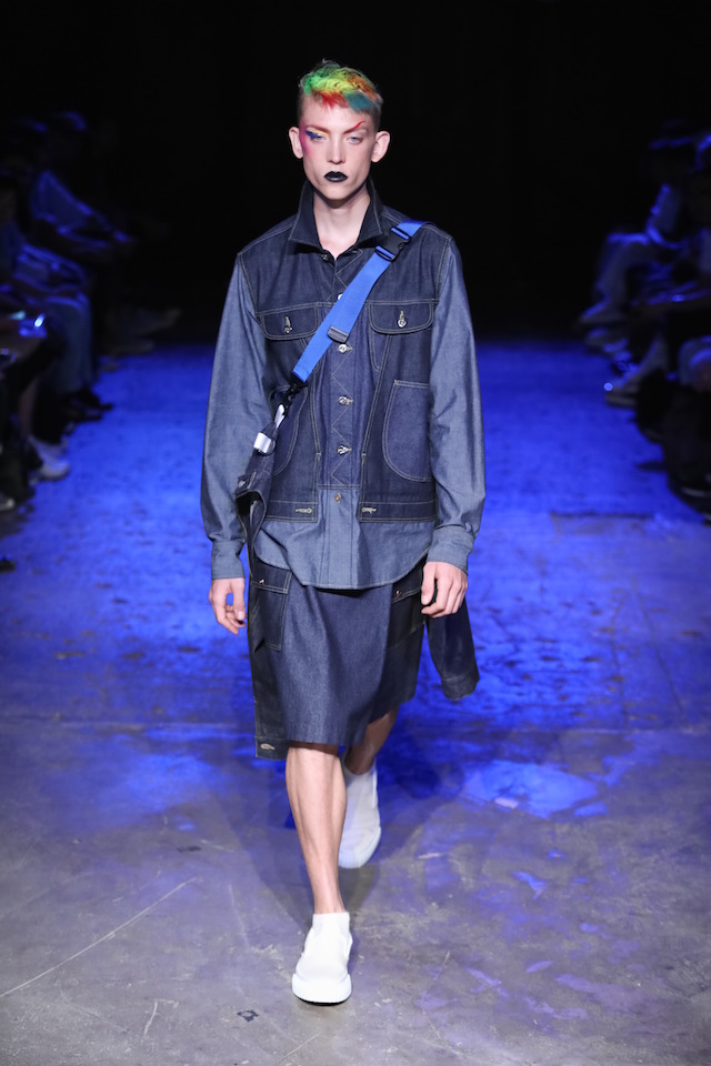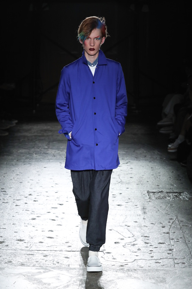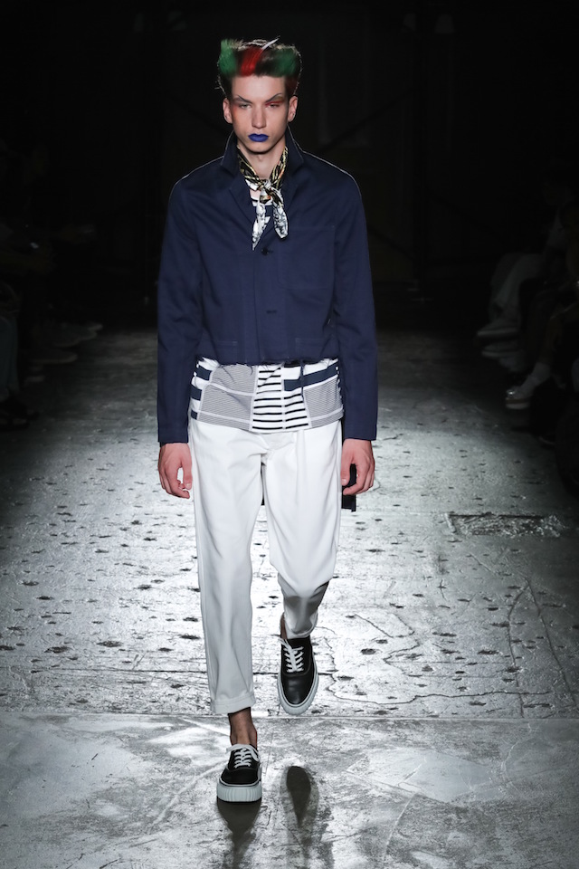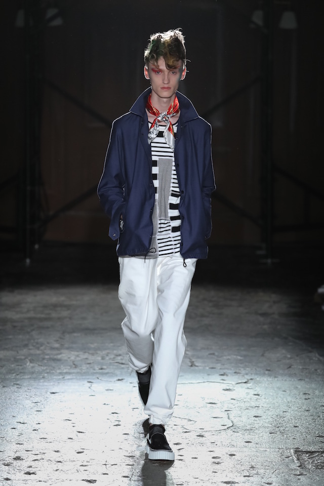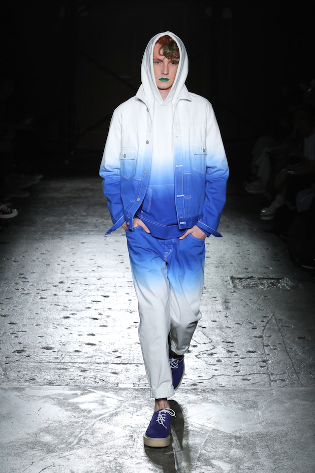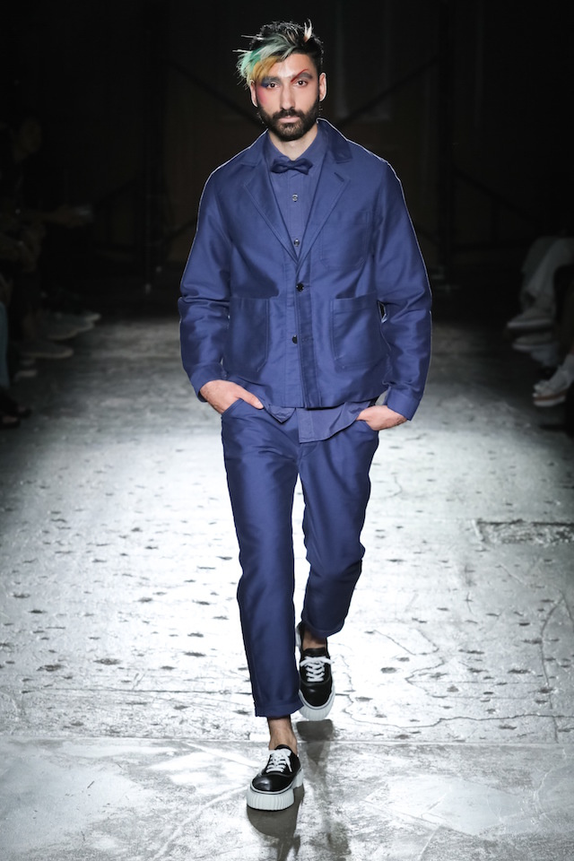 全員インディゴのファーストルックに続き、ショーの前半ではブルーを基調にしたルックが登場。ニューロマンティックや思わせる “flamboyant (フランボヤン、色鮮やかで派手)” なヘアメイクは、マリンテイストのスタイリングに妖艶なアクセントを加えた。