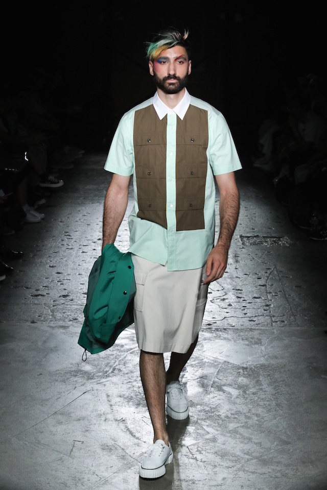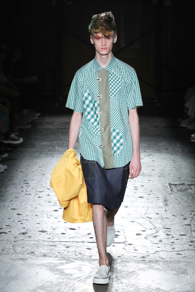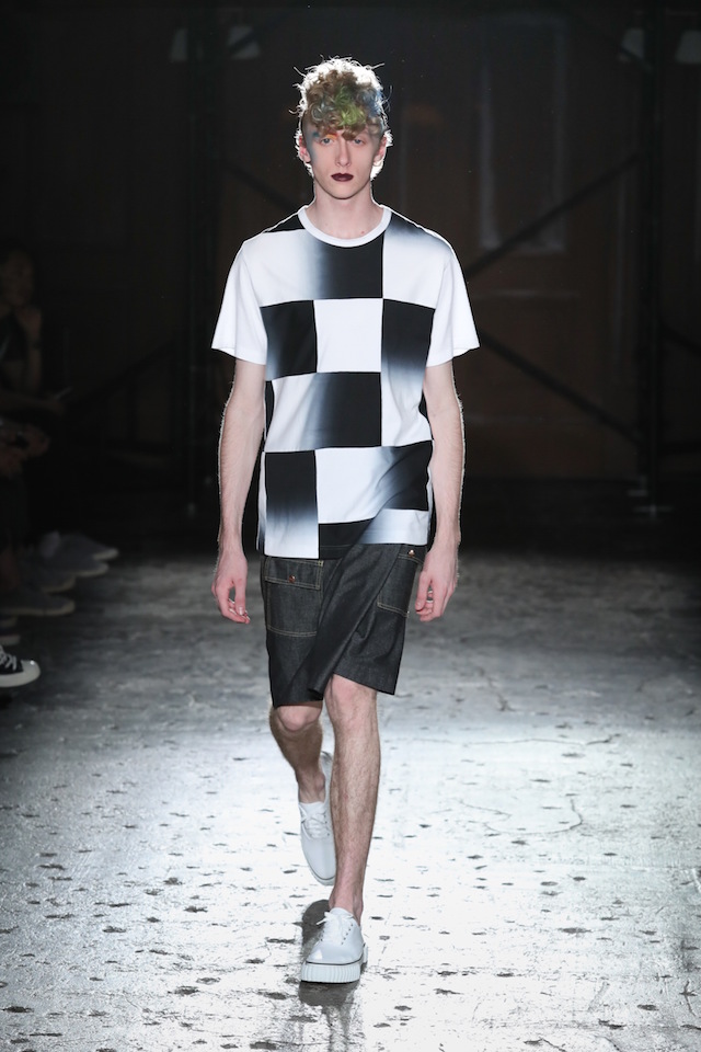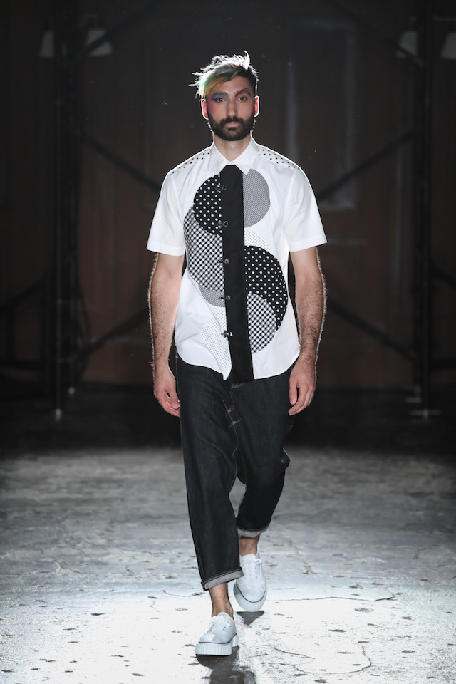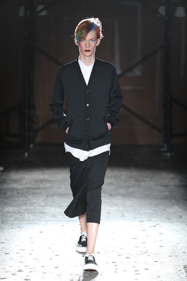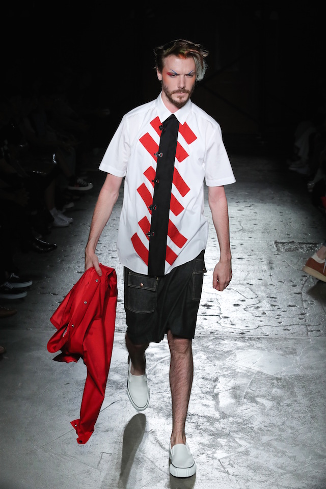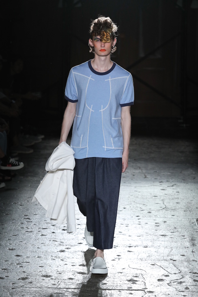 シックなブルー、グラマラスなネオンカラー、そしてフィナーレを飾るのはブラック&ホワイト。ボタンダウンのシャツやカットソー、ショーツ、ステンカラーのコートなど比較的シンプルなアイテムで構成されたモノトーンルックは、それぞれシンプルなデザインありながらひねりの効いたディティールが目を引いた。