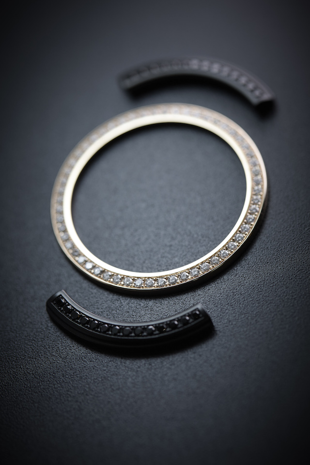 ピンクゴールドと、ブラックDLCコーティングを施したステンレススティールのコンビ使いのベゼルには、アイコニックなブラックダイヤモンドとホワイトダイヤモンドがあしらわれており、リュクスなガルーシャストラップの妖艶な輝きと見事なコントラストを生み出している。