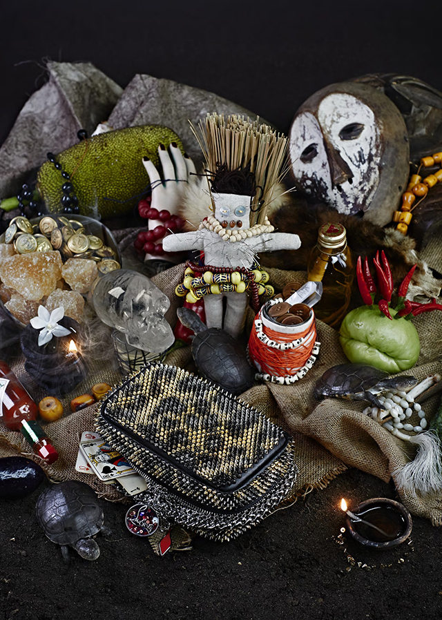 「Piloutin Spikes (ピロタン スパイクス)」は、スパイス、火、魔法を表現。全体にスパイクを施し、その一つ一つの輝きがレオパード柄を描きだすこのバッグは、彼のミューズであるキャバレーのショーガールを連想させる官能性とワイルドさを兼ね備えたデザインとなっている。