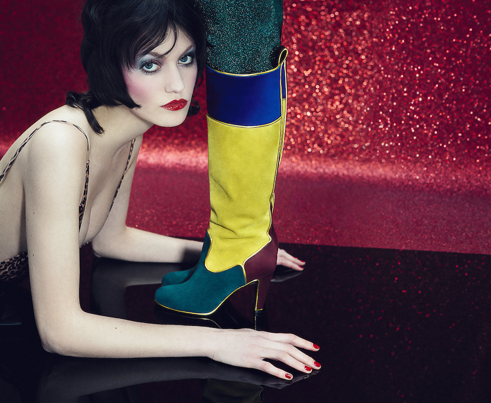 「当時は誰もが、普通に見えるように努力するより派手な格好をして見せびらかすことで、ある程度アティチュードを楽しんでいました。アティチュードを持つことを誇りに思い、競って女っぽさを見せつけ合っていました。」と語るデザイナーの Chiristian Louboutin。若い頃からビジュアルアイデンティティーを形成し、パリジャンのナイトライフの中心人物となっていた彼は、インスピレーションを受けた70年代のグラムロックを謳歌したパワフルでアヴァンギャルドな女性を色鮮やかなカラーパレットや、超贅沢な素材、アイライナーのようなポップなパイピングのディテールなどのエレメントで表現した。