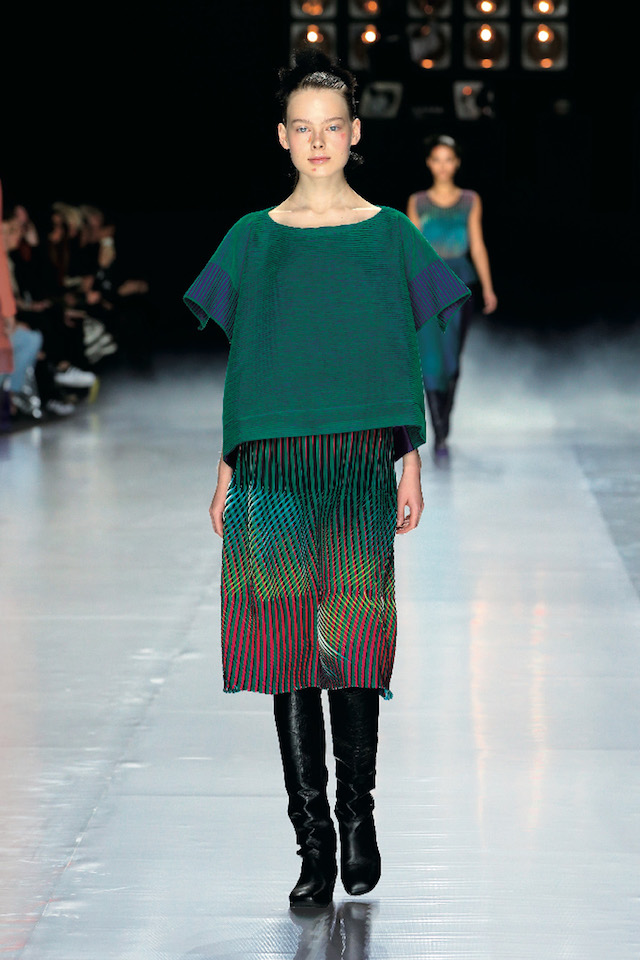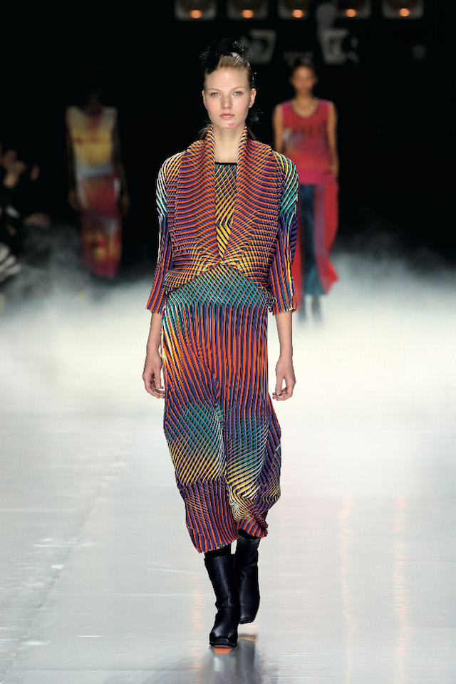 「色を混ぜる – その服は、特殊な “のり” を応用した立体性、伸縮性にとんだプリーツと縞状の多色プリントを組み合わせることで、色の加法混合の効果が生まれ、人の動きに合わせて色が刻々と変化する。まるで、その場で色を混ぜ合わせて、ライブで色を作っているかのようである。立体格子は、プリーツと同じように無数の細かい面を持ち、それぞれの面を塗り分けて行くと、見る角度によって連続的に変化する色の塊ができあがる。この立体が人の動きに合わせて変化し、ゆらぐ瞬間、この服を着て街を歩くときの楽しさを想像させる。」
