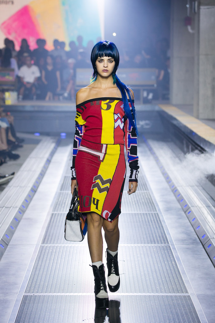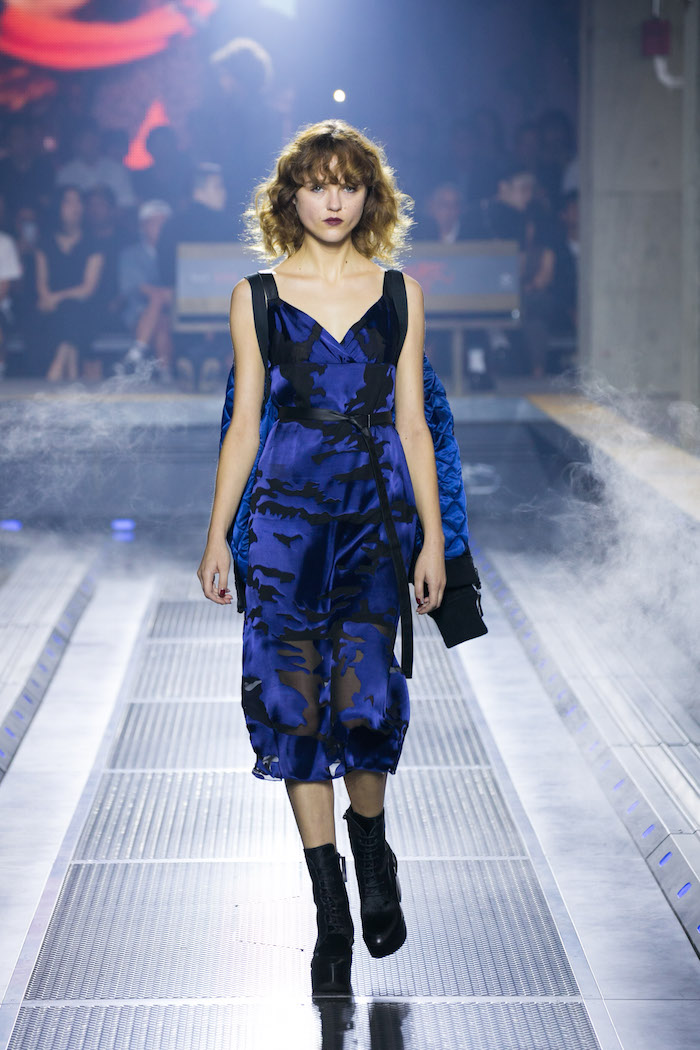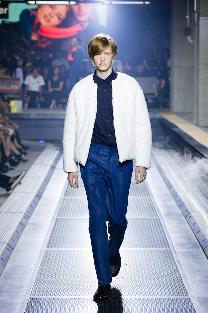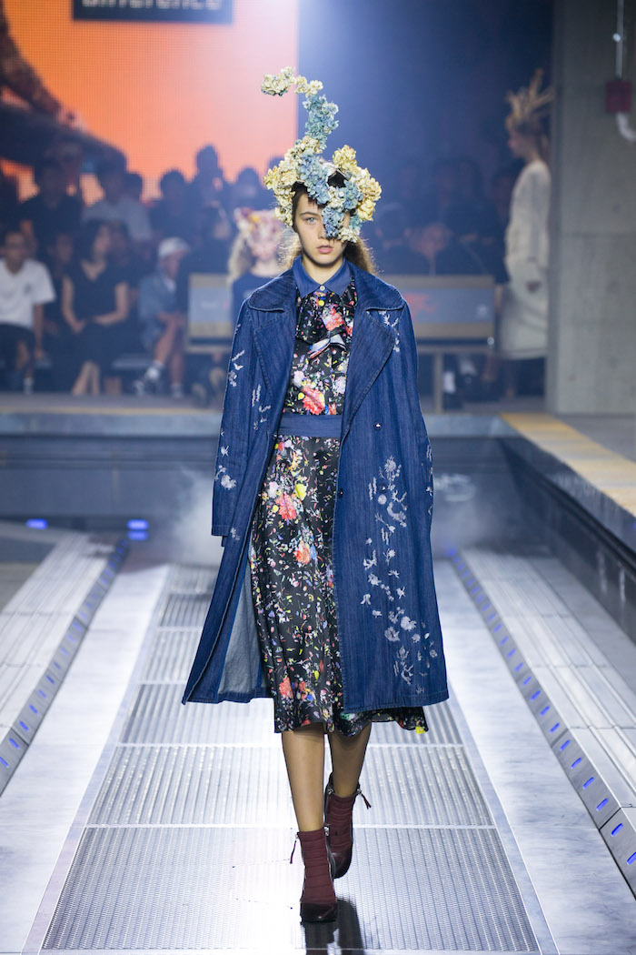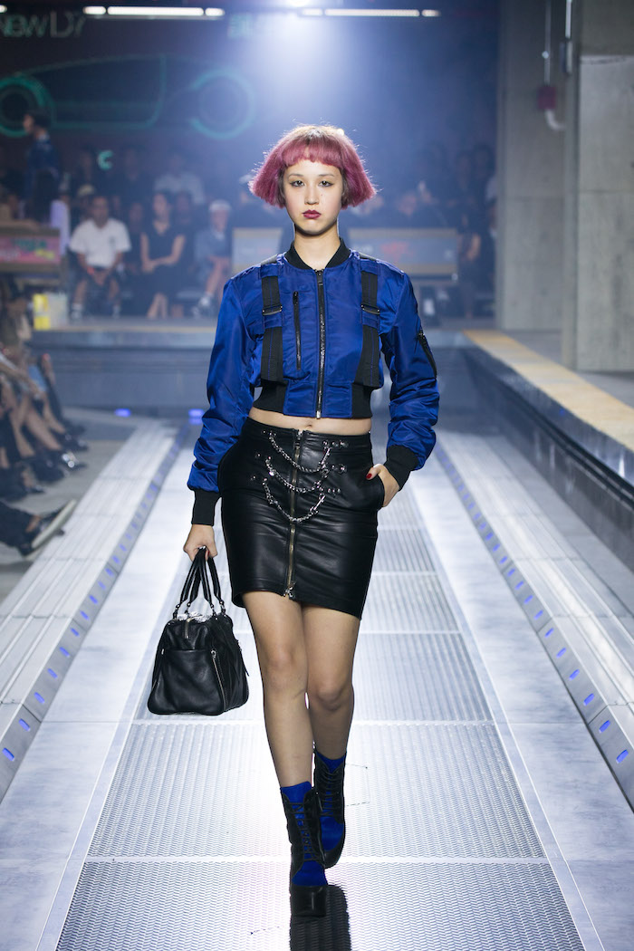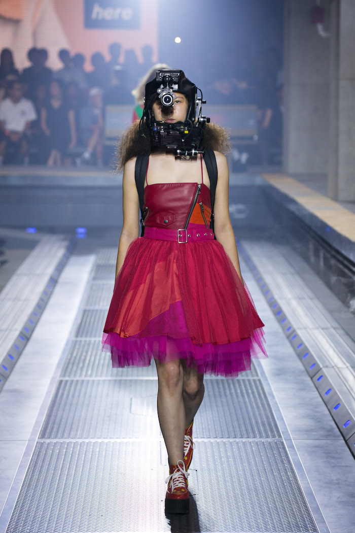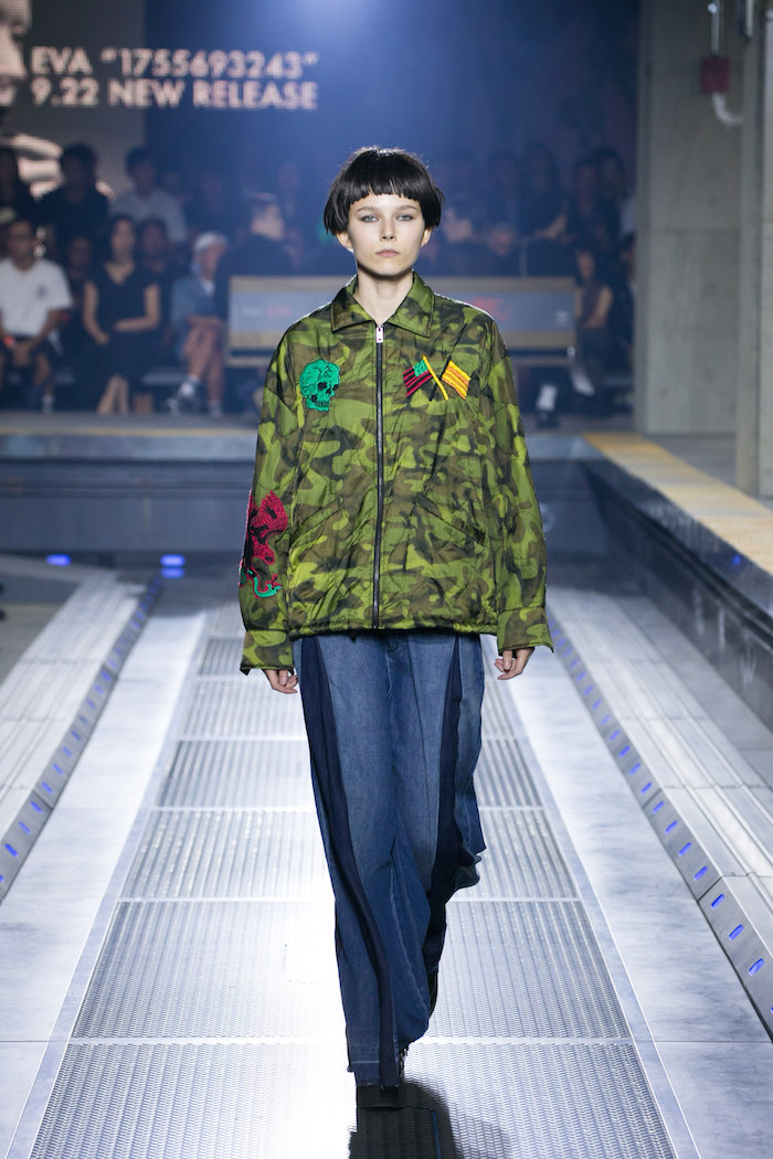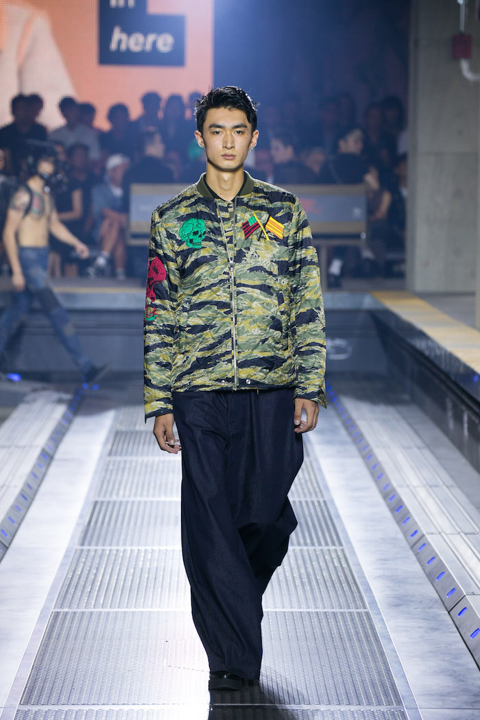 今回のランウェイショーが開催されたのは、天王洲アイル駅からほど近いイベントスペース、寺田倉庫。これまでにも数々のファッションブランドのイベントが開催されてきたこのスペースだが、今回のショーでは下町の夏祭りのようなアンダーグラウンドなスペースへと変身を遂げた。インダストリアルなムードの中煌々と輝くネオンライト。D.I.Y. テイストの会場演出は、2014年に虎ノ門ヒルズにて開催された Chanel (シャネル) のメティエダール コレクション「パリ–ダラス」や、今年の3月に開催された Dolce&Gabbana (ドルチェ&ガッバーナ) の「パジャマパーティー」など、「面白いファッションブランドのパーティーの影にこの人あり」で知られる籠谷友近が手がけている。