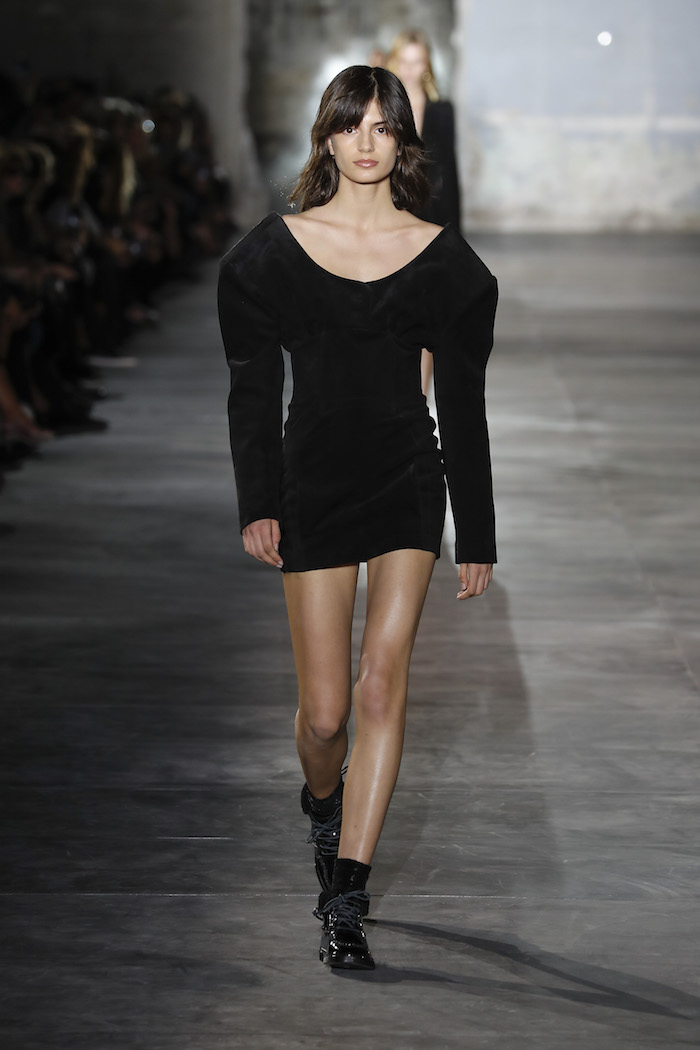 ファーストルックで幕を切ったのは、ブラックのレザードレス。特徴的なバストのカットラインと、ギャザーを寄せたショルダーのディティールは、ブラックのレザードレス。アメリカ版『Vogue (ヴォーグ)』の Sarah Mower (サラ・ムーア) 評によると、このルックは1982年に発表されたパフスリーブのドレスをアレンジしたものだという。