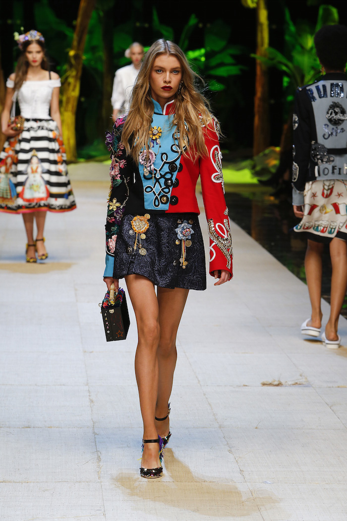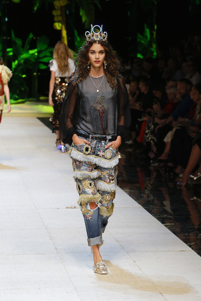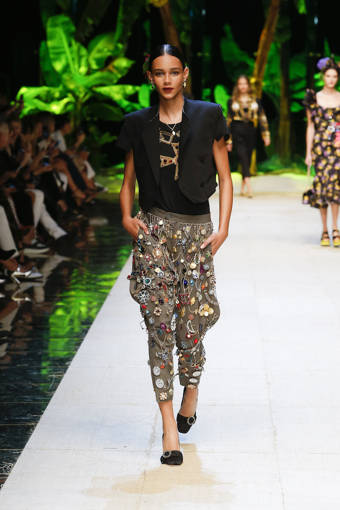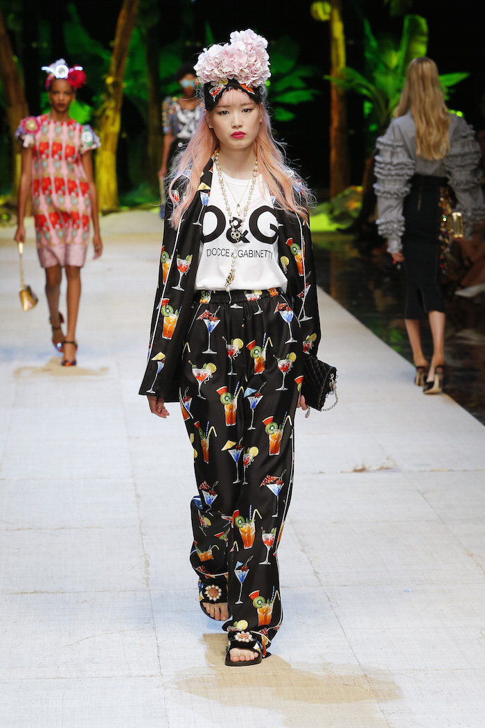 フワラー、パスタ、ラッキーチャーム、南国の魚たち、キリスト教のモチーフ、マンドリン、カクテルグラス…デザイナー Domenico Dolce (ドメニコ・ドルチェ) と Stefano Gabbana (ステファノ・ガッバーナ) の DNA であるイタリアの伝統的な装飾美学を凝縮した全91体のルックは、そのいずれもが強烈な個性と存在感を放っている。