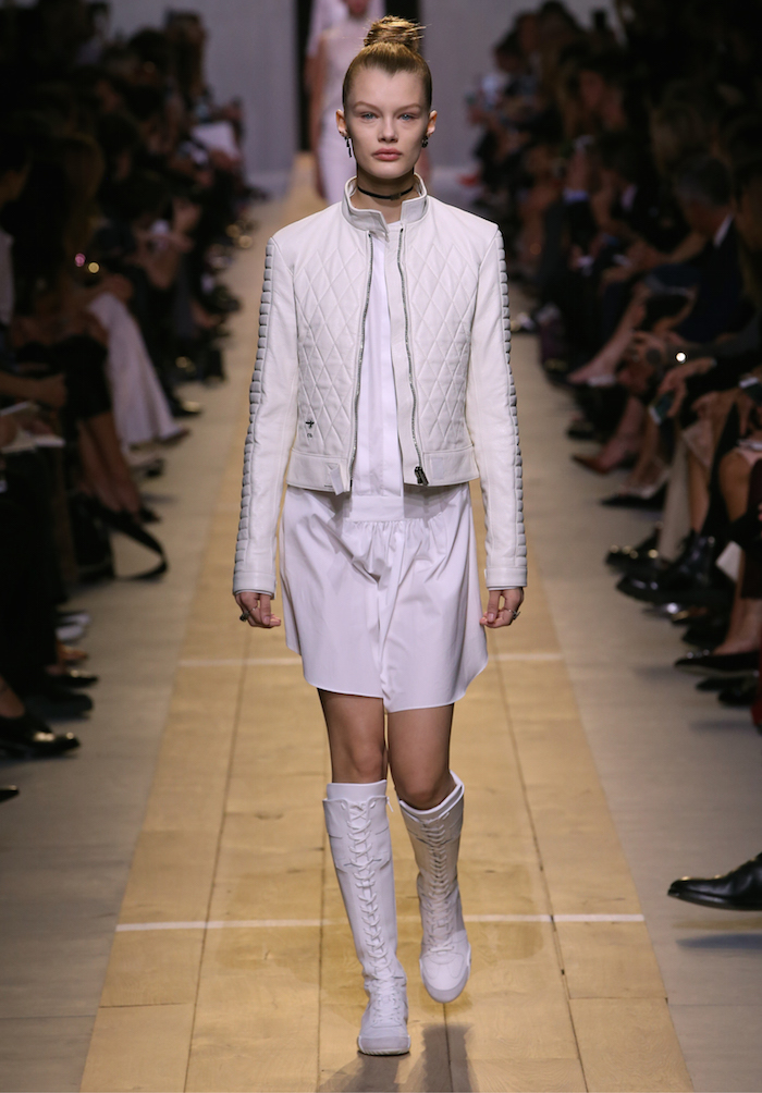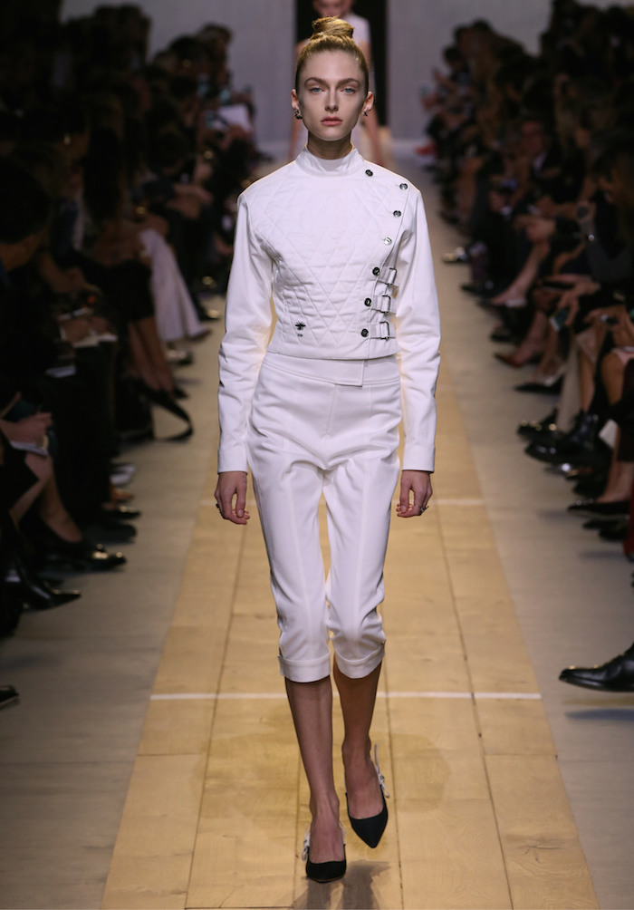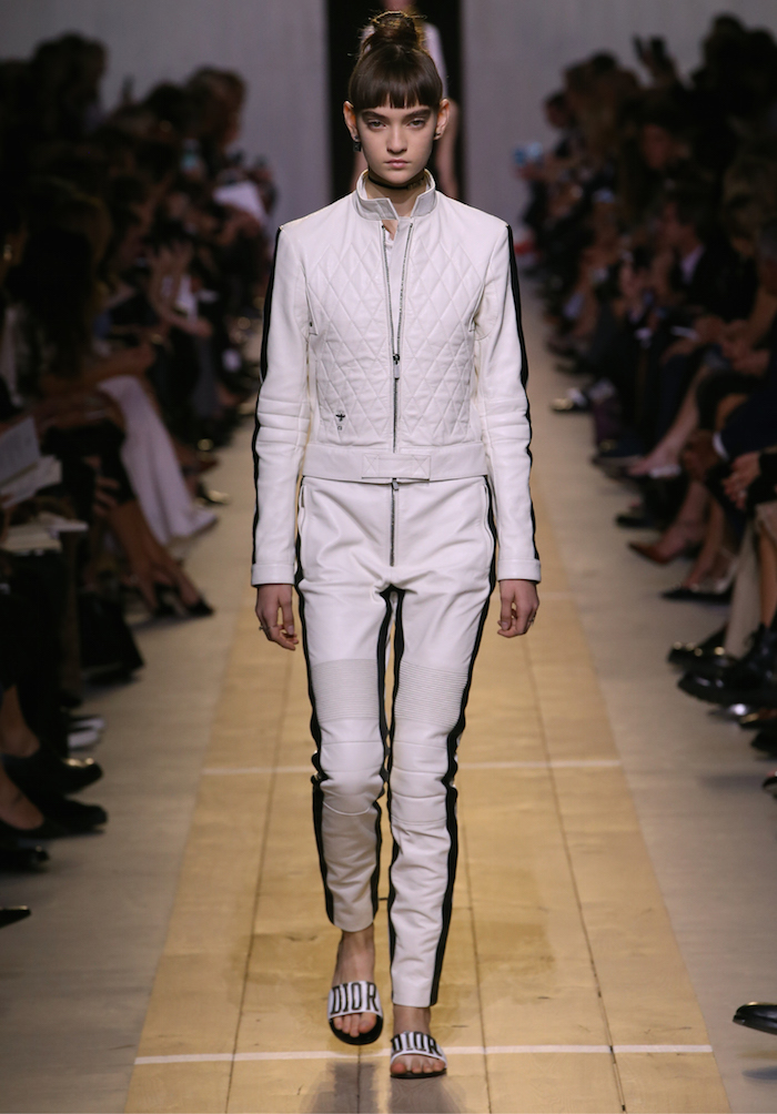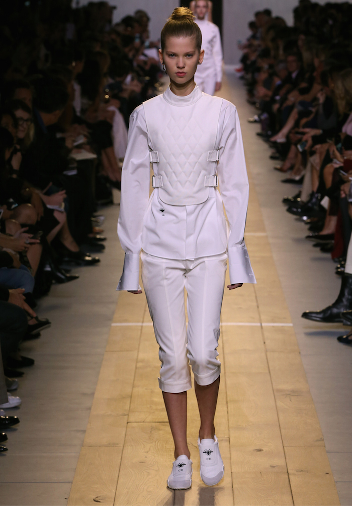 ショーの幕を切ったのは、純白のパンツスーツ。Dior のショーのファーストルックでパンツルックが提案される、というだけで意外に思うが、フェンシングのユニフォームのようにキルティングが施されたユニークなトップスは、スポーティーかつミニマルでありながらどこかフェミニンさも漂わせている。