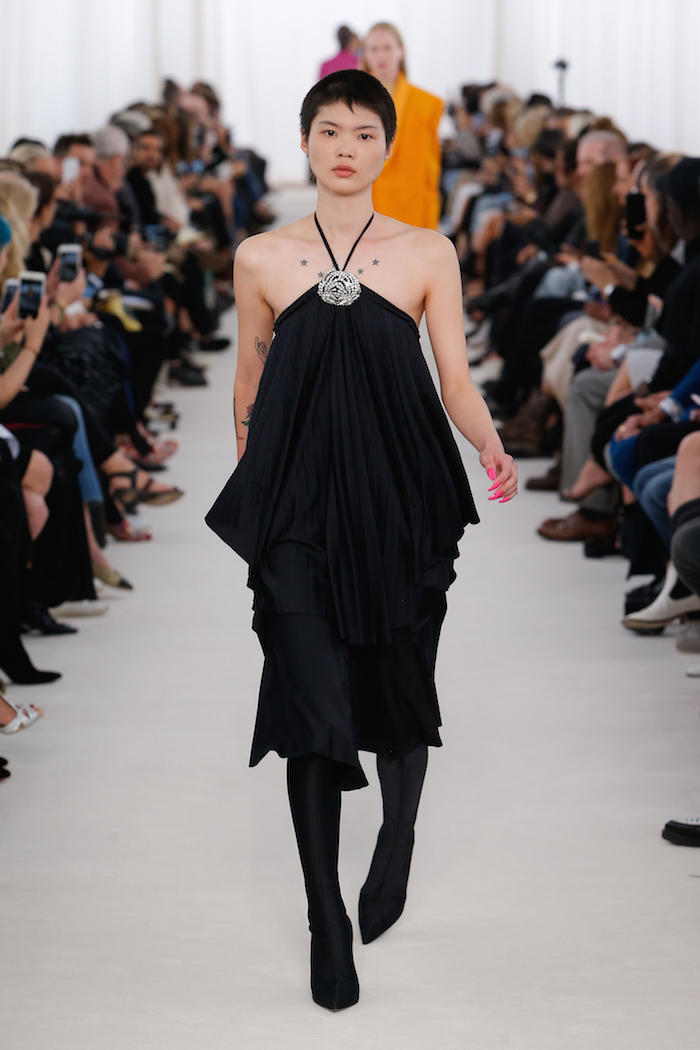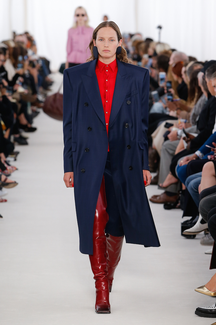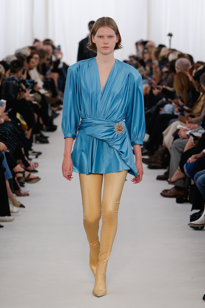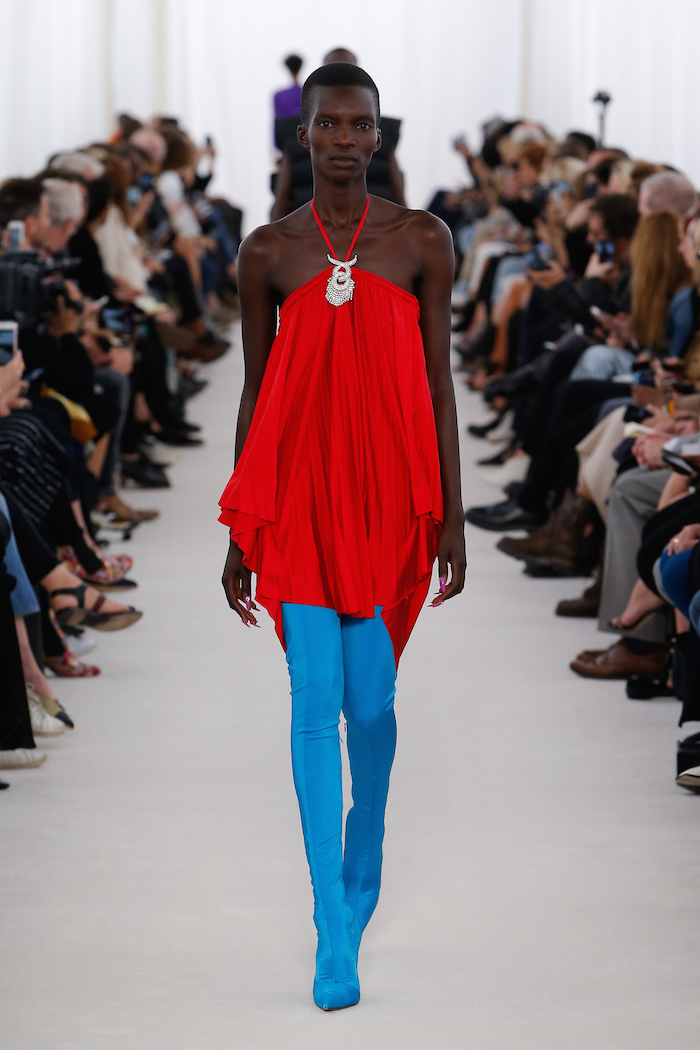 そして今回、待望のセカンドシーズンとなったコレクションでは、さらに大きくせり出したスクエアショルダーと、強烈なコントラストを演出するネオンカラーが登場。メゾンの創設者である Cristóbal Balenciaga (クリストバル・バレンシアガ) がジョーゼットのギャザールックを初めて打ち出したとされる 1958年に着想を得たルックでは、同年に世に広まった当時の新素材、スパンデックスを使ったディスコムード溢れるスタイリングを提案。サイハイブーツに続き、全てをトーン・オン・トーンで統一したパンツ一体型のスティレットブーツは、今からファッションアディクトたちのウィッシュリスト入り確定だろう。