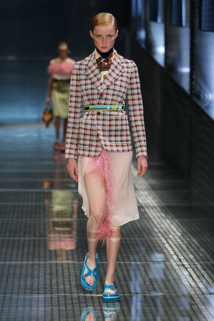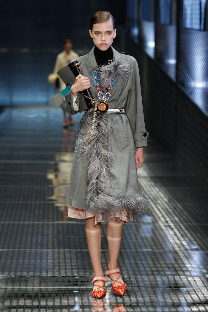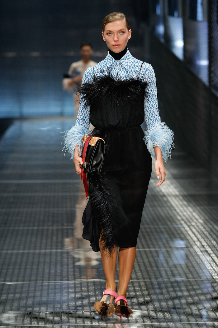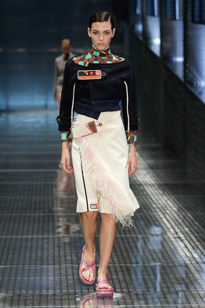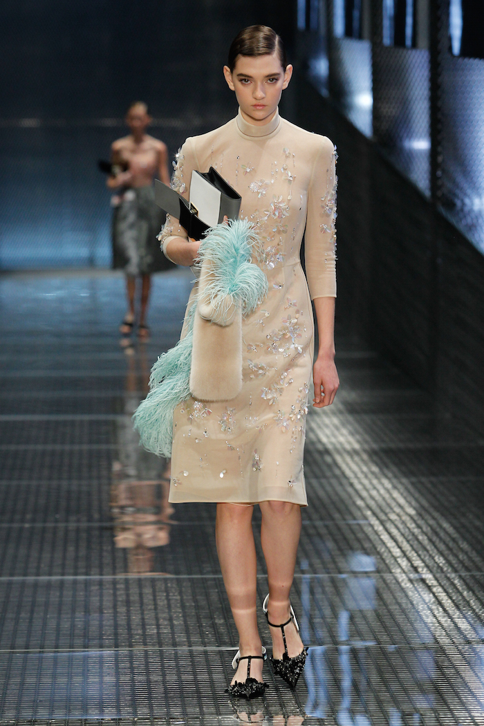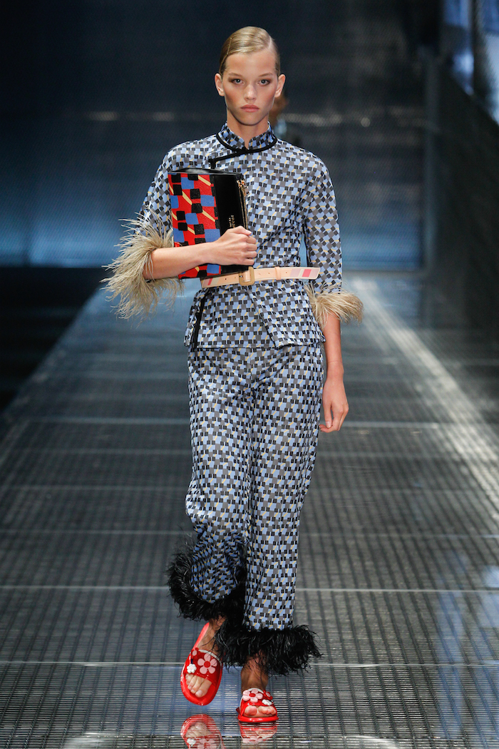 ミラノファッションウィーク期間中にあたる22日、Prada (プラダ) による2017年春夏ウィメンズコレクションが発表された。無機質なメタルのテクスチャーが近未来的な空間を作り上げるランウェイで、今季提案されたのはあらゆる時代背景やスタイルをハイブリッドに交錯させたミックスルック。ファーストルックで登場した、スポーティーなディティールを取り入れたミニマルなルックから、アールデコを思わせるジオメトリックなテキスタイルで仕立てられたシノワズリ風のセットアップ、そしてロココ調のオーストリッチフェザーなど、これぞ Miuccia Prada (ミウッチャ・プラダ) と言いたくなる絶妙なスタイリングは、多くの色や柄をミックスしているにも関わらず決して雑多な印象はなく、極めてモダンかつシックな佇まいだ。