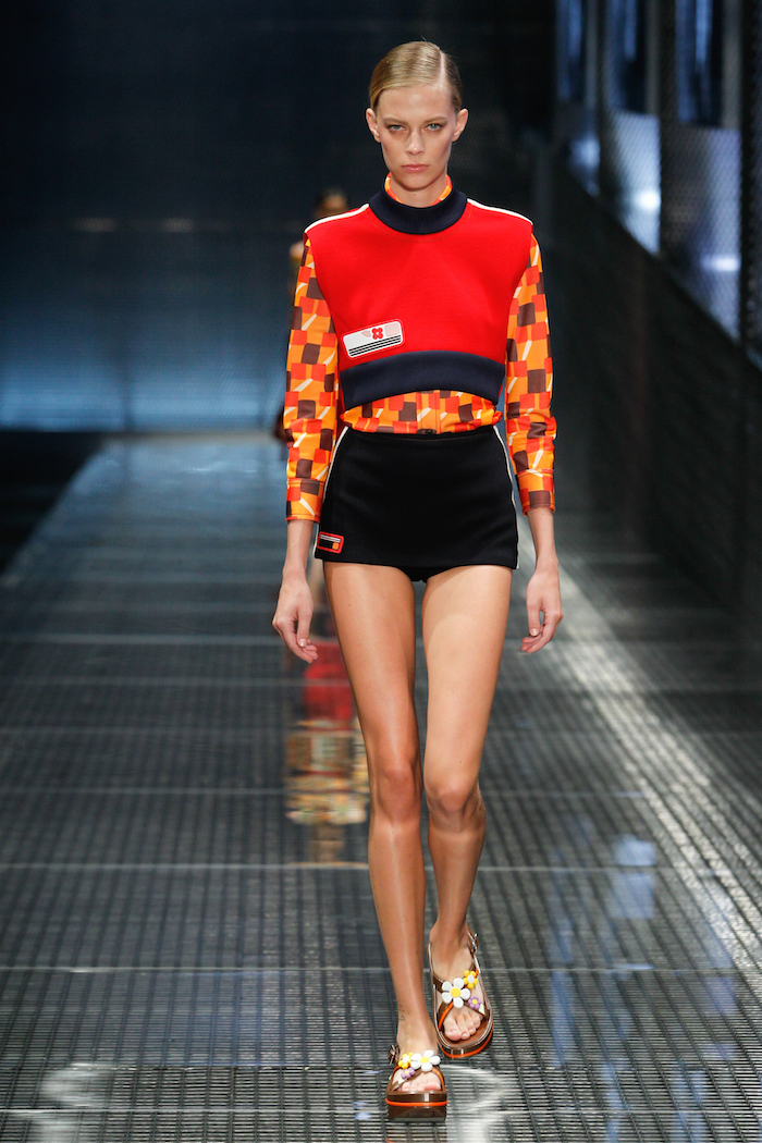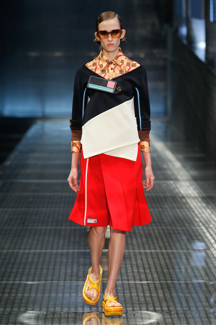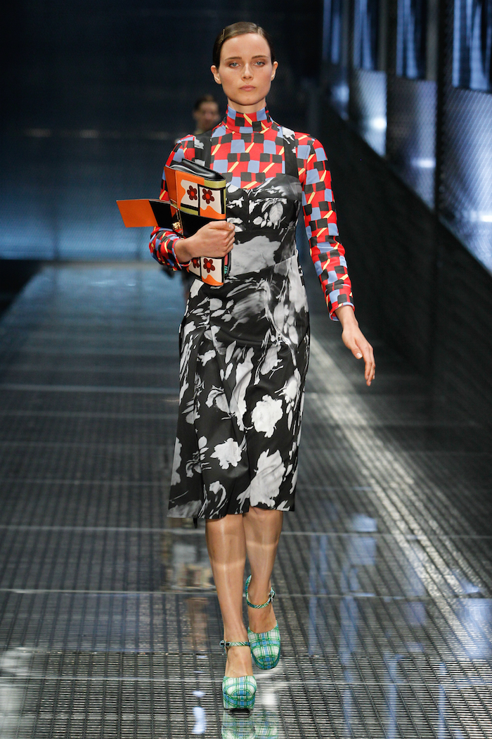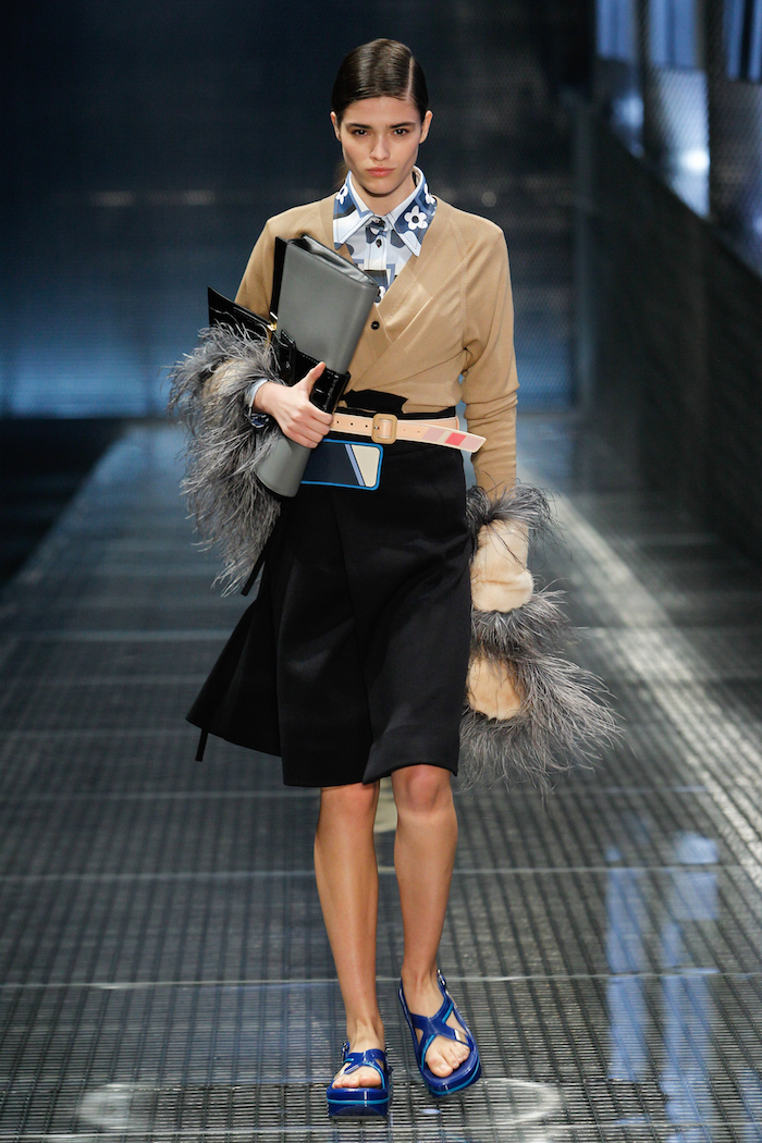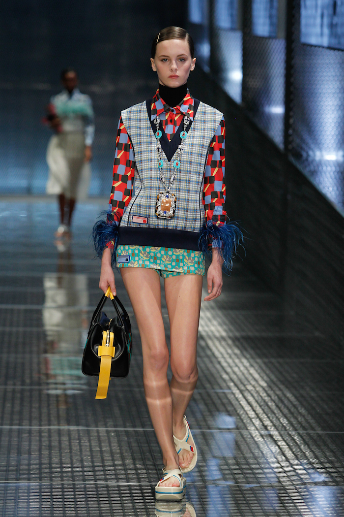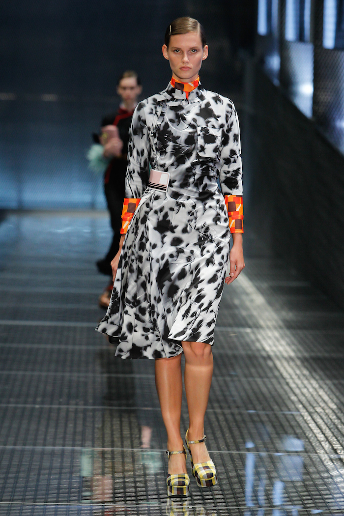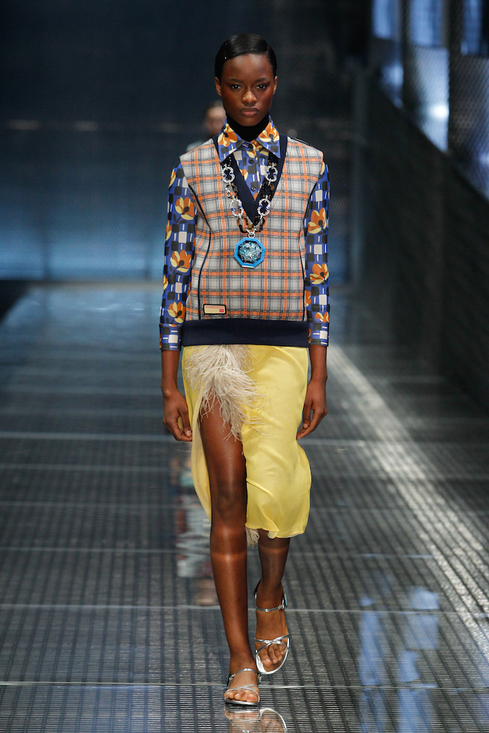 ミラノファッションウィーク期間中にあたる22日、Prada (プラダ) による2017年春夏ウィメンズコレクションが発表された。無機質なメタルのテクスチャーが近未来的な空間を作り上げるランウェイで、今季提案されたのはあらゆる時代背景やスタイルをハイブリッドに交錯させたミックスルック。ファーストルックで登場した、スポーティーなディティールを取り入れたミニマルなルックから、アールデコを思わせるジオメトリックなテキスタイルで仕立てられたシノワズリ風のセットアップ、そしてロココ調のオーストリッチフェザーなど、これぞ Miuccia Prada (ミウッチャ・プラダ) と言いたくなる絶妙なスタイリングは、多くの色や柄をミックスしているにも関わらず決して雑多な印象はなく、極めてモダンかつシックな佇まいだ。