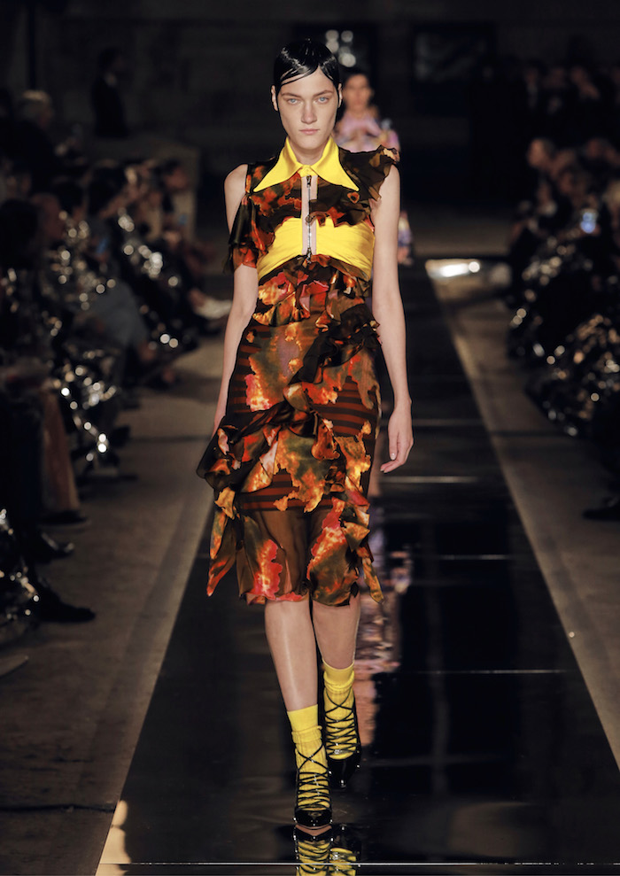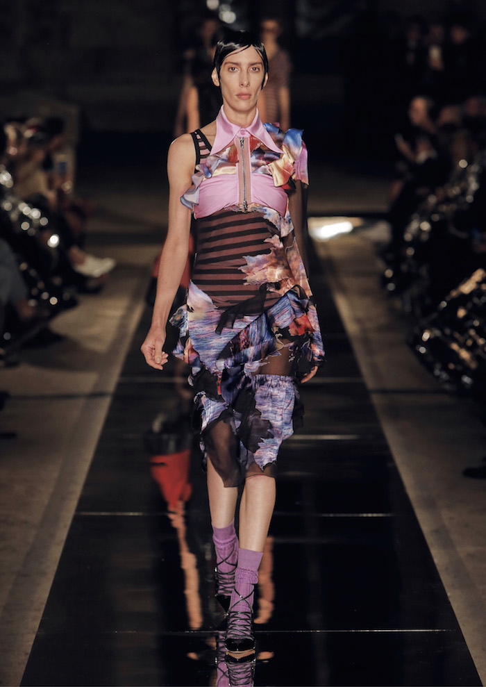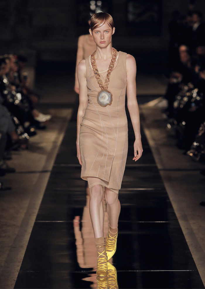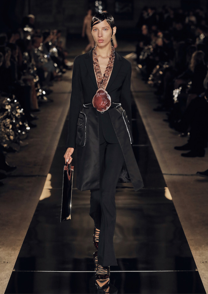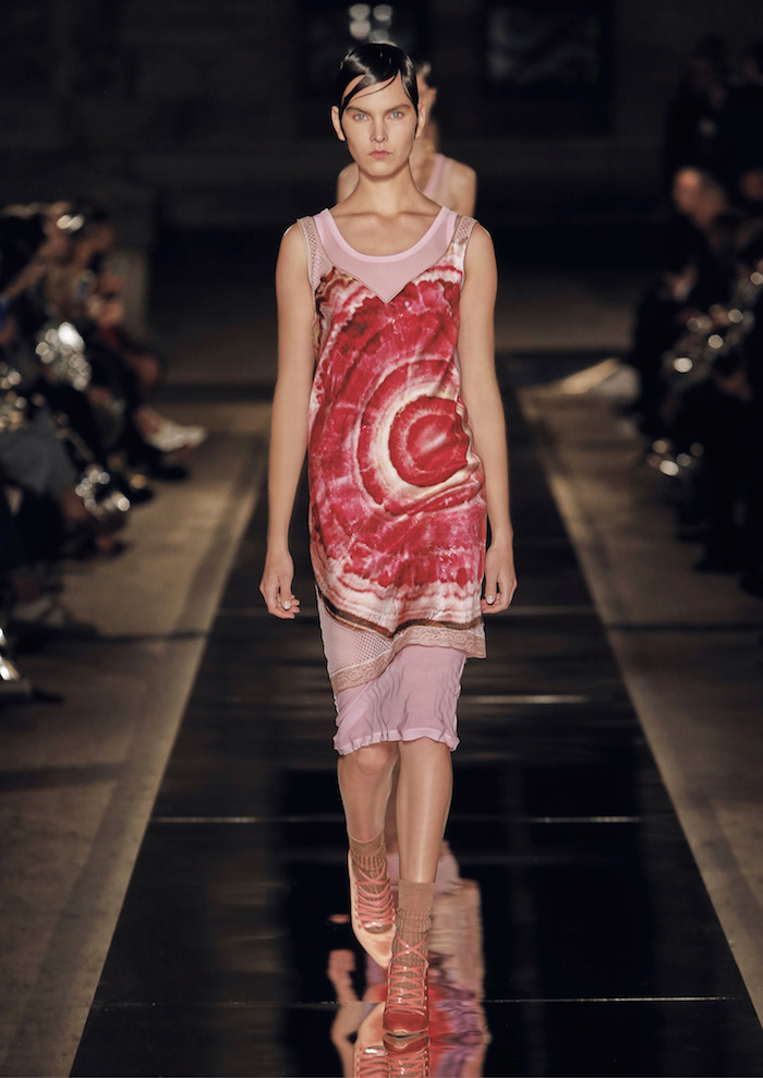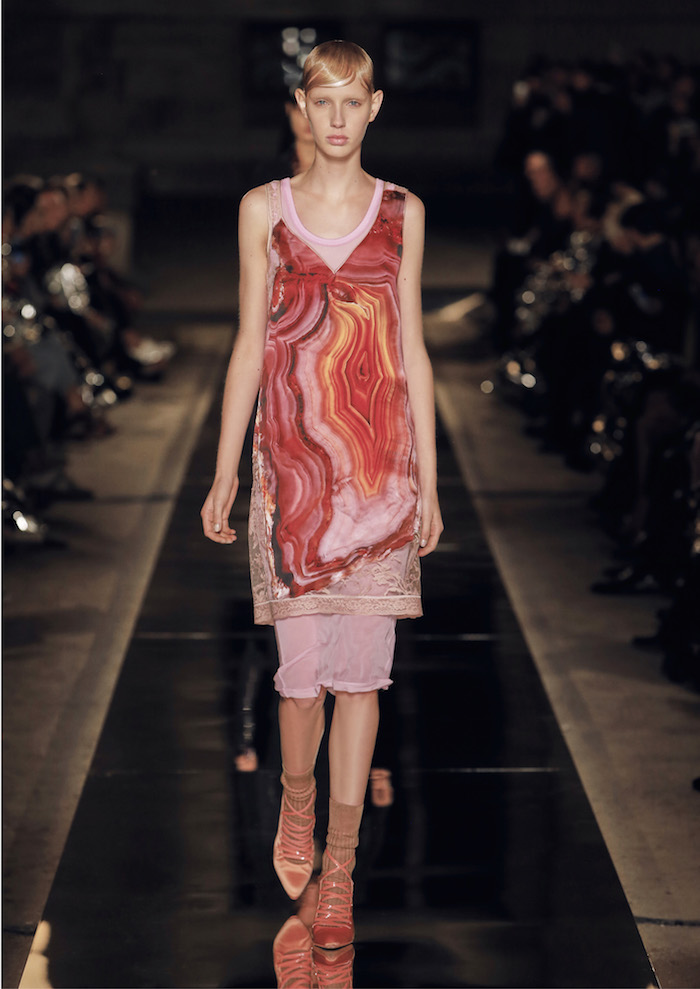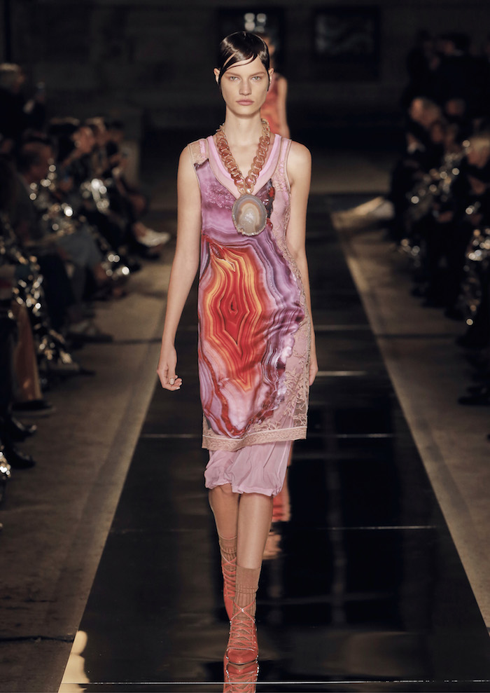 今季コレクションにおいて、クリエイティブ ディレクター Riccardo Tisci (リカルド・ティッシ) が志したのは「自然界の聖なる霊性とフェミニティへの賛美」。ファーストルックで登場したのは、鉱石の持つ美しいレイヤーをプリントで表現したシフトドレスだ。