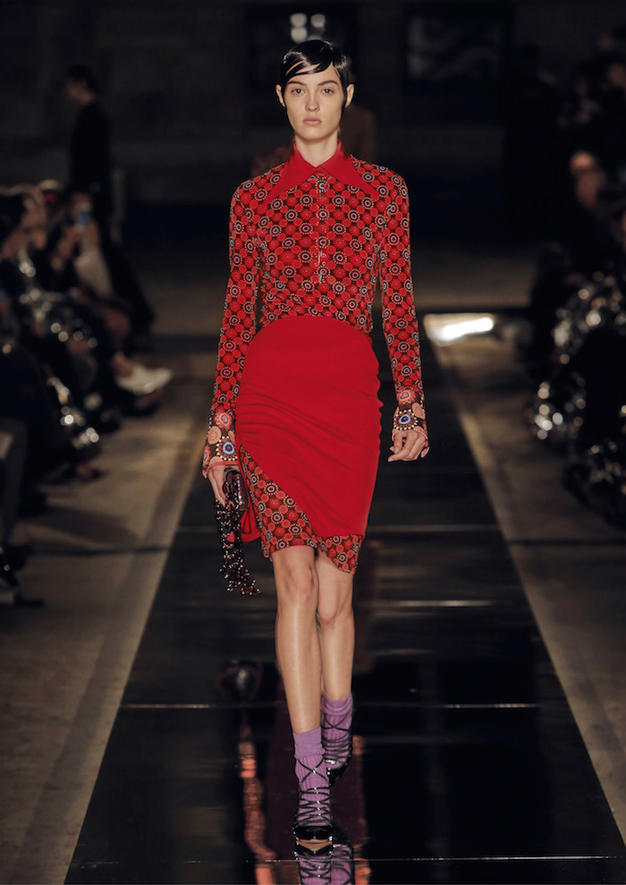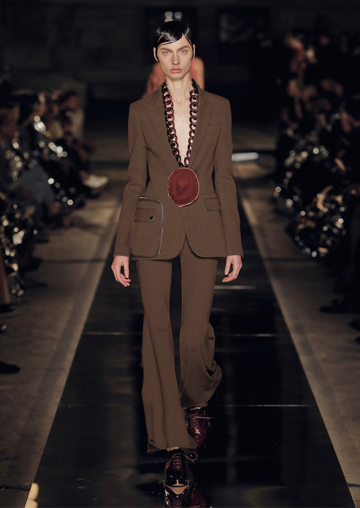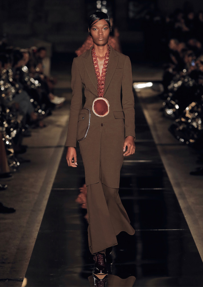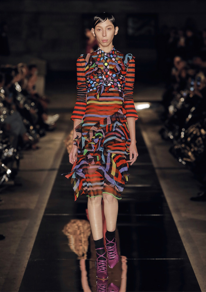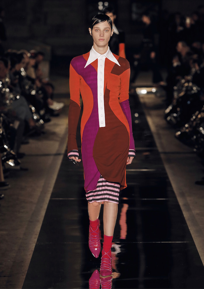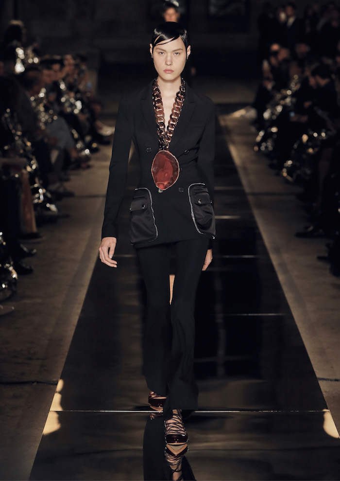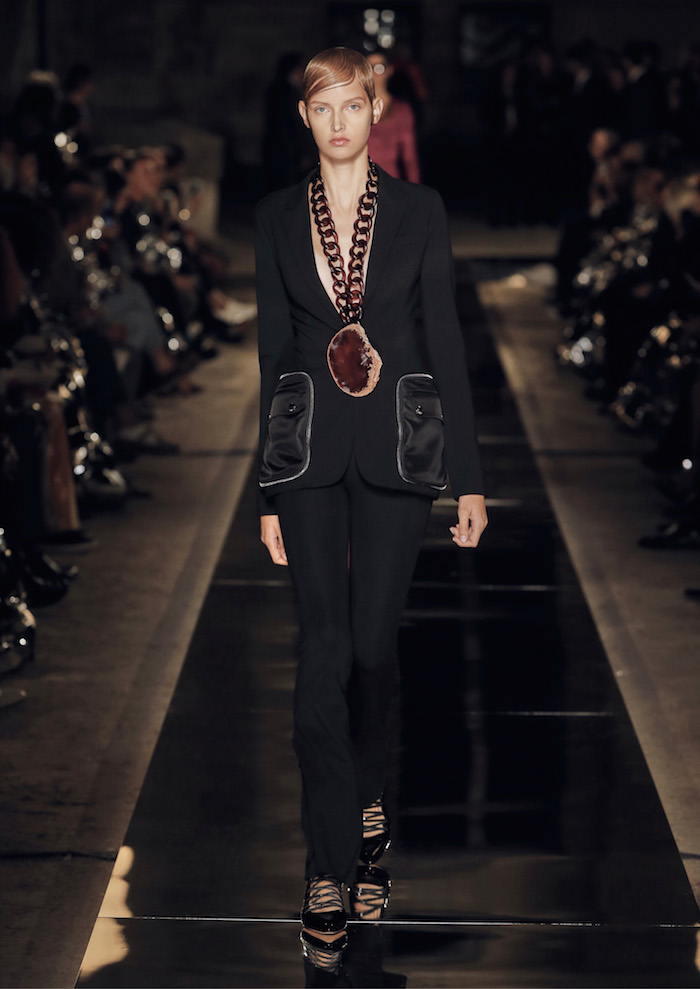 今季コレクションにおいて、クリエイティブ ディレクター Riccardo Tisci (リカルド・ティッシ) が志したのは「自然界の聖なる霊性とフェミニティへの賛美」。ファーストルックで登場したのは、鉱石の持つ美しいレイヤーをプリントで表現したシフトドレスだ。