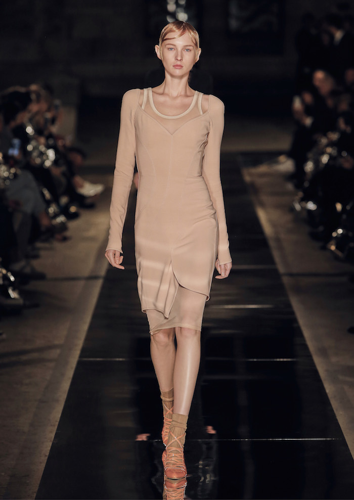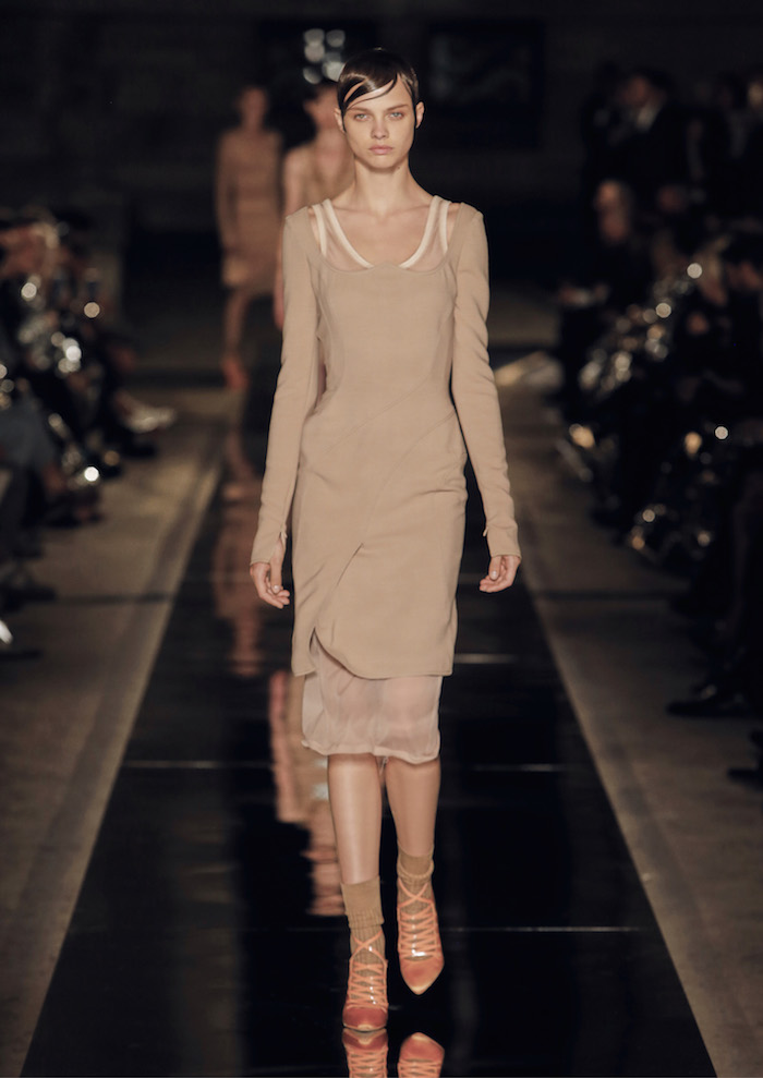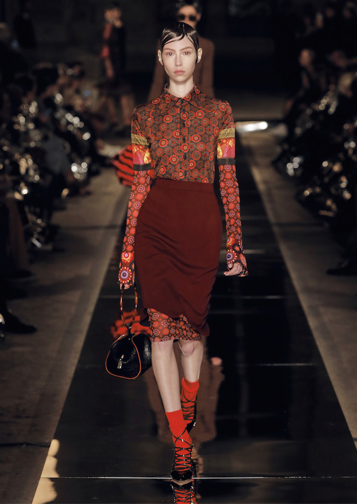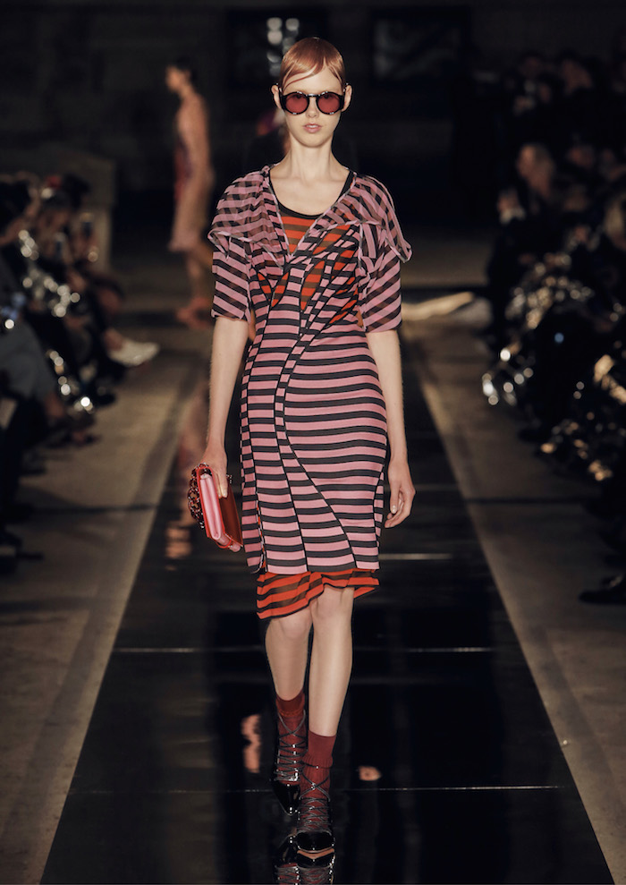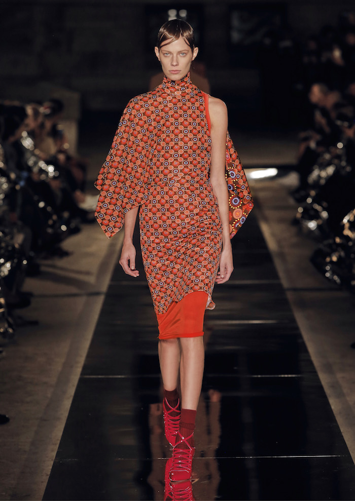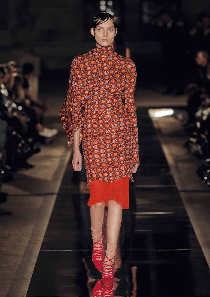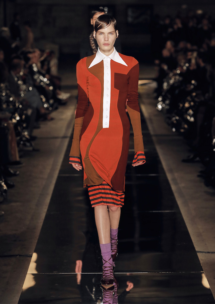 今季コレクションにおいて、クリエイティブ ディレクター Riccardo Tisci (リカルド・ティッシ) が志したのは「自然界の聖なる霊性とフェミニティへの賛美」。ファーストルックで登場したのは、鉱石の持つ美しいレイヤーをプリントで表現したシフトドレスだ。
