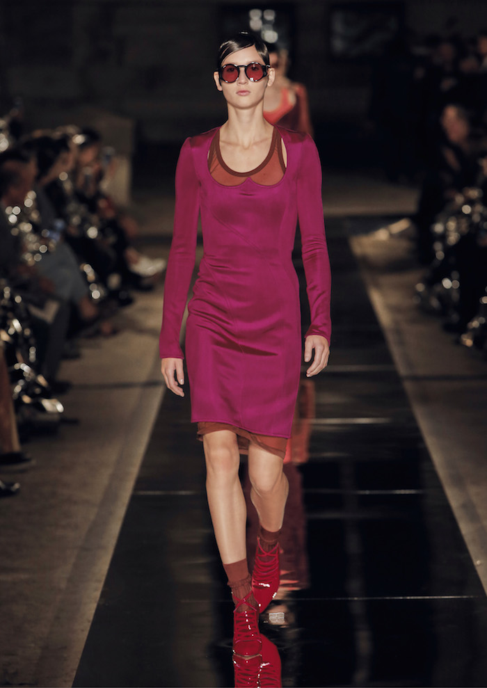華やかなエレクトリックカラーとブラック。対照的な色合わせが印象的なコレクションでは、そのほかに構築的なテーラリングとジャージーやシルクの繊細な素材感を合わせるなど、全体を通してフェミニニティとマスキュリニティの融合が見て取れる。