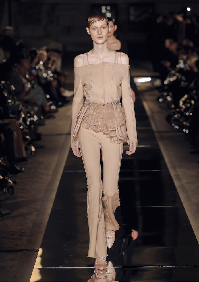 中でもアイコニックなのは、Julia Nobis (ジュリア・ノビス) が着用したルック50。全身をヌードトーンで包み込んだパンツスタイルは、リラックス感のあるファブリックで仕立てられた端正なテーラリングと、スポーツウェアを思わせるペプラムの切り替え、そしてウエスト位置にあしらわれたチュールのラッフル装飾など、ハイブリッドな感性が存分に生かされたキラールックだ。