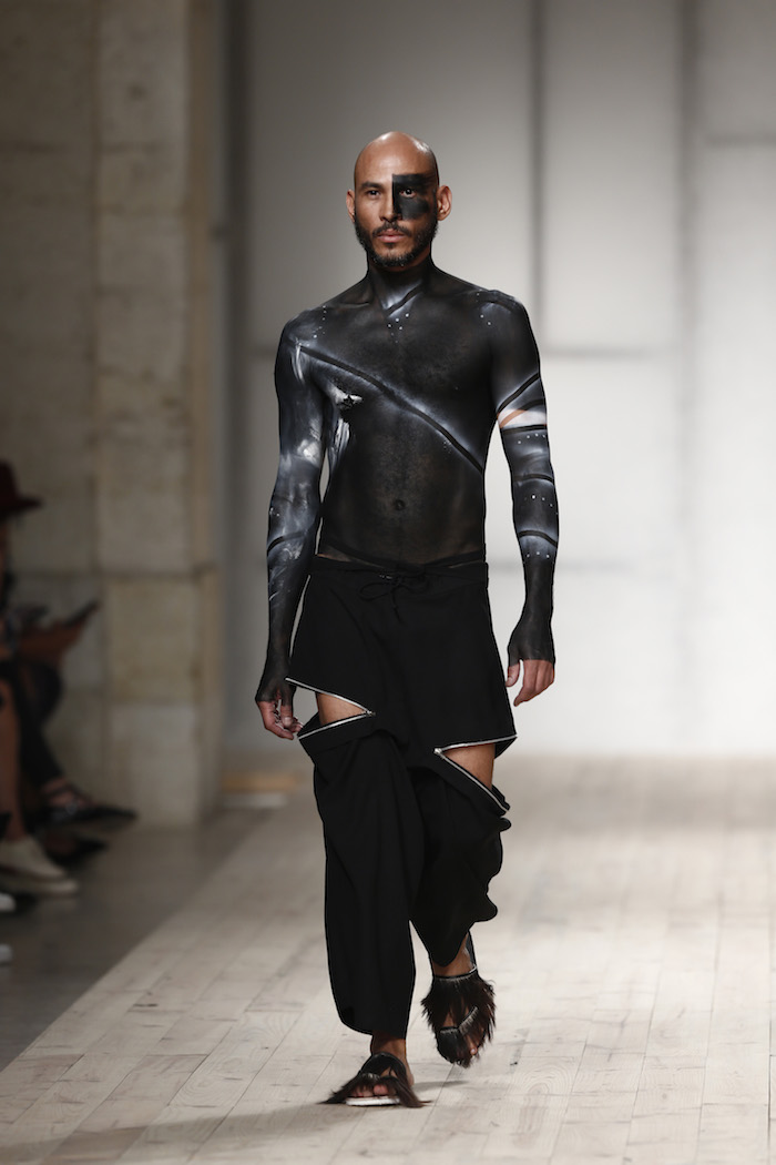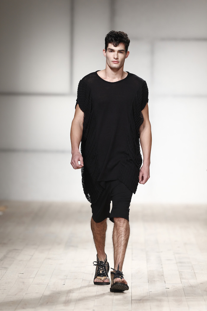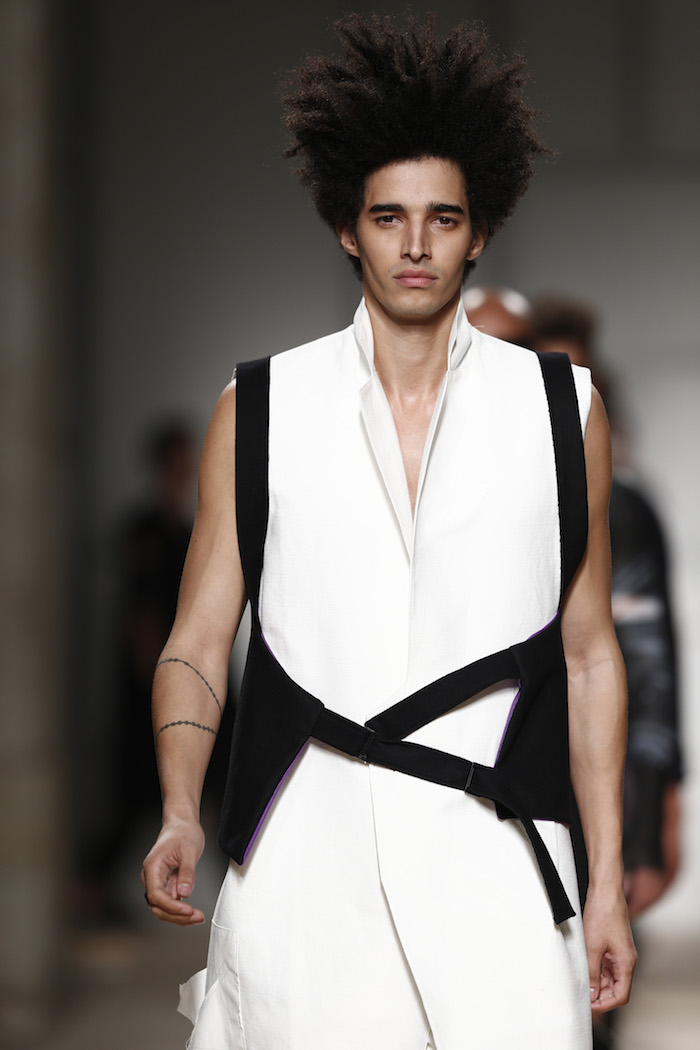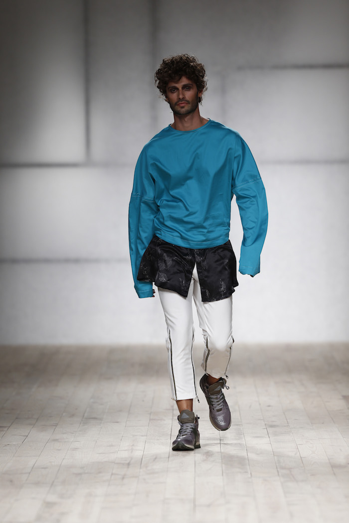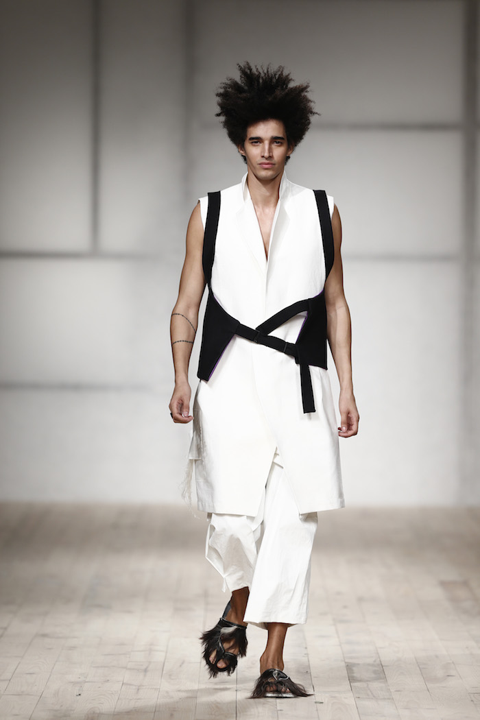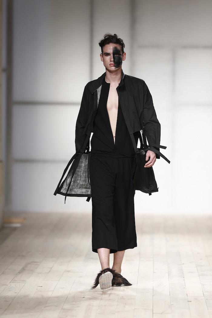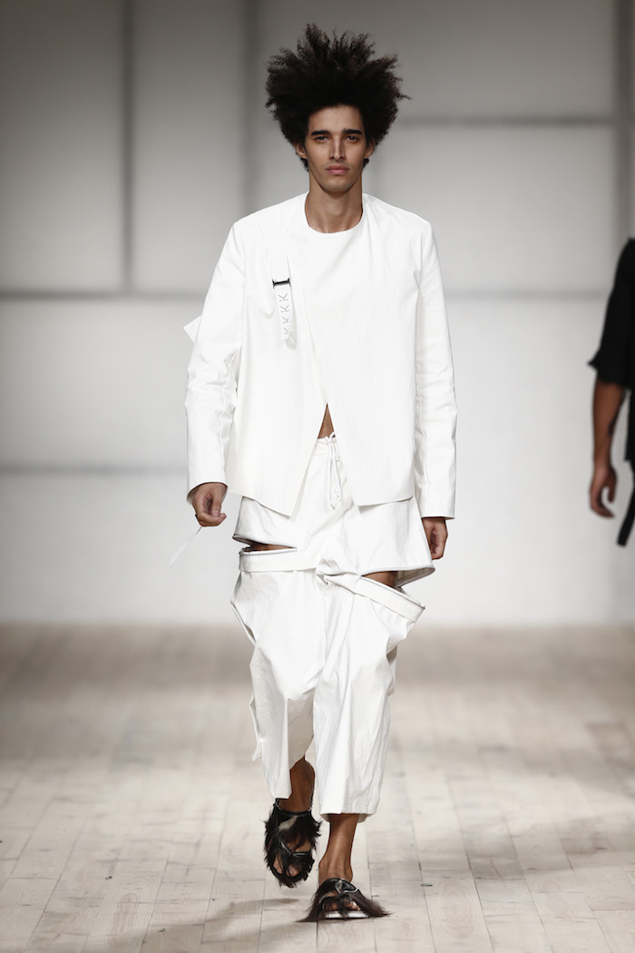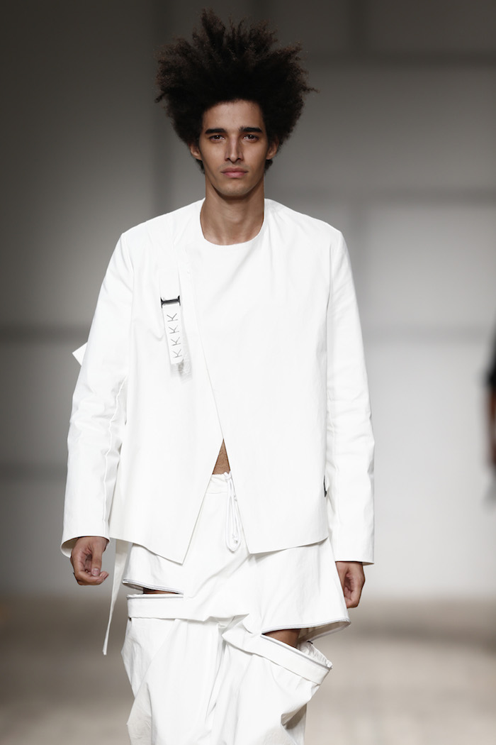 どの国にもローカルセレブリティというものは存在する。しまいには隣の美女が熱烈なフォトコールを受けるのを見ながら「この人は誰なんだろう」と考える始末。しかしポルトガルにもインターナショナルセレブリティはいる。その中の一人が、メンズモデルの Luis Borges (ルイズ・ボルジェス)。個性的なアフロヘアと彫刻のような端正な顔立ちで、世界中のランウェイに引っ張りだこのイットボーイは、ポルトガルファッションシーンのスーパースターだ。彼がランウェイで歩いたブランドのひとつ Kolovrat (コロヴラット) は、今季スケジュールの中でも印象に残ったメンズブランド。テーラリングをモダンに解釈したミニマルスタイルには、オリエンタルなキモノシルエットやパンクテイストのディティールなどが取り入れられ、そのまま東京のストリートキッズにも似合うのではないかと想像を膨らませられた。