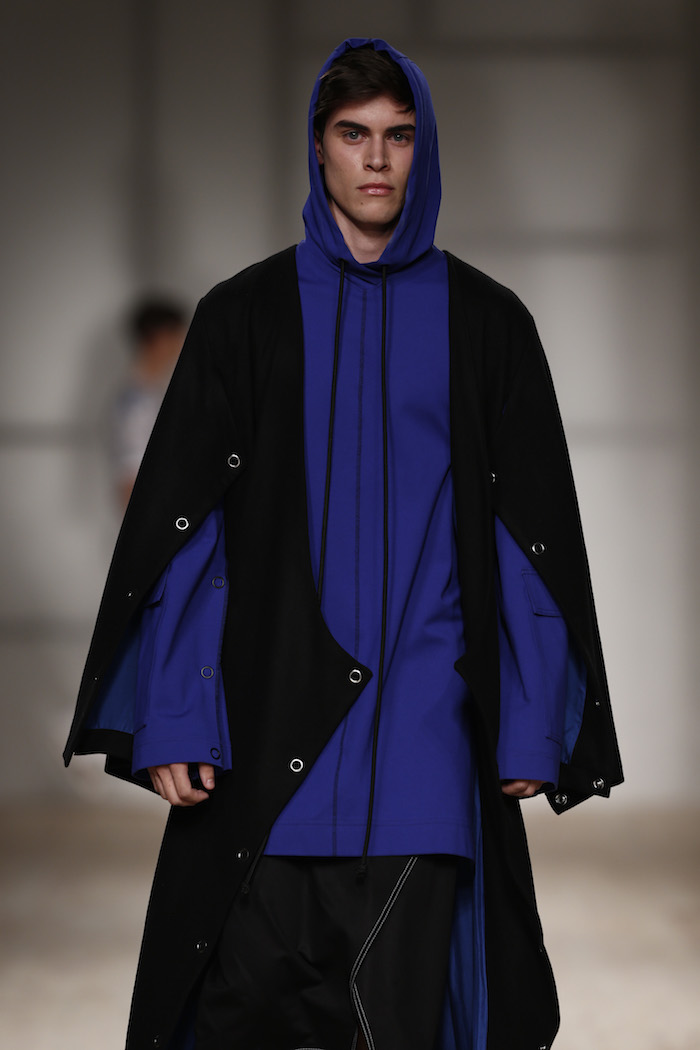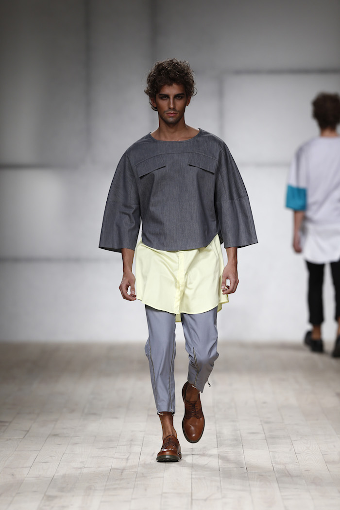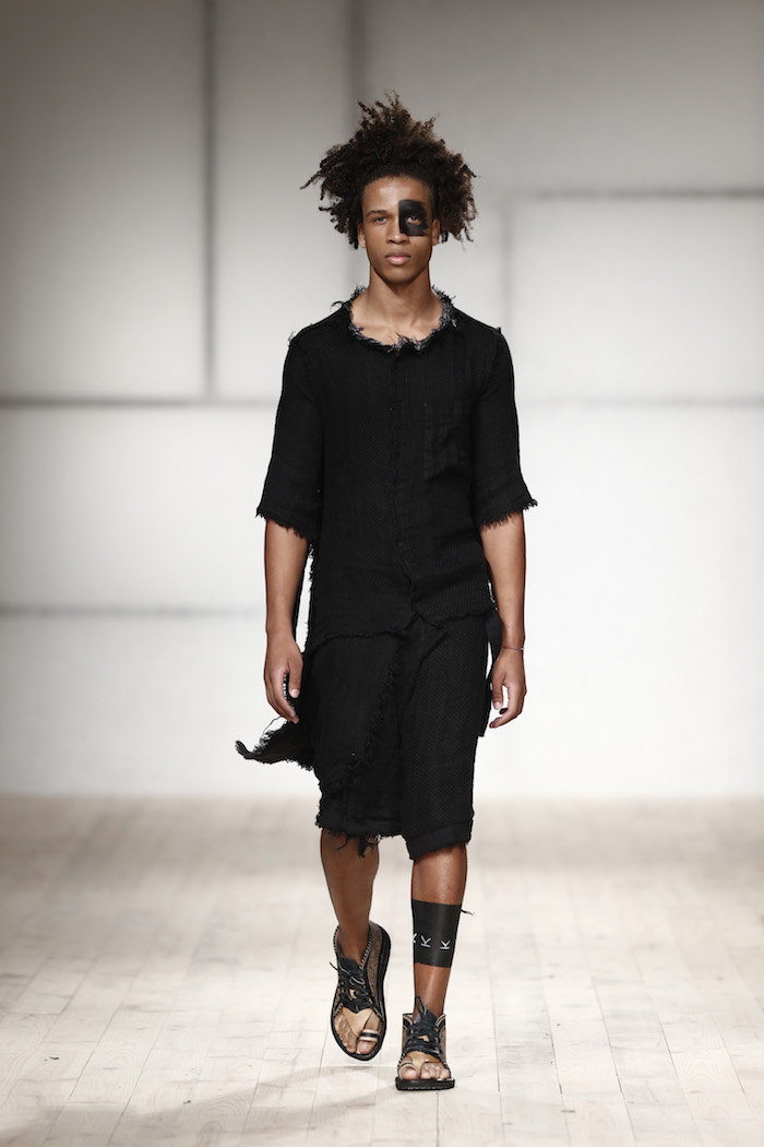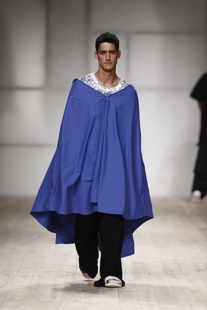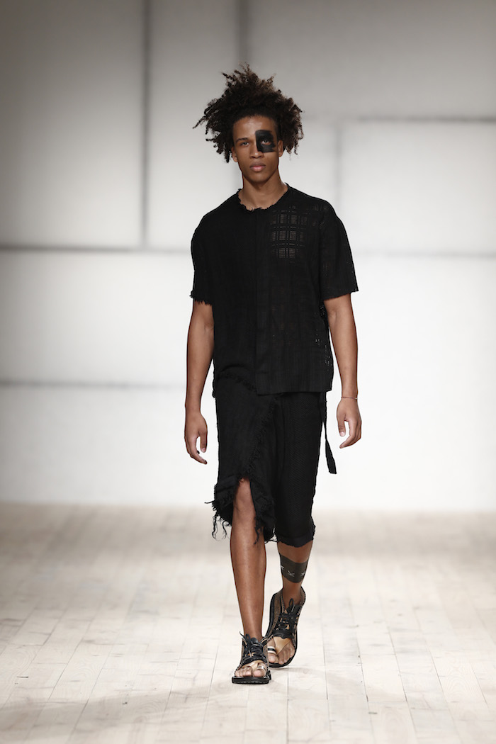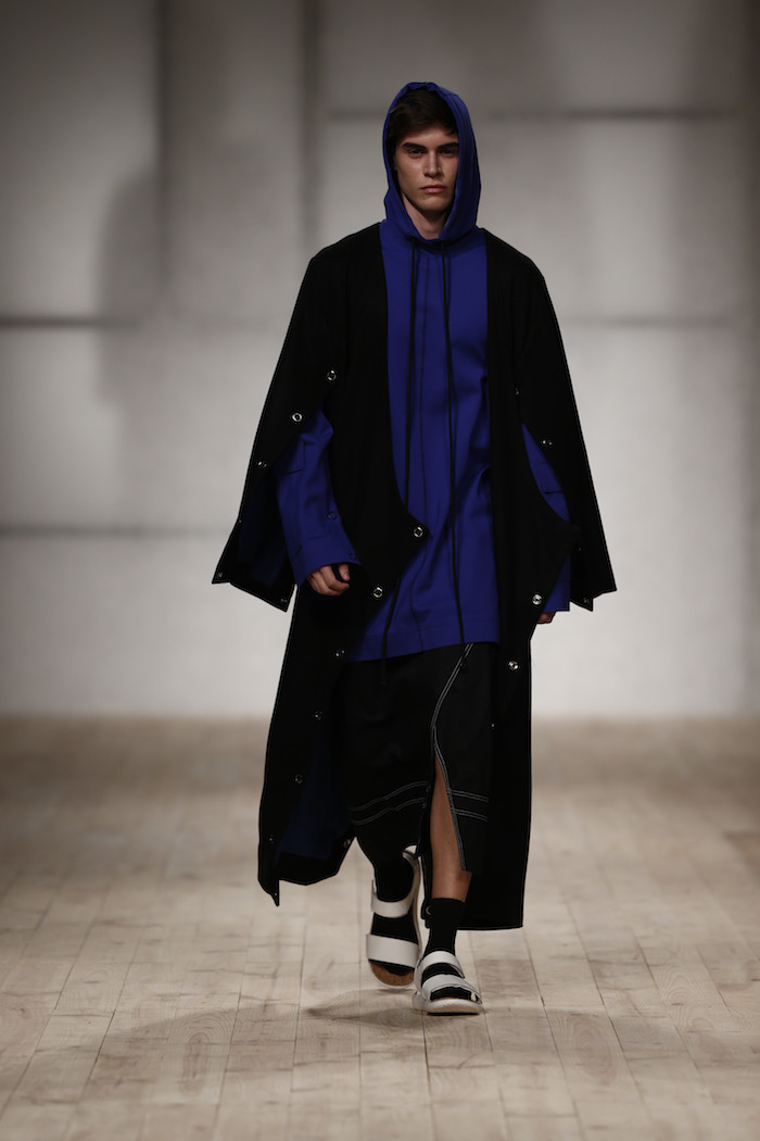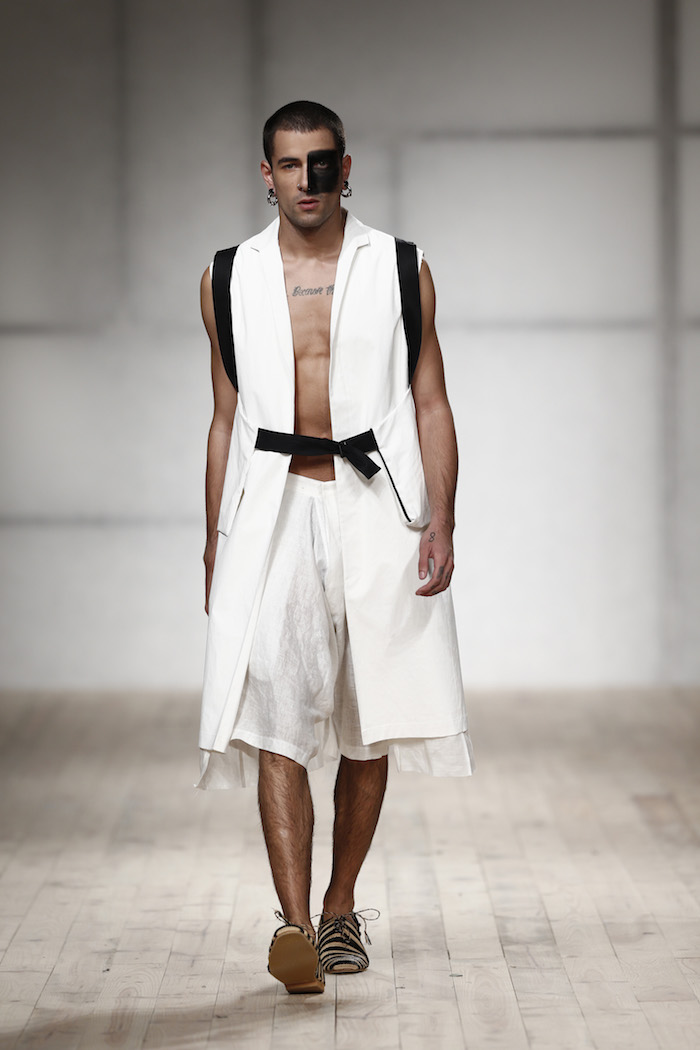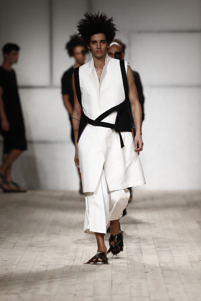 どの国にもローカルセレブリティというものは存在する。しまいには隣の美女が熱烈なフォトコールを受けるのを見ながら「この人は誰なんだろう」と考える始末。しかしポルトガルにもインターナショナルセレブリティはいる。その中の一人が、メンズモデルの Luis Borges (ルイズ・ボルジェス)。個性的なアフロヘアと彫刻のような端正な顔立ちで、世界中のランウェイに引っ張りだこのイットボーイは、ポルトガルファッションシーンのスーパースターだ。彼がランウェイで歩いたブランドのひとつ Kolovrat (コロヴラット) は、今季スケジュールの中でも印象に残ったメンズブランド。テーラリングをモダンに解釈したミニマルスタイルには、オリエンタルなキモノシルエットやパンクテイストのディティールなどが取り入れられ、そのまま東京のストリートキッズにも似合うのではないかと想像を膨らませられた。