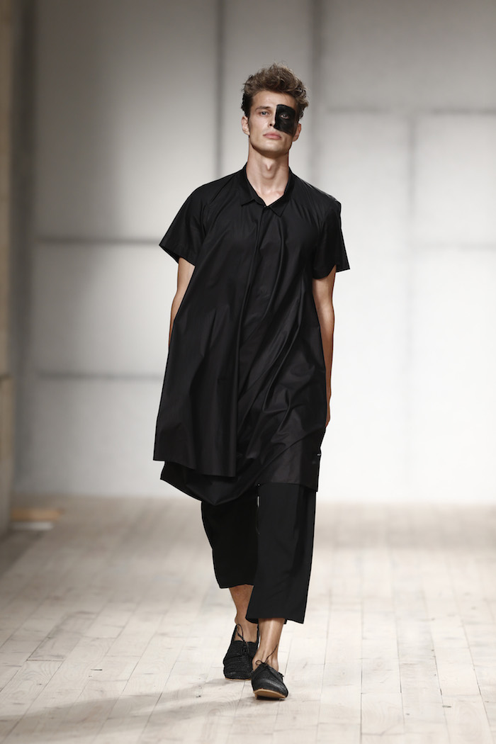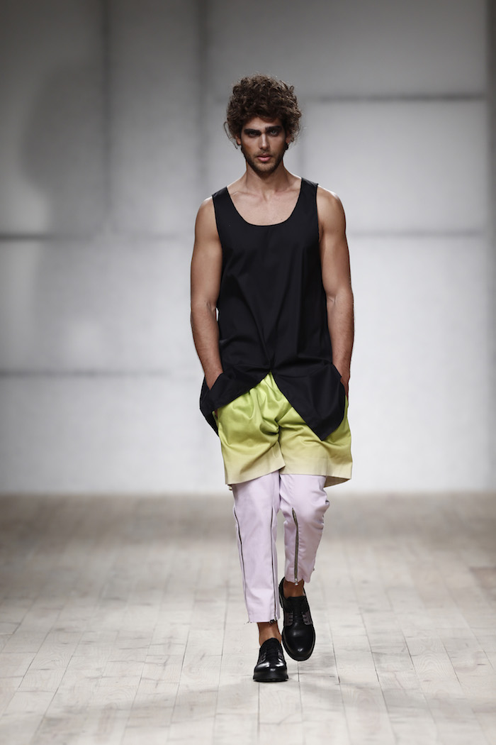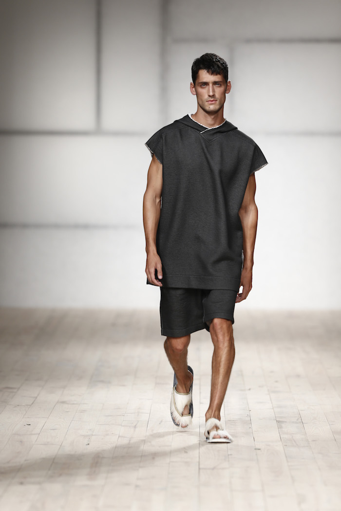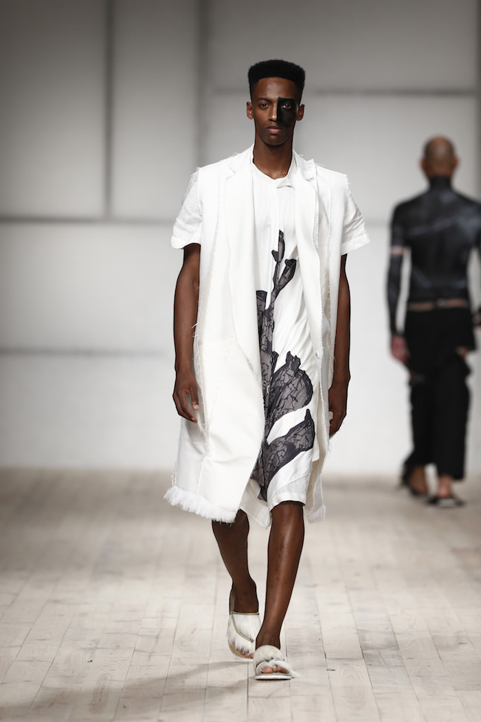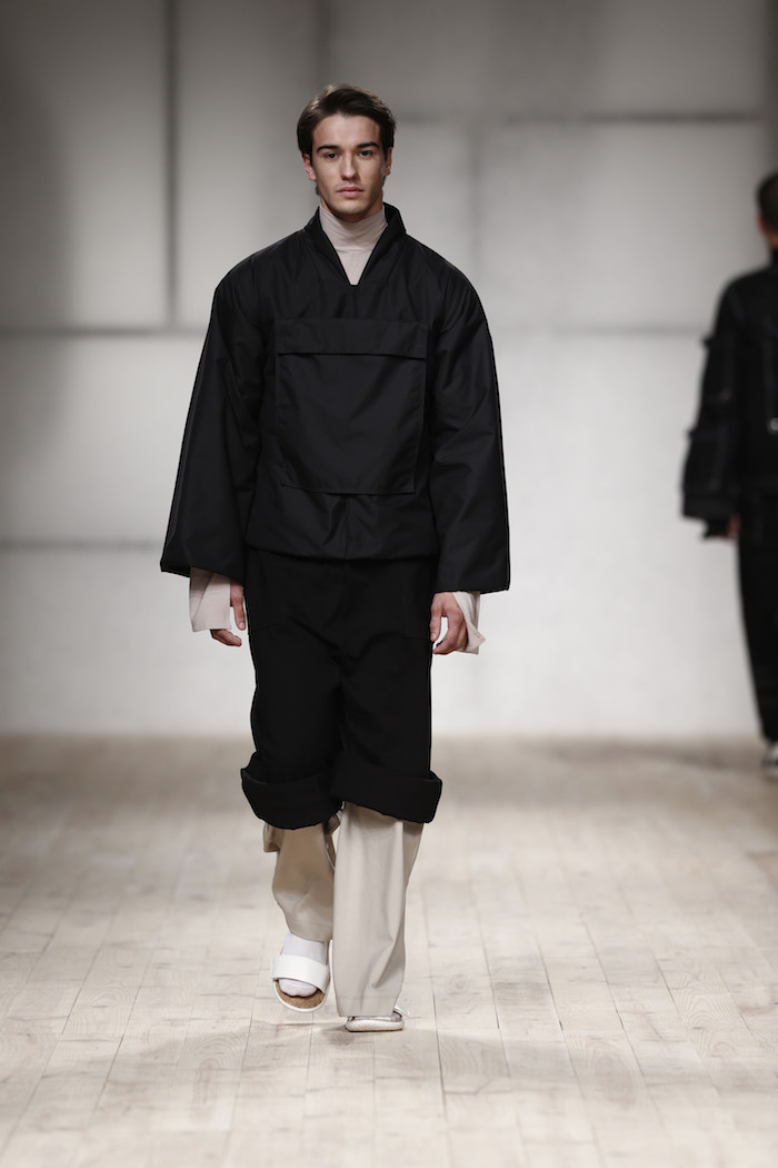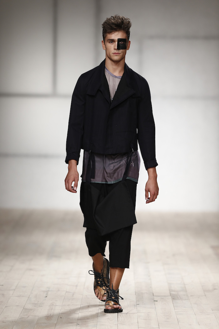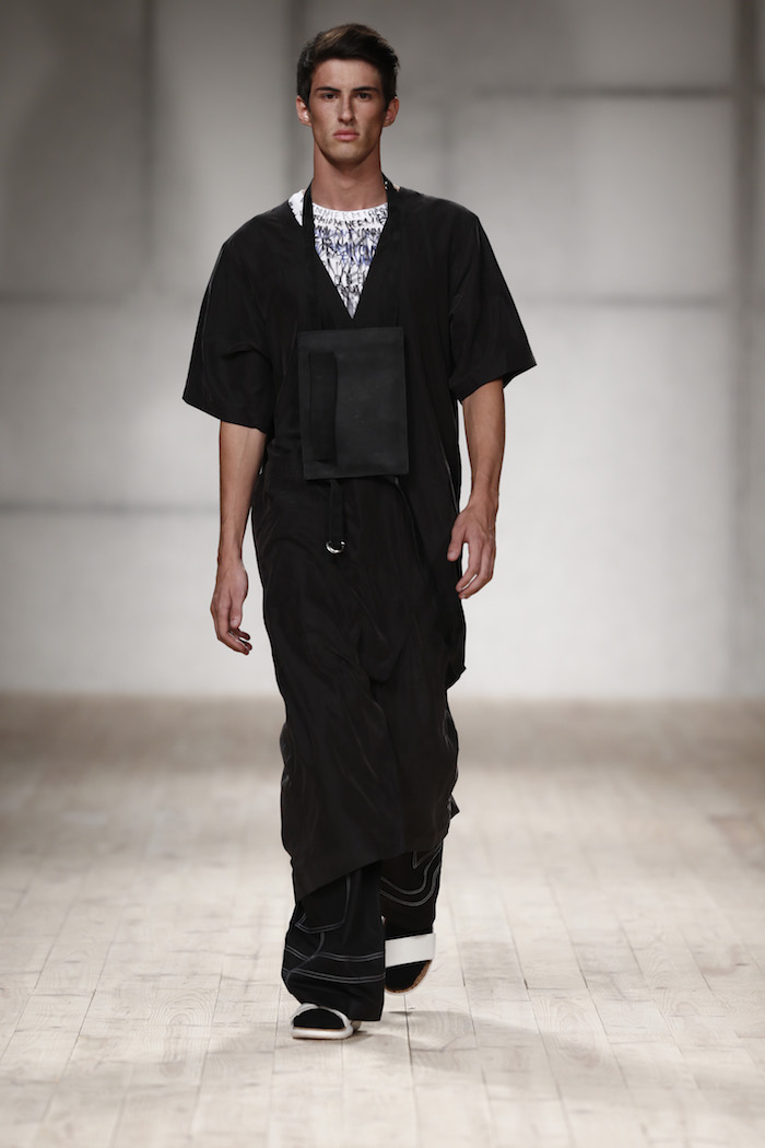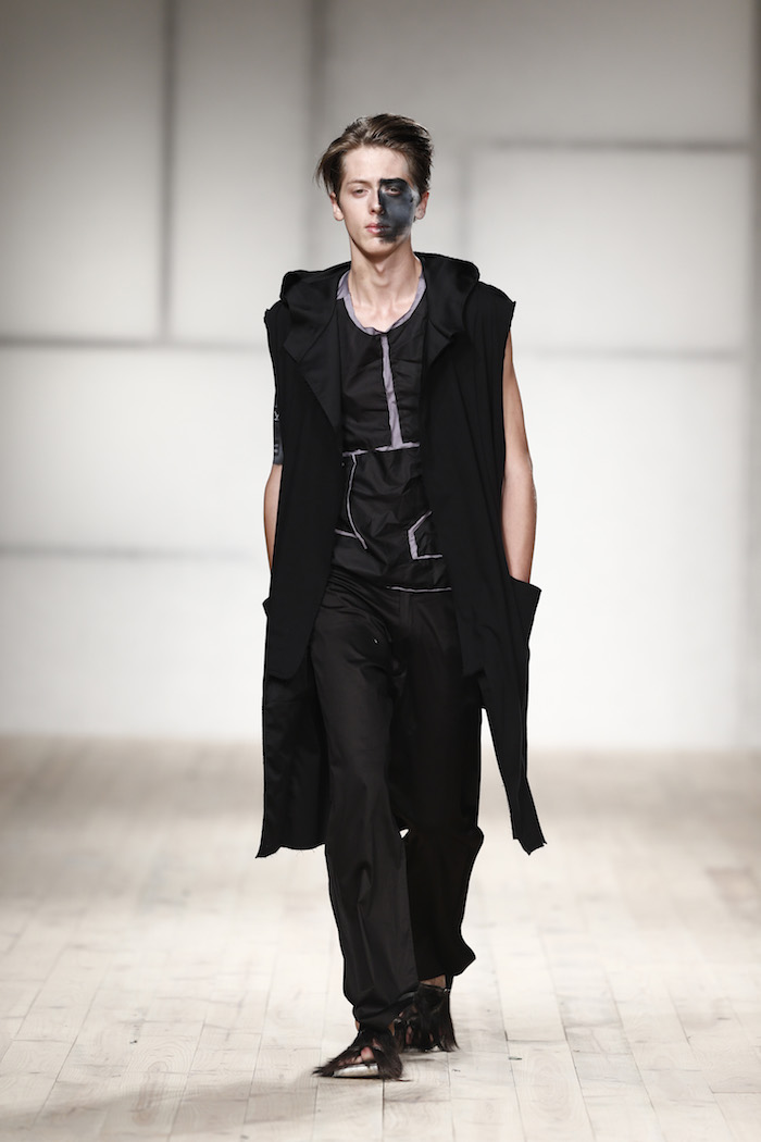 どの国にもローカルセレブリティというものは存在する。しまいには隣の美女が熱烈なフォトコールを受けるのを見ながら「この人は誰なんだろう」と考える始末。しかしポルトガルにもインターナショナルセレブリティはいる。その中の一人が、メンズモデルの Luis Borges (ルイズ・ボルジェス)。個性的なアフロヘアと彫刻のような端正な顔立ちで、世界中のランウェイに引っ張りだこのイットボーイは、ポルトガルファッションシーンのスーパースターだ。彼がランウェイで歩いたブランドのひとつ Kolovrat (コロヴラット) は、今季スケジュールの中でも印象に残ったメンズブランド。テーラリングをモダンに解釈したミニマルスタイルには、オリエンタルなキモノシルエットやパンクテイストのディティールなどが取り入れられ、そのまま東京のストリートキッズにも似合うのではないかと想像を膨らませられた。