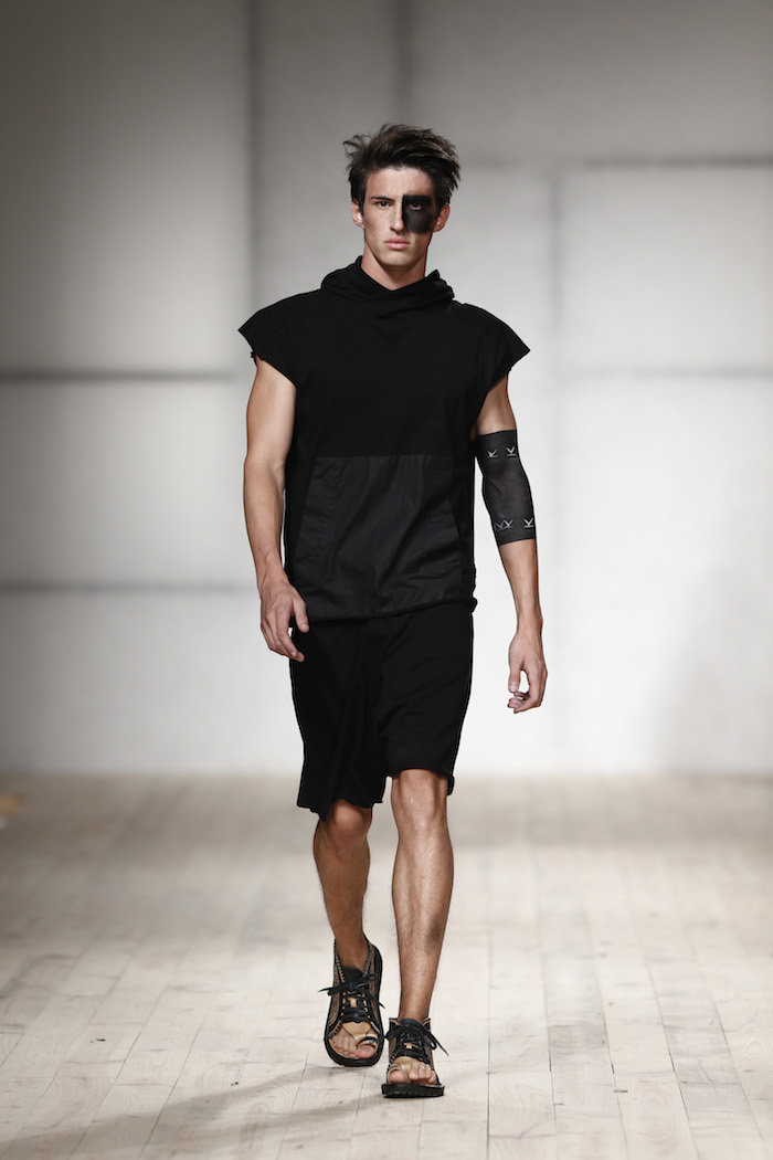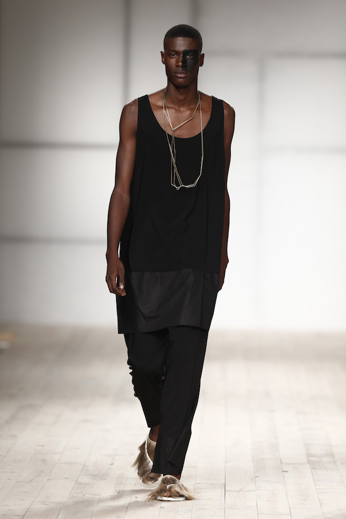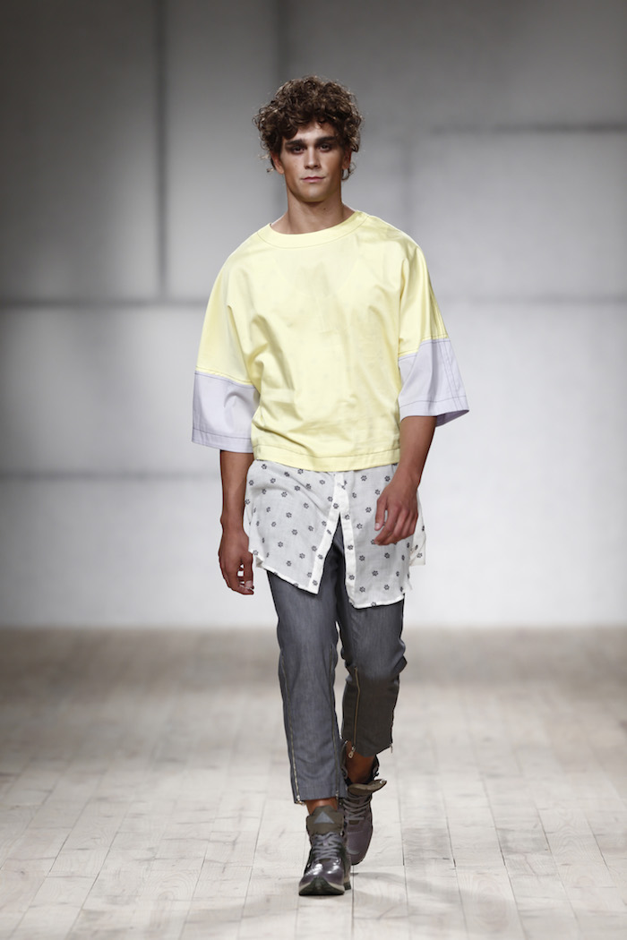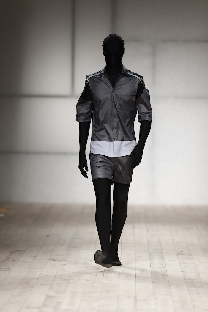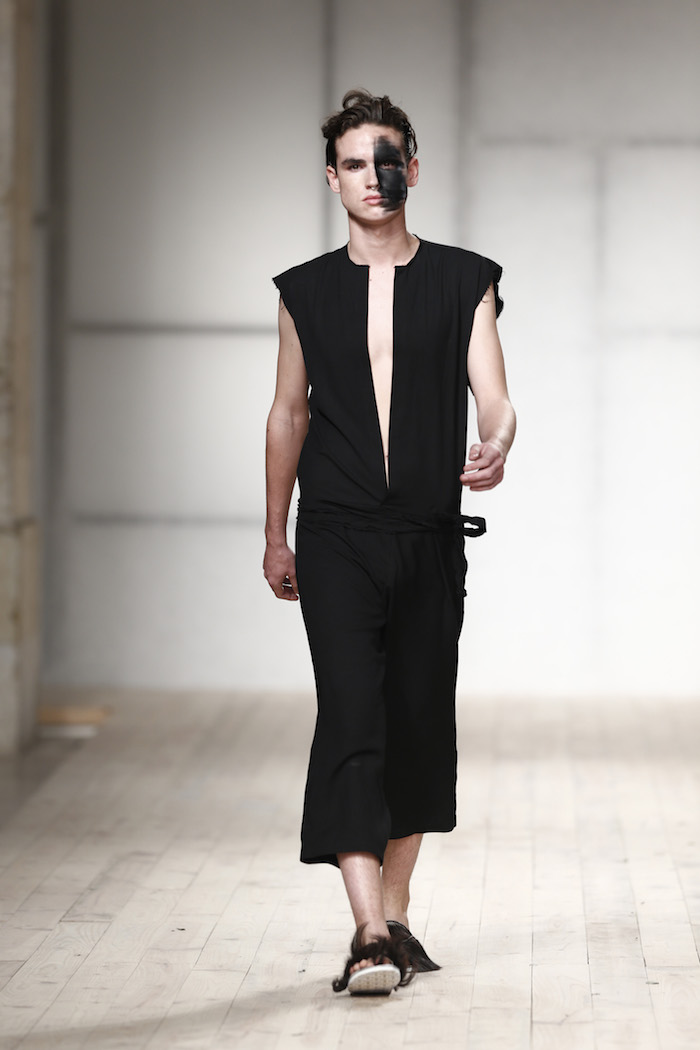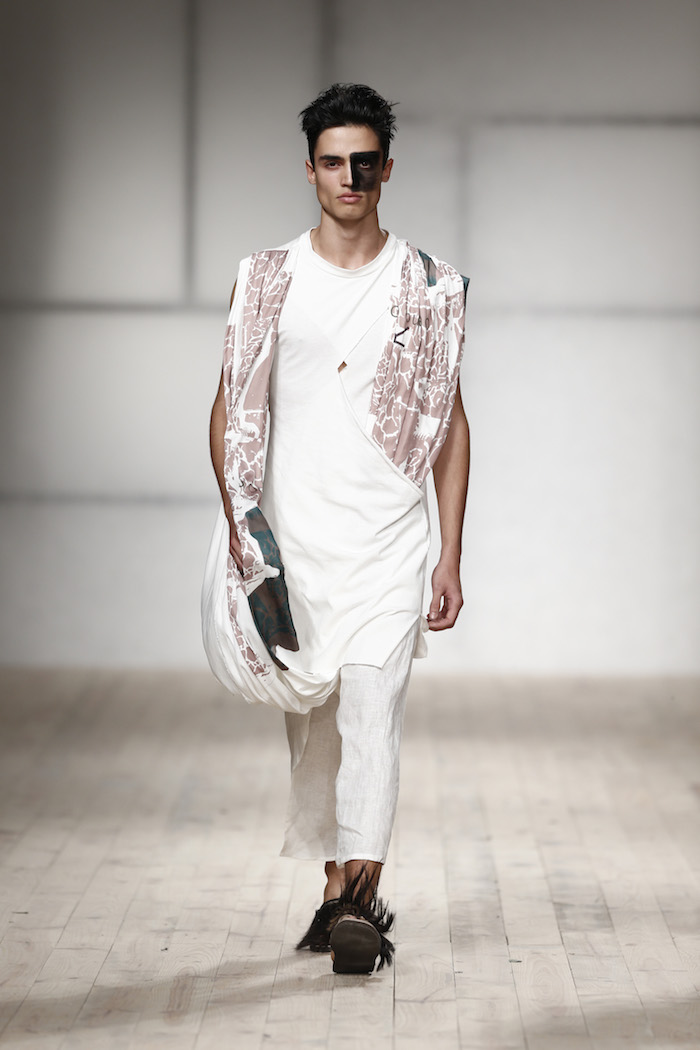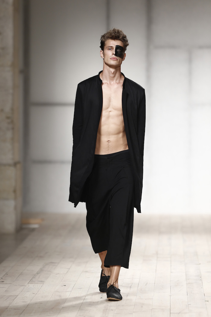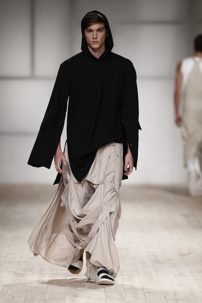 どの国にもローカルセレブリティというものは存在する。しまいには隣の美女が熱烈なフォトコールを受けるのを見ながら「この人は誰なんだろう」と考える始末。しかしポルトガルにもインターナショナルセレブリティはいる。その中の一人が、メンズモデルの Luis Borges (ルイズ・ボルジェス)。個性的なアフロヘアと彫刻のような端正な顔立ちで、世界中のランウェイに引っ張りだこのイットボーイは、ポルトガルファッションシーンのスーパースターだ。彼がランウェイで歩いたブランドのひとつ Kolovrat (コロヴラット) は、今季スケジュールの中でも印象に残ったメンズブランド。テーラリングをモダンに解釈したミニマルスタイルには、オリエンタルなキモノシルエットやパンクテイストのディティールなどが取り入れられ、そのまま東京のストリートキッズにも似合うのではないかと想像を膨らませられた。