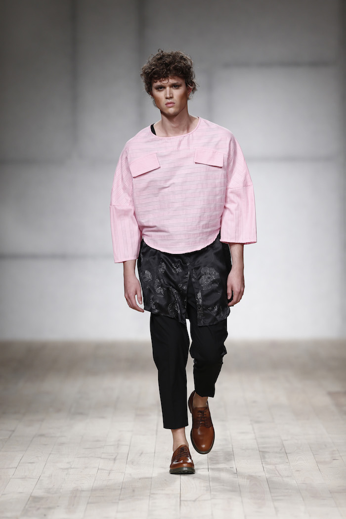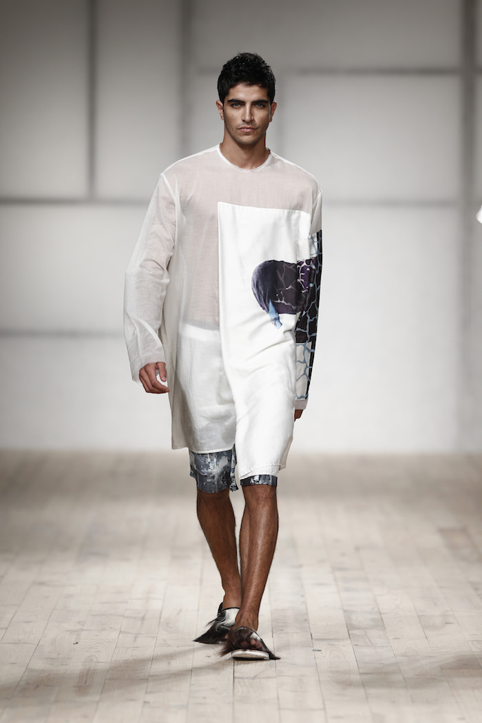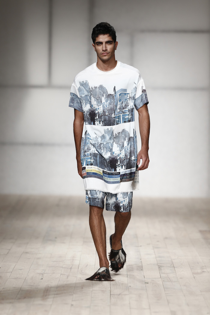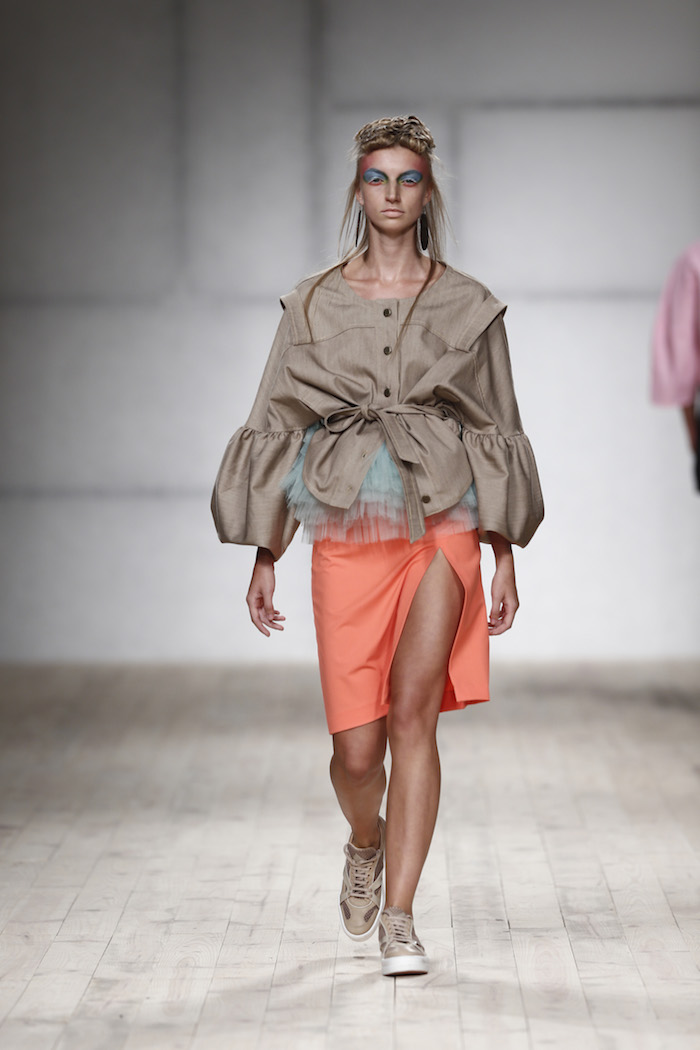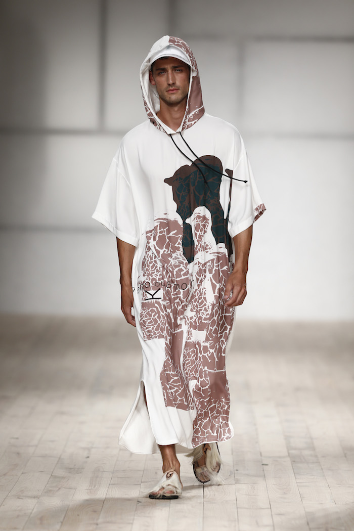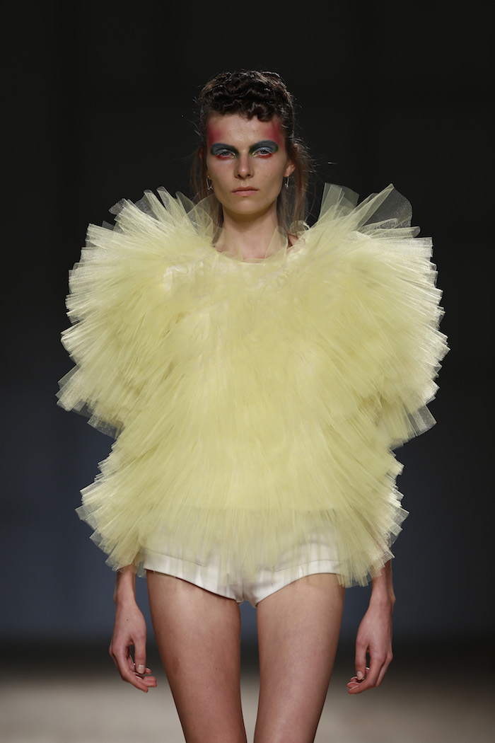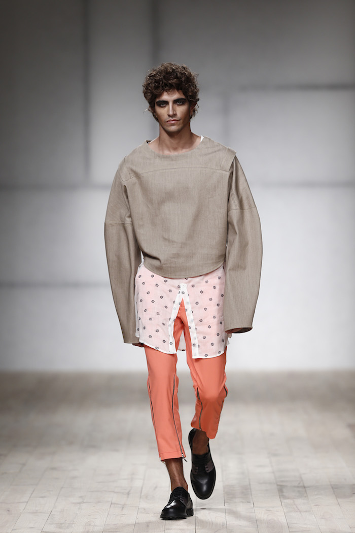 東コレに同じく、ポルトガルのファッションウィークはメンズが強い。ウィメンズウェアといえば「誰が着るの?」と聞きたくなるようなコスチュームや、「これランウェイショーで見せる必要ある?」と疑問に思うような退屈なリアルクローズばかりが目につく一方で、メンズウェアは比較的リアリティがありながらクリエイティブとの両立で成功しているケースが多く見受けられた。その代表的な例が、Dino Alves (ディーノ・アルヴェス)。ポルトガルの漁村、アナディアに生を受けた Dino Alves (ディーノ・アルヴェス) は「リスボン・ファッションウィーク」でもよく知られた中堅デザイナーだ。今季2017年春夏コレクションでは、チュールを幾多にも重ねたコンセプチュアルなウィメンズウェア、そしてポップな色使いとオーバーシルエットが印象的なメンズウェアを発表。フィナーレでは砂をかぶったモデルが登場し、異国情緒溢れるストーリーを完成させた。