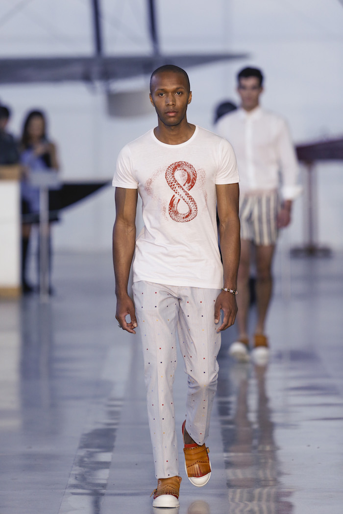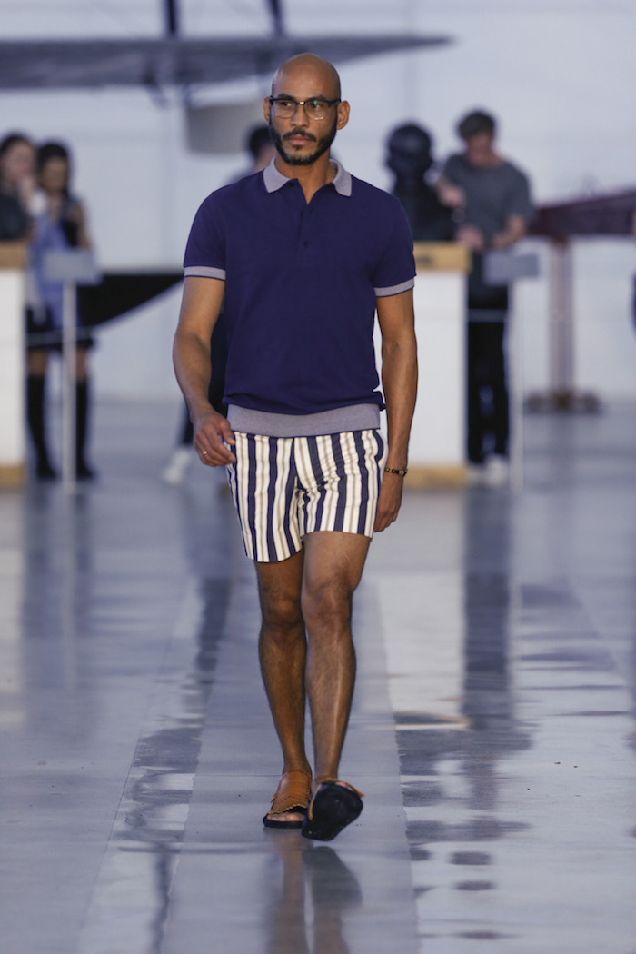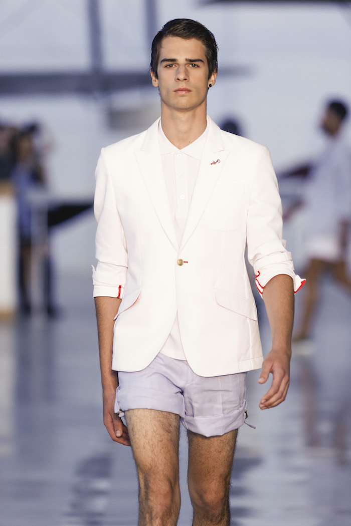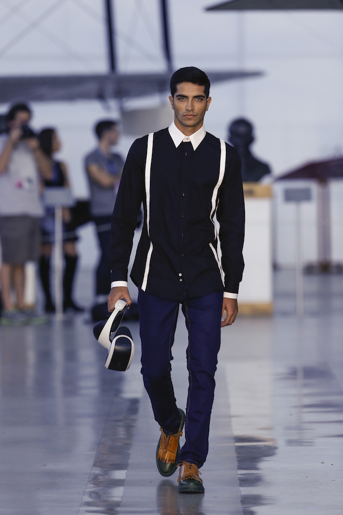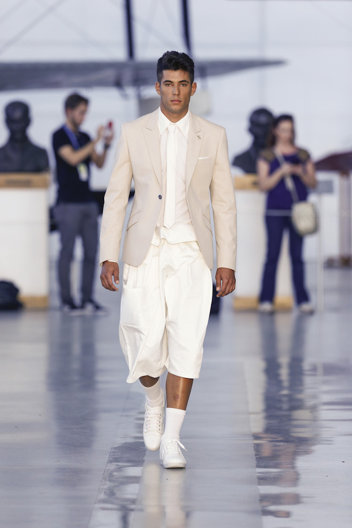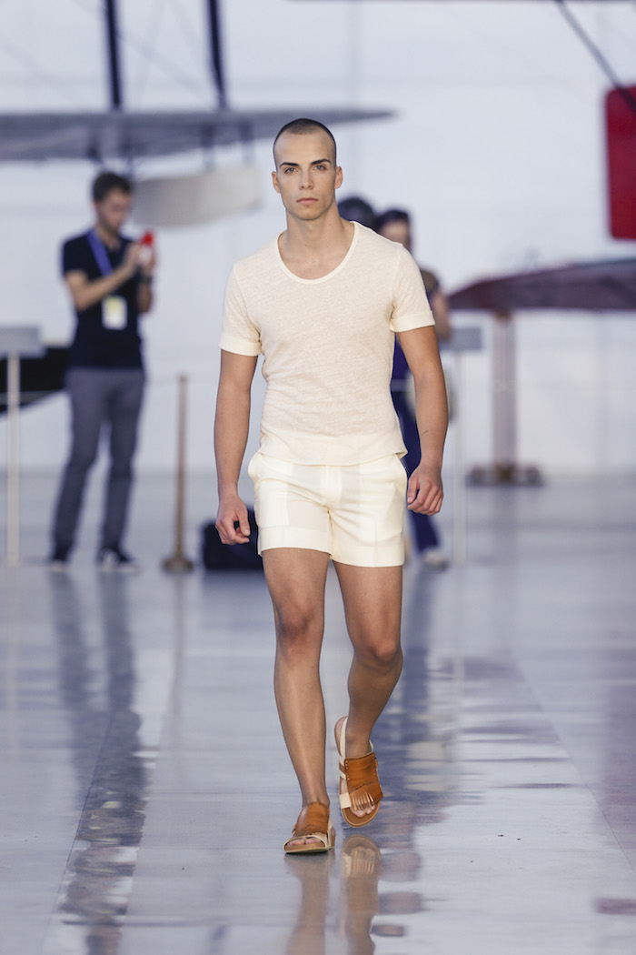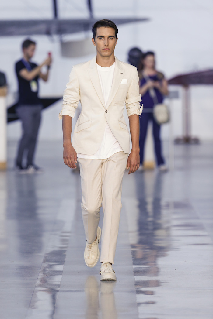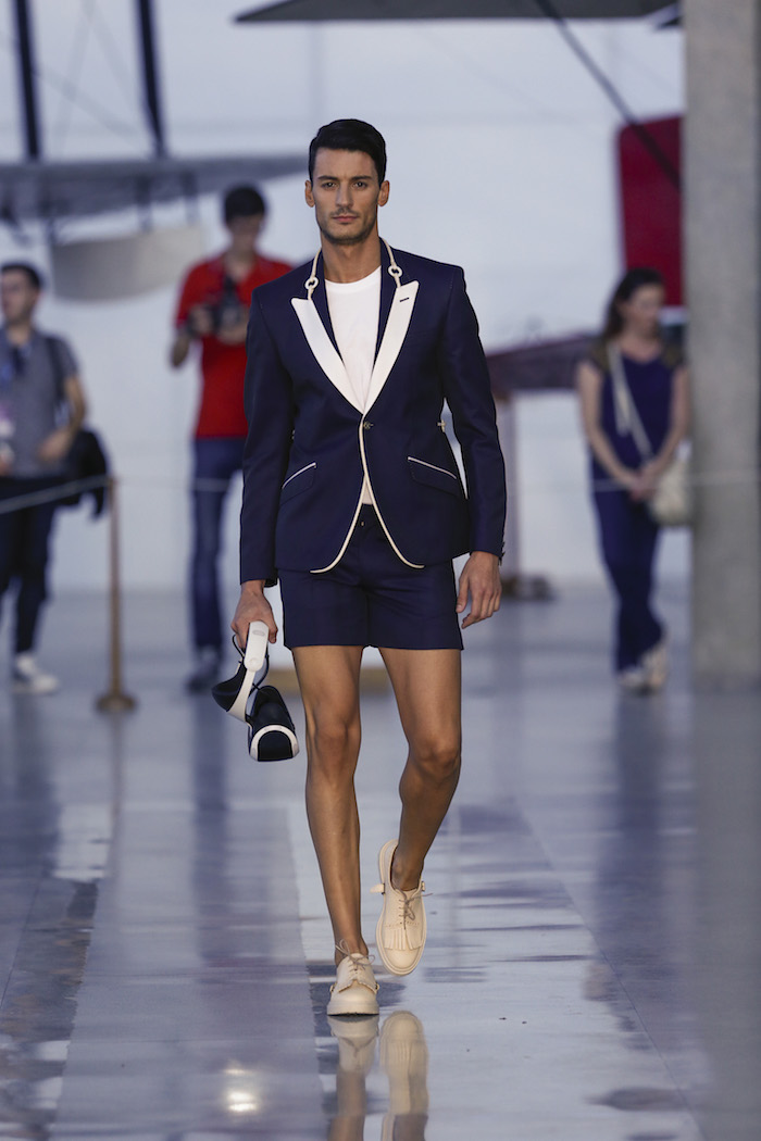 聞くところによると、ポルトガルのファッションシーンきっての実力派メンズウェアデザイナーだという。デザイナーの名前は Nuno Gama (ヌノ・ガマ)。今季コレクションの会場には、リスボン中心地に構える国営施設 Museu de Marinha (海洋博物館) が選ばれた。ルネサンスの古き良き時代を思わせる船舶がところ狭しと陳列されたランウェイで登場したのは、テーラリングをベースにしたマリンルック。中には「南蛮渡来」の趣を感じさせるオリエンタルな意匠が取りれられたルックも登場し、古くから貿易産業で栄えたポルトガルの文化的背景が垣間見えるラインナップとなった。ポルトガルらしいこんがり焼けたテラコッタスキンに隆々しい筋肉質のモデル。それをさらに際立たせるようなタイトなサイジングとマイクロミニのショーツ。日本ではなかなか見られないような、蛍光色にも見えるほど真っ白なシャツに強烈なタンジェリンオレンジのコントラスト。プレス向けの室内のショーに次いで、外の庭園で行われた一般の観客向けのショーが終わるころには、あまりの熱気に軽く目眩がするほどだった。これは気候によるものか、はたまたお色気モデルによるものか。