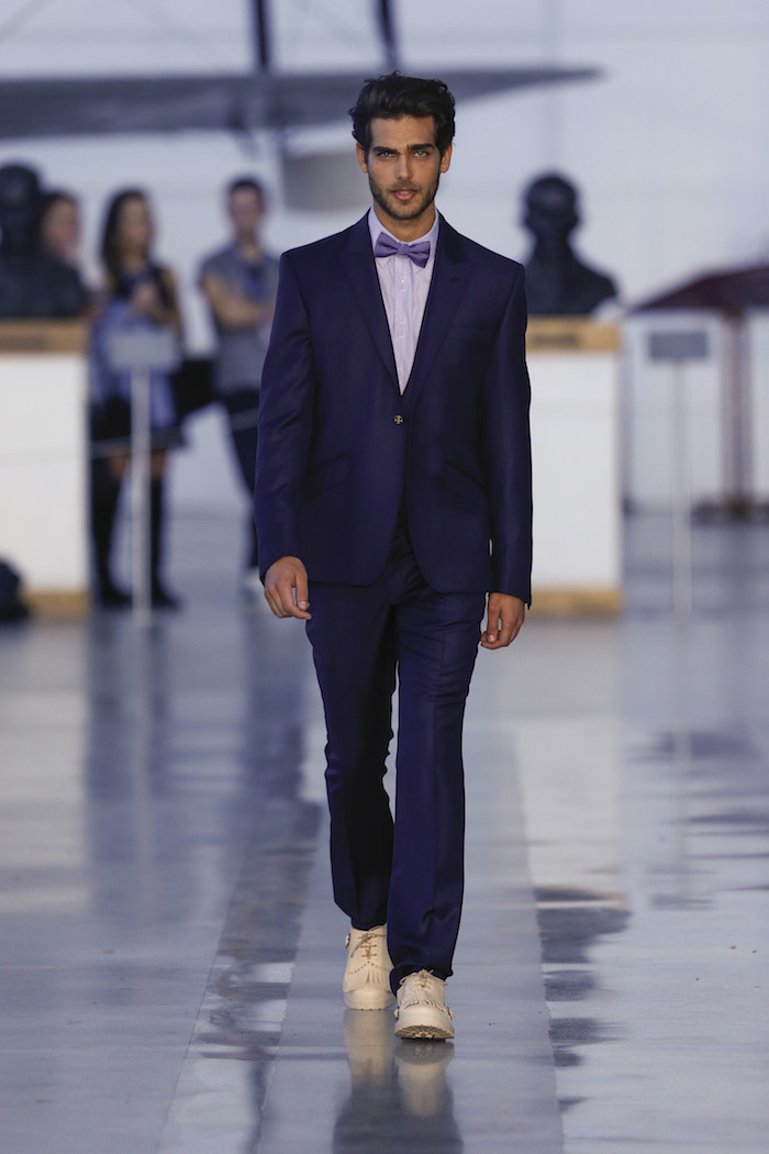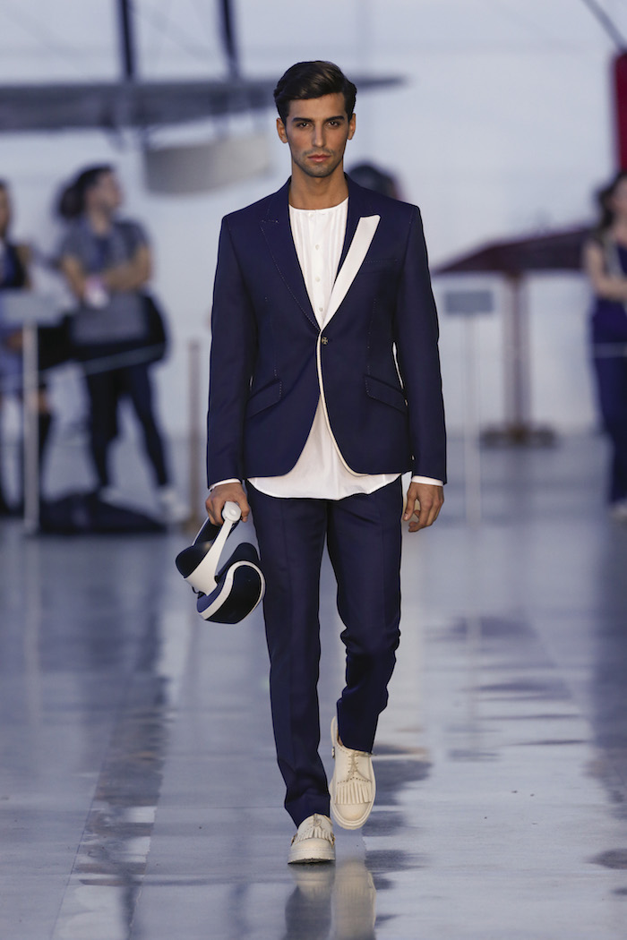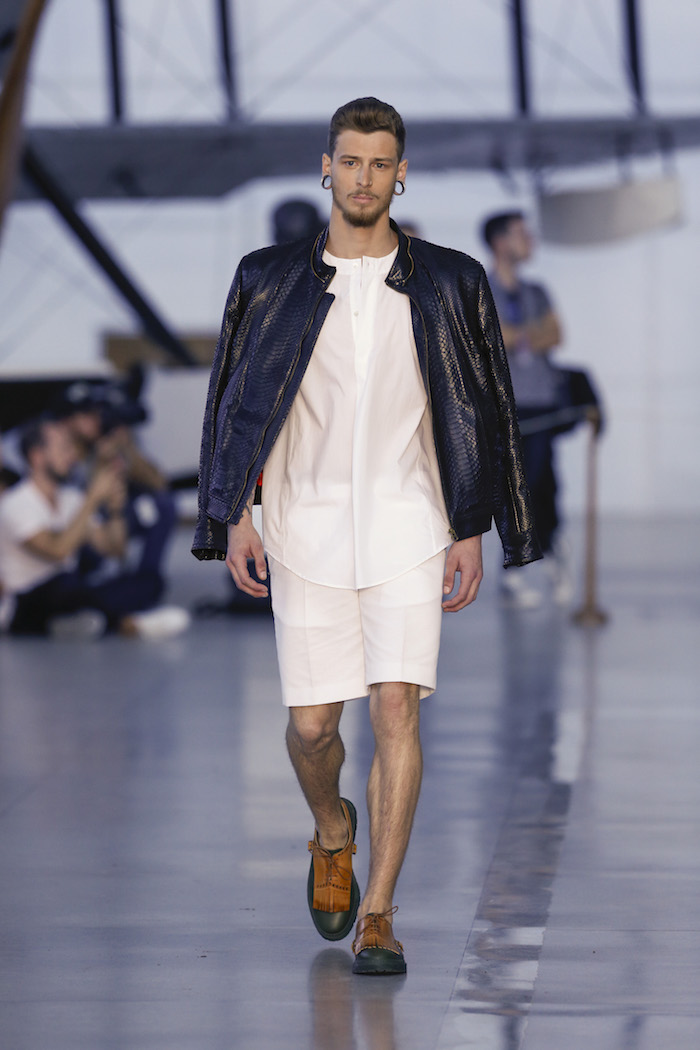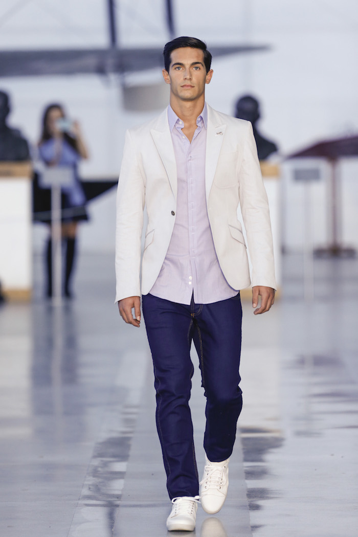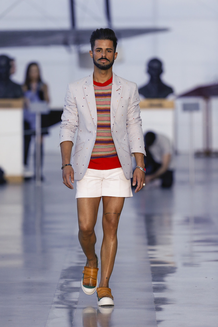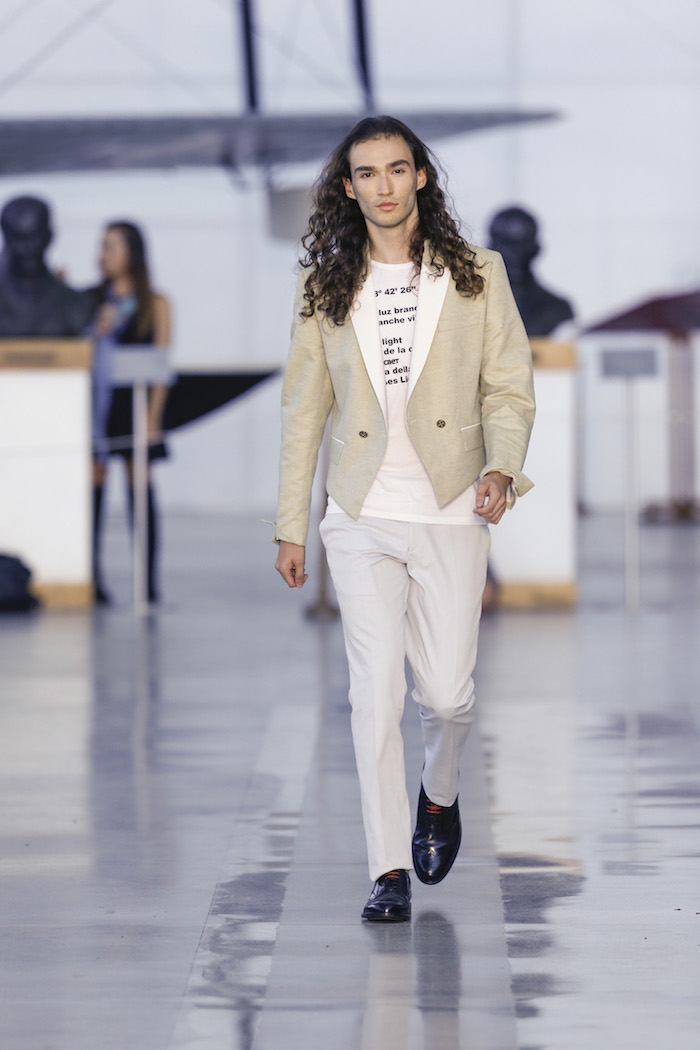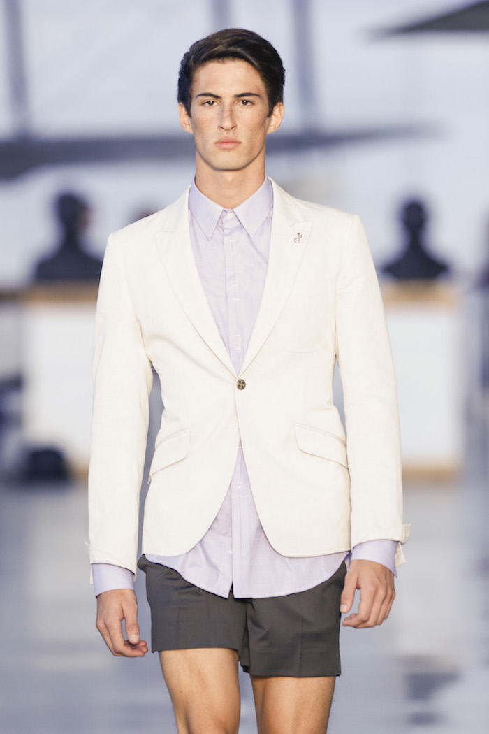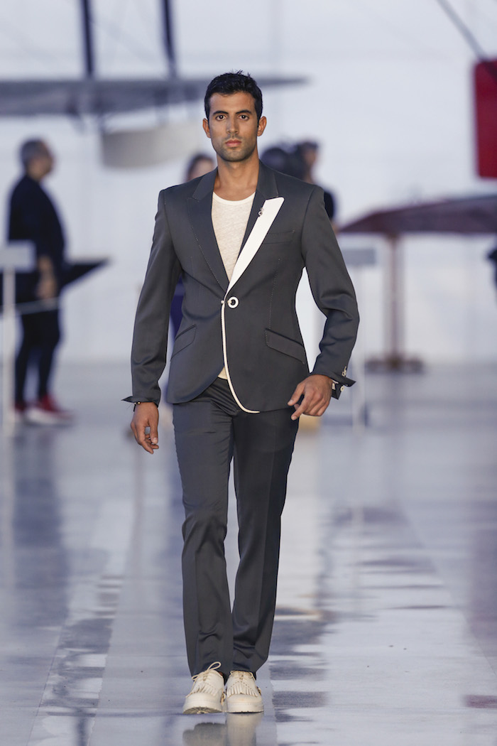 聞くところによると、ポルトガルのファッションシーンきっての実力派メンズウェアデザイナーだという。デザイナーの名前は Nuno Gama (ヌノ・ガマ)。今季コレクションの会場には、リスボン中心地に構える国営施設 Museu de Marinha (海洋博物館) が選ばれた。ルネサンスの古き良き時代を思わせる船舶がところ狭しと陳列されたランウェイで登場したのは、テーラリングをベースにしたマリンルック。中には「南蛮渡来」の趣を感じさせるオリエンタルな意匠が取りれられたルックも登場し、古くから貿易産業で栄えたポルトガルの文化的背景が垣間見えるラインナップとなった。ポルトガルらしいこんがり焼けたテラコッタスキンに隆々しい筋肉質のモデル。それをさらに際立たせるようなタイトなサイジングとマイクロミニのショーツ。日本ではなかなか見られないような、蛍光色にも見えるほど真っ白なシャツに強烈なタンジェリンオレンジのコントラスト。プレス向けの室内のショーに次いで、外の庭園で行われた一般の観客向けのショーが終わるころには、あまりの熱気に軽く目眩がするほどだった。これは気候によるものか、はたまたお色気モデルによるものか。