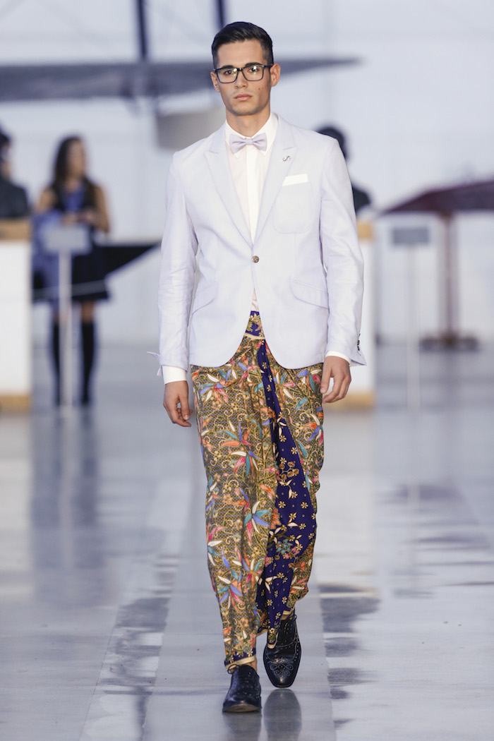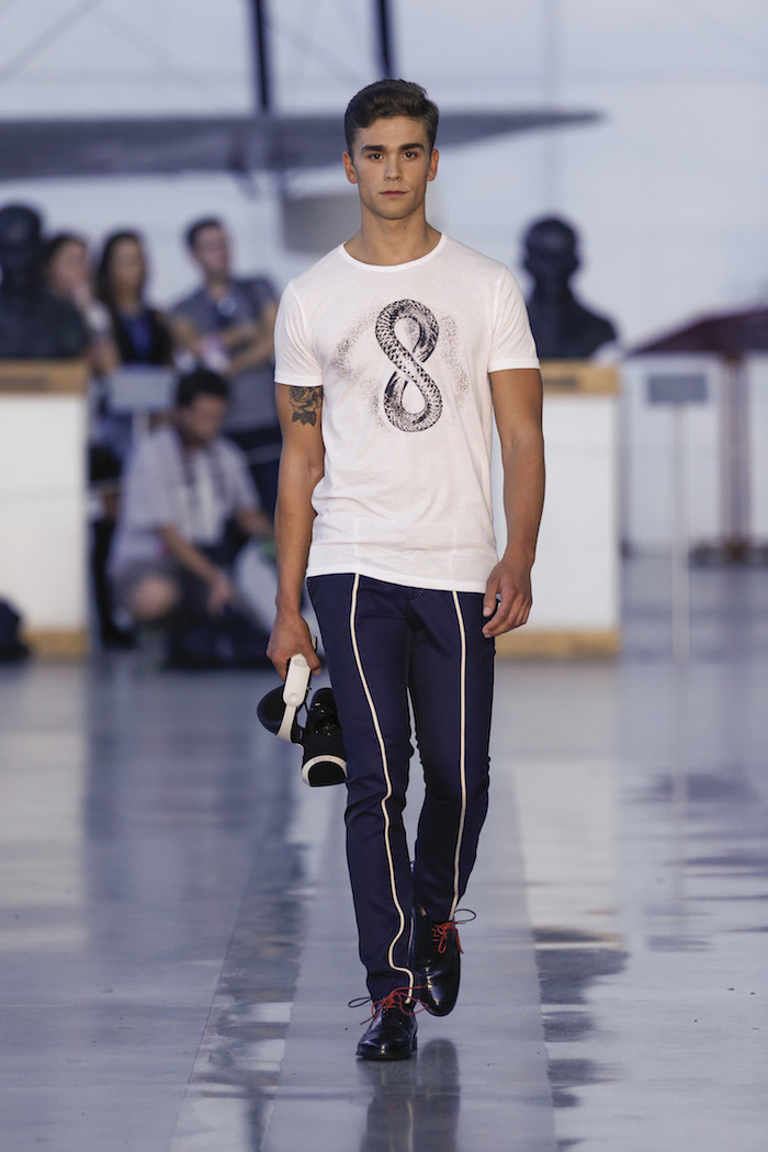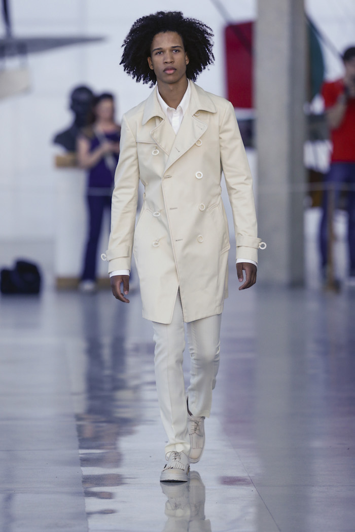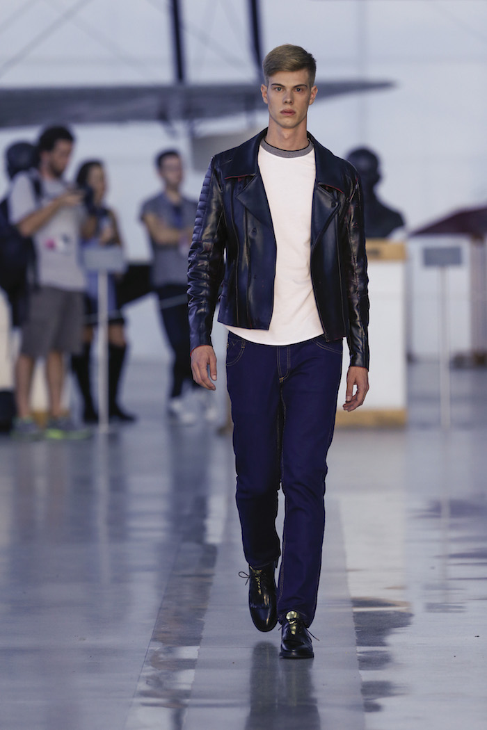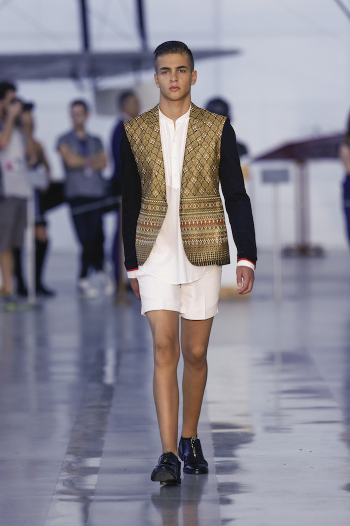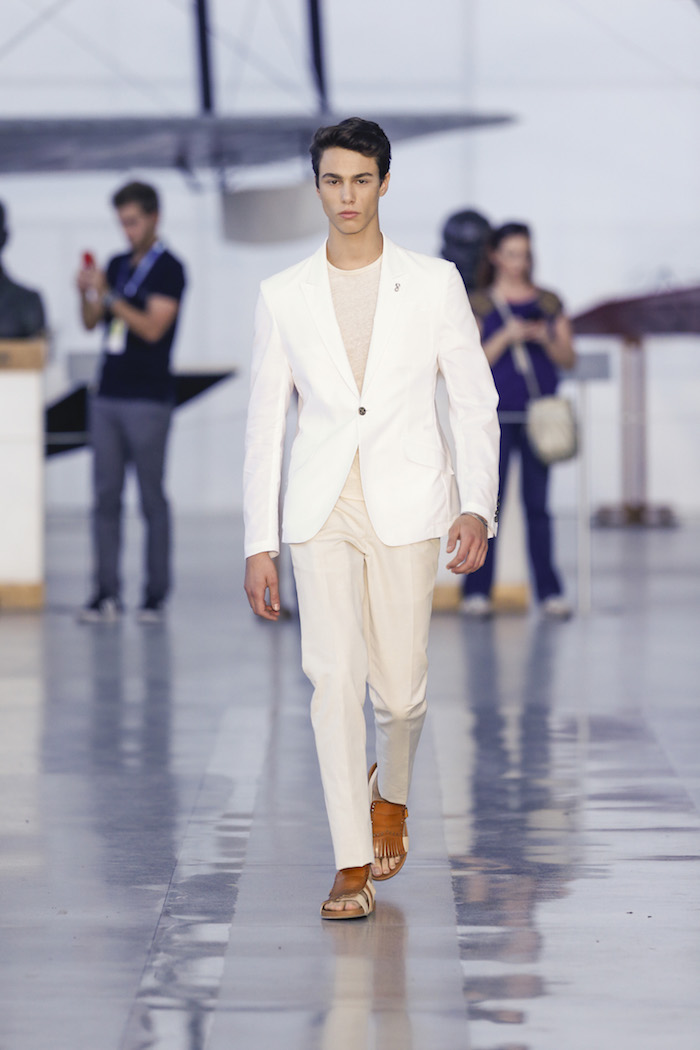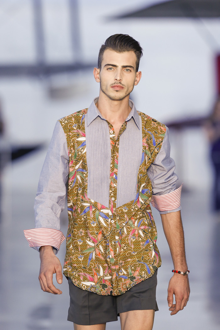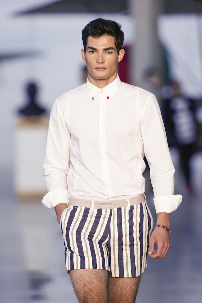 聞くところによると、ポルトガルのファッションシーンきっての実力派メンズウェアデザイナーだという。デザイナーの名前は Nuno Gama (ヌノ・ガマ)。今季コレクションの会場には、リスボン中心地に構える国営施設 Museu de Marinha (海洋博物館) が選ばれた。ルネサンスの古き良き時代を思わせる船舶がところ狭しと陳列されたランウェイで登場したのは、テーラリングをベースにしたマリンルック。中には「南蛮渡来」の趣を感じさせるオリエンタルな意匠が取りれられたルックも登場し、古くから貿易産業で栄えたポルトガルの文化的背景が垣間見えるラインナップとなった。ポルトガルらしいこんがり焼けたテラコッタスキンに隆々しい筋肉質のモデル。それをさらに際立たせるようなタイトなサイジングとマイクロミニのショーツ。日本ではなかなか見られないような、蛍光色にも見えるほど真っ白なシャツに強烈なタンジェリンオレンジのコントラスト。プレス向けの室内のショーに次いで、外の庭園で行われた一般の観客向けのショーが終わるころには、あまりの熱気に軽く目眩がするほどだった。これは気候によるものか、はたまたお色気モデルによるものか。
