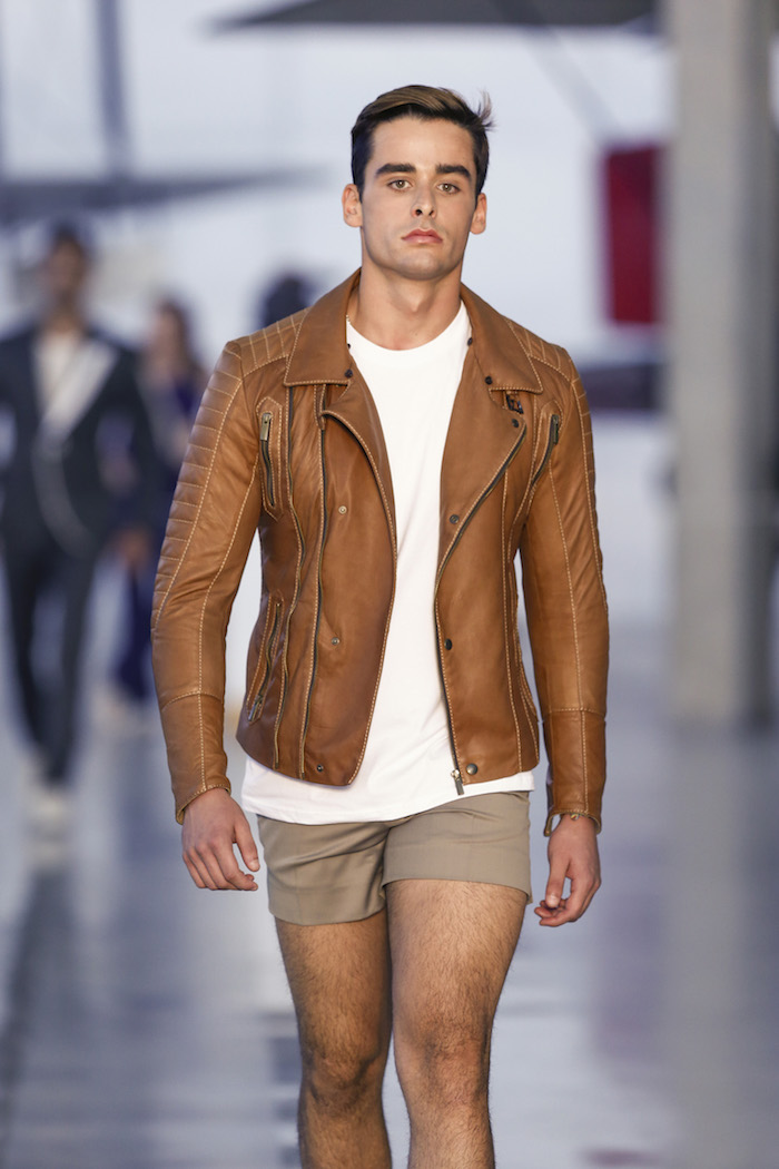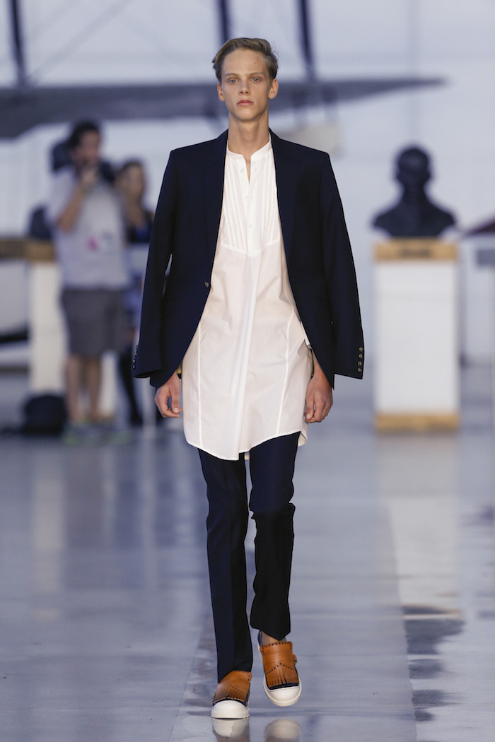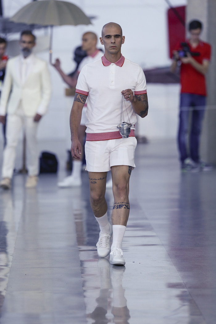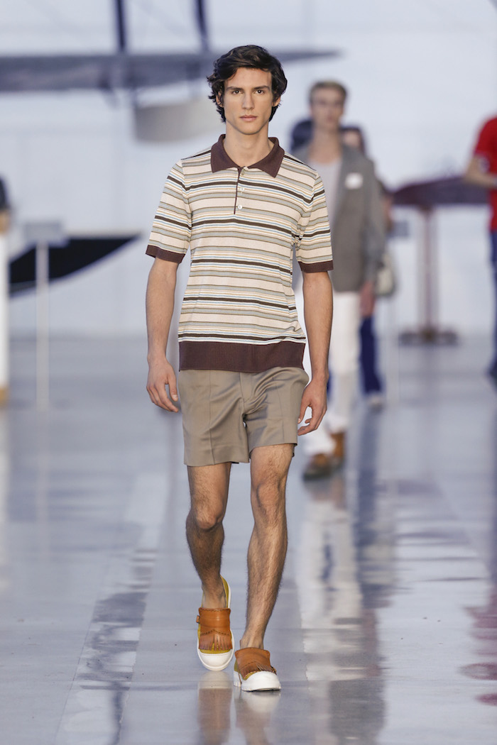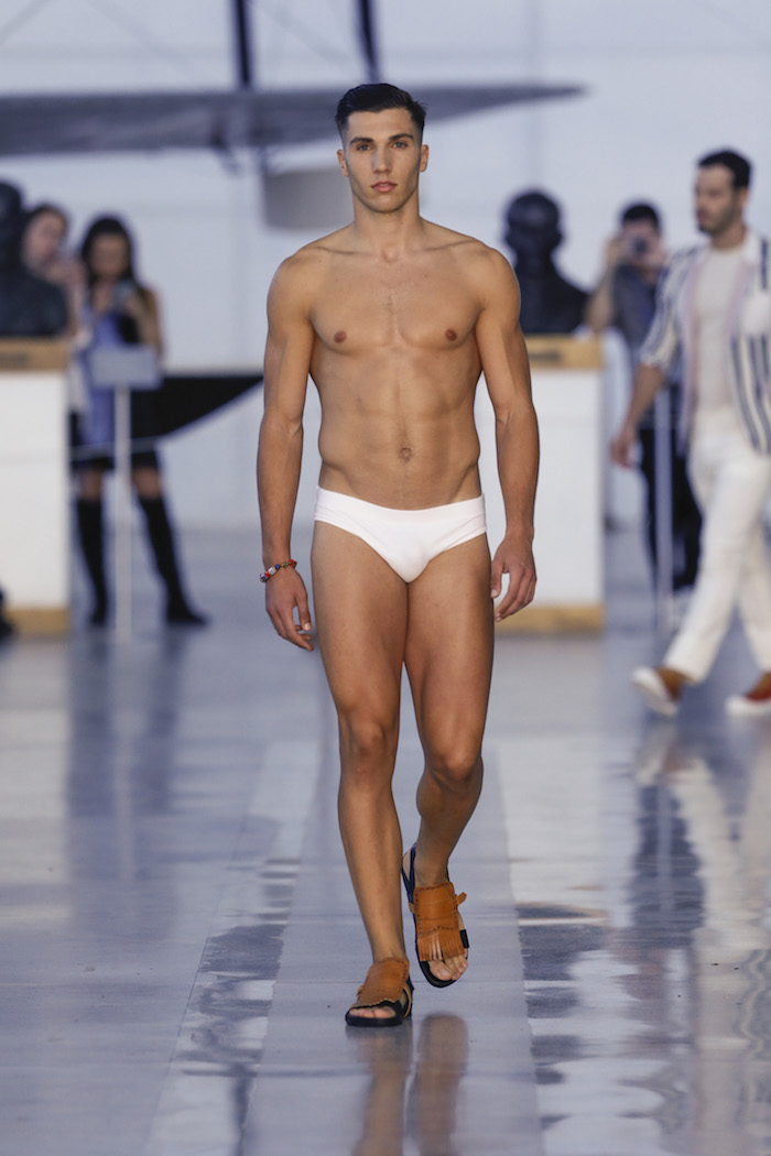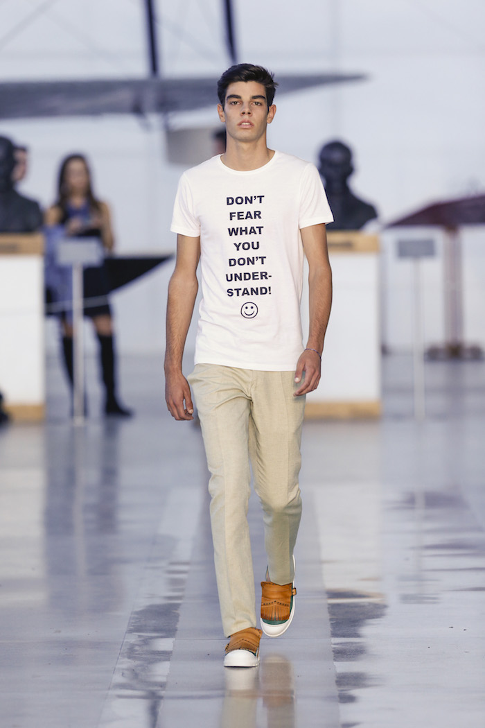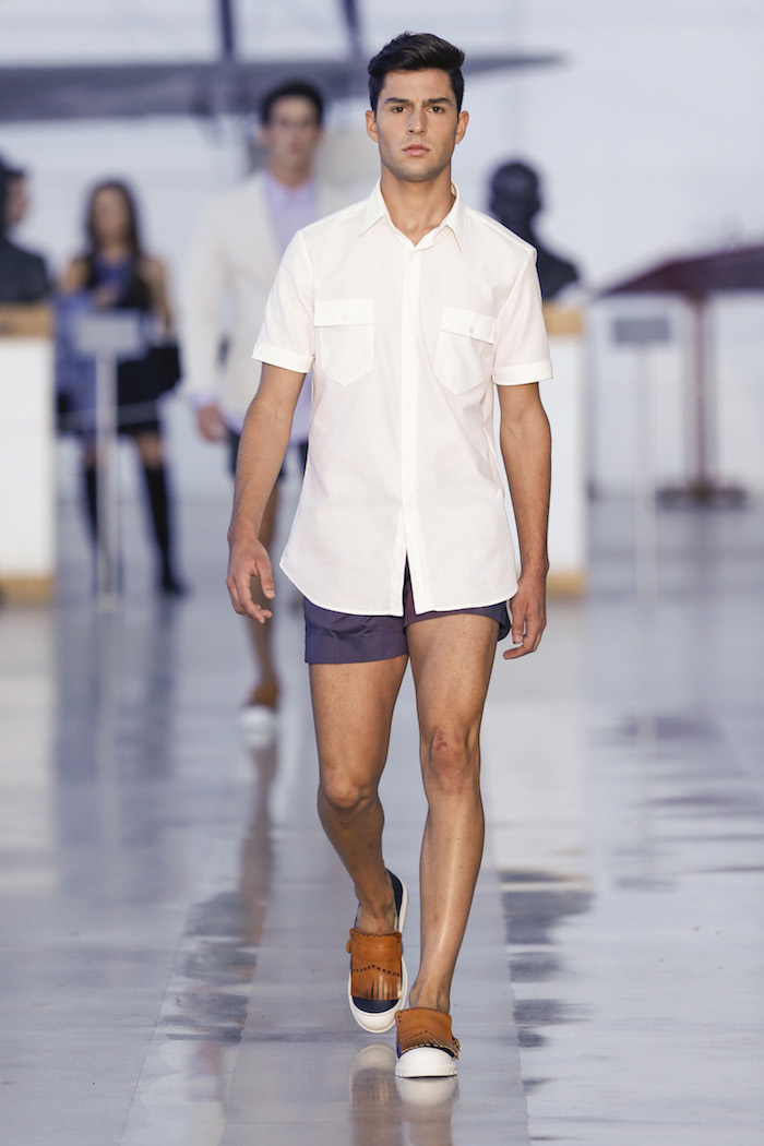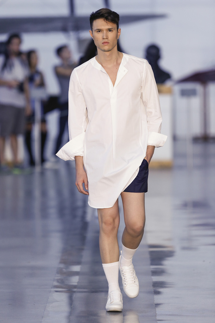 聞くところによると、ポルトガルのファッションシーンきっての実力派メンズウェアデザイナーだという。デザイナーの名前は Nuno Gama (ヌノ・ガマ)。今季コレクションの会場には、リスボン中心地に構える国営施設 Museu de Marinha (海洋博物館) が選ばれた。ルネサンスの古き良き時代を思わせる船舶がところ狭しと陳列されたランウェイで登場したのは、テーラリングをベースにしたマリンルック。中には「南蛮渡来」の趣を感じさせるオリエンタルな意匠が取りれられたルックも登場し、古くから貿易産業で栄えたポルトガルの文化的背景が垣間見えるラインナップとなった。ポルトガルらしいこんがり焼けたテラコッタスキンに隆々しい筋肉質のモデル。それをさらに際立たせるようなタイトなサイジングとマイクロミニのショーツ。日本ではなかなか見られないような、蛍光色にも見えるほど真っ白なシャツに強烈なタンジェリンオレンジのコントラスト。プレス向けの室内のショーに次いで、外の庭園で行われた一般の観客向けのショーが終わるころには、あまりの熱気に軽く目眩がするほどだった。これは気候によるものか、はたまたお色気モデルによるものか。