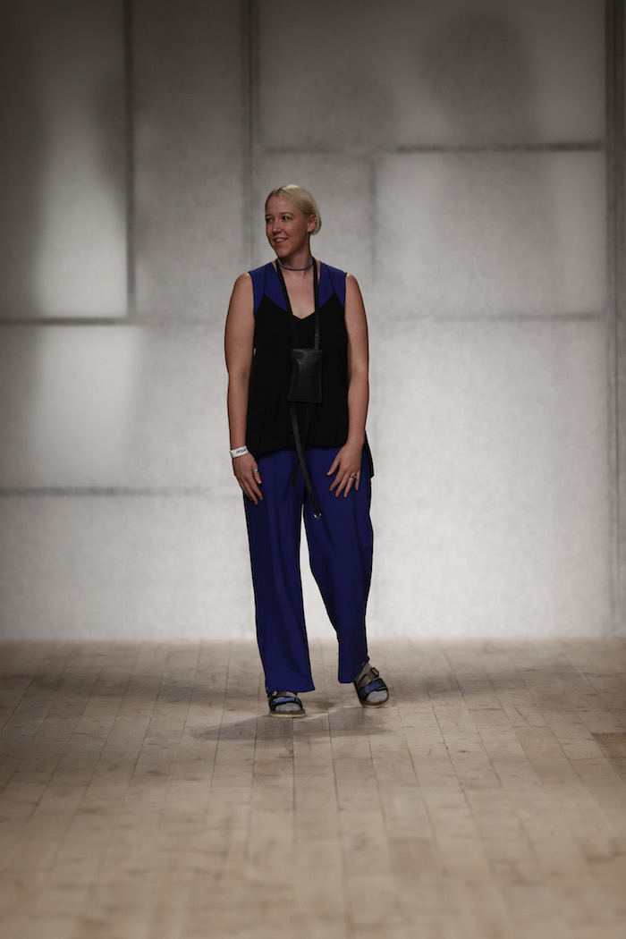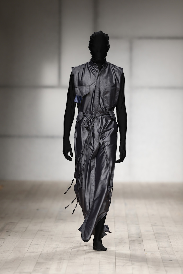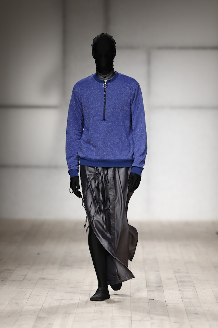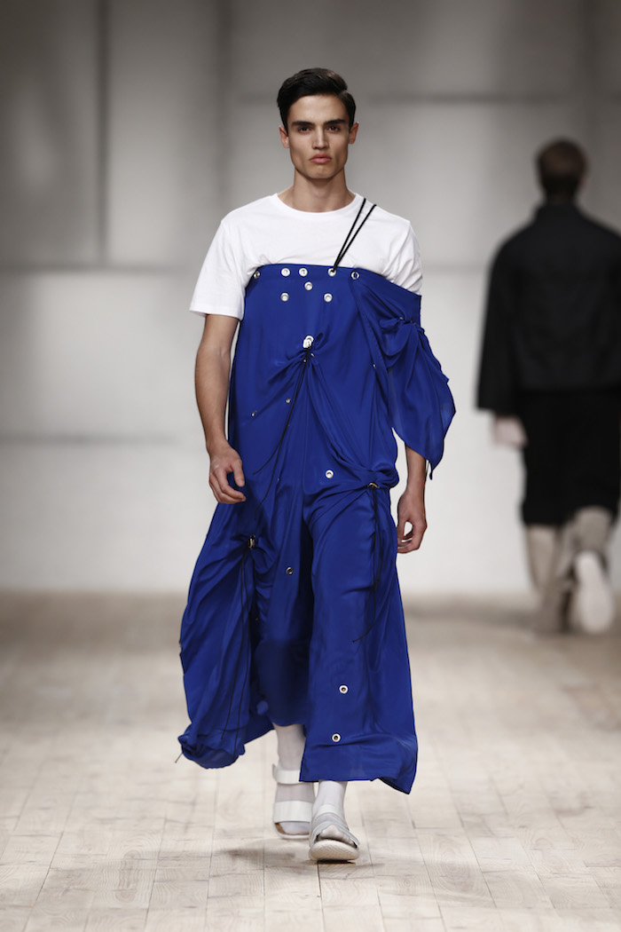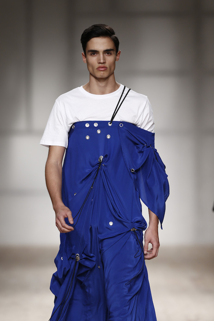 「リスボン・ファッションウィーク」期間中に開催される若手デザイナー支援プロジェクト「Sangue Novo (サングエ・ノヴォ)」。2013年よりローンチし、今季で7回目を迎えるこのコレクティブ・ショーは、ポルトガル国内、そしてヨーロッパの諸外国から選定された若手デザイナー10組前後がピックアップして一つのショーとして披露する、言わば日本の装苑賞のようなもの。今季2017年春夏シーズンにおいては、過去最大となる11組のデザイナーをキュレート。中でも目を引いたのは、ドイツからゲストデザイナーとして招待された Hermione Flynn (ハーマイオニ・フリン) だ。デザイナーの Hermione Flynn (ハーマイオニ・フリン) は、デザイナーのほかにパフォーマンスアートや映像制作など幅広いフィールドで手腕を発揮する気鋭アーティストだ。ブランドのコンセプトは「メンズのためのドレス」。特にジェンダーレスファッションが浸透する東京のファッションシーンで大いに受け入れられるのではないか、と想像しながらブルーのタフタがはためく様子に目を凝らした。