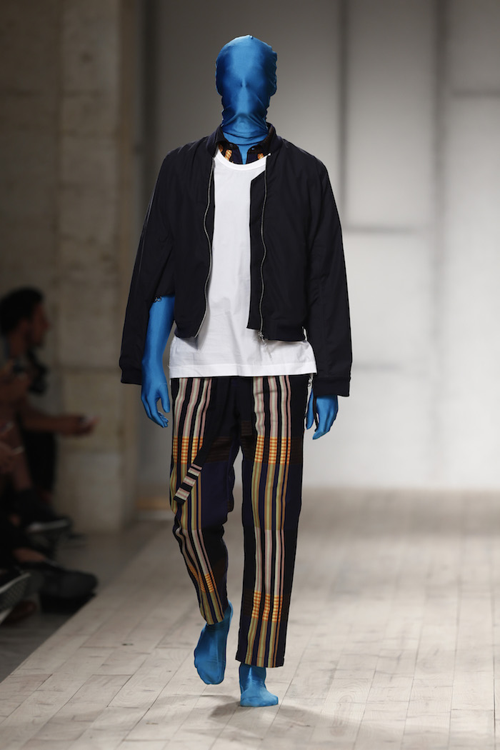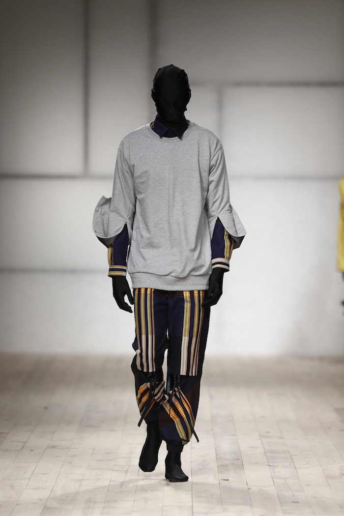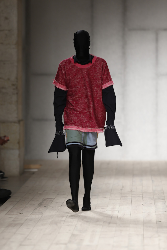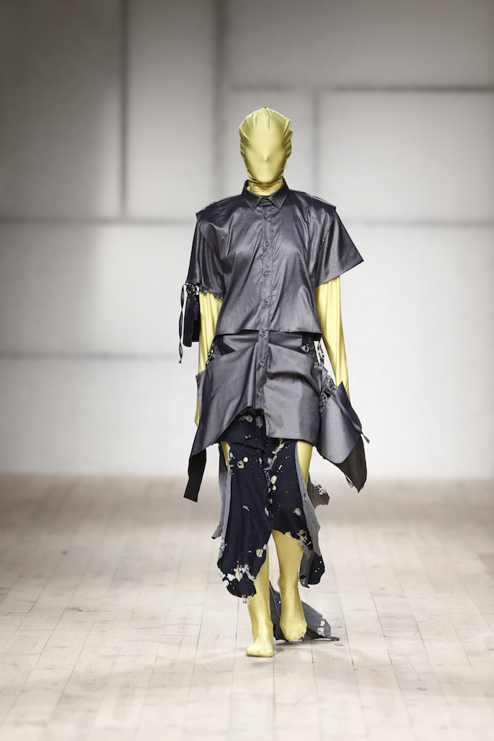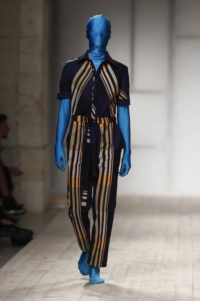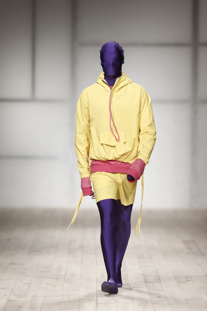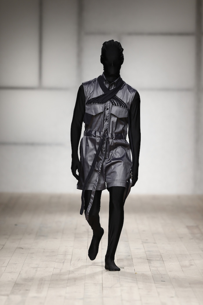 アヴァンギャルドを持ち味にするデザイナーにとって、パブリシティはブランドの成功における必要必須要素だと言えるだろう。だからこそ、才能あるデザイナーはパリやロンドンに拠点を移す。ランウェイで披露されたルックをそのまま着られるコマーシャルブランドと異なり、プレゼンテーションでいかにジャーナリストやスタイリストに強い印象を与えられるか。それによって、スターデザイナーになるか、時代遅れのモード至上主義者になるかが分かれる。それを踏まえた上で、ポルトガルのファッションシーンにおけるアヴァンギャルドの騎手、Richardo Andrez (リチャード・アンドレス) のコレクションを見てみよう。今季で8シーズン目となる2017年春夏コレクションでは、モデル全員が全身タイツを着用し登場。キッチュなプリントと端正な仕立て、そしてパンクスタイルを思わせるディティール使いはなかなかの完成度だが、あまりに異様な “黒子” の演出に、逆に洋服に目が行かなかったというのが正直なところだ。エキセントリックなものを求めてポルトガルに来ている人がどれだけいるかは謎だが、シンプルなヘアメイクで見せた方が洋服の印象が残ったのではないかとも思う。