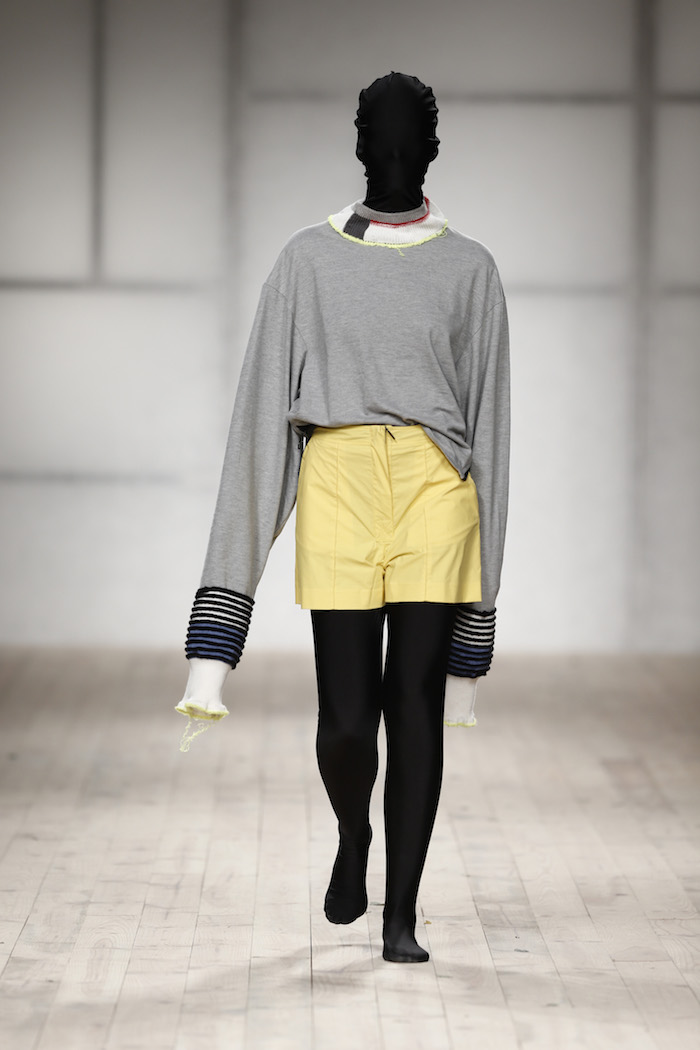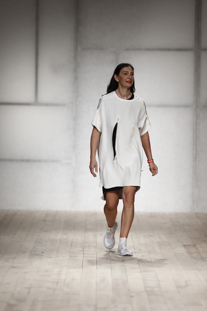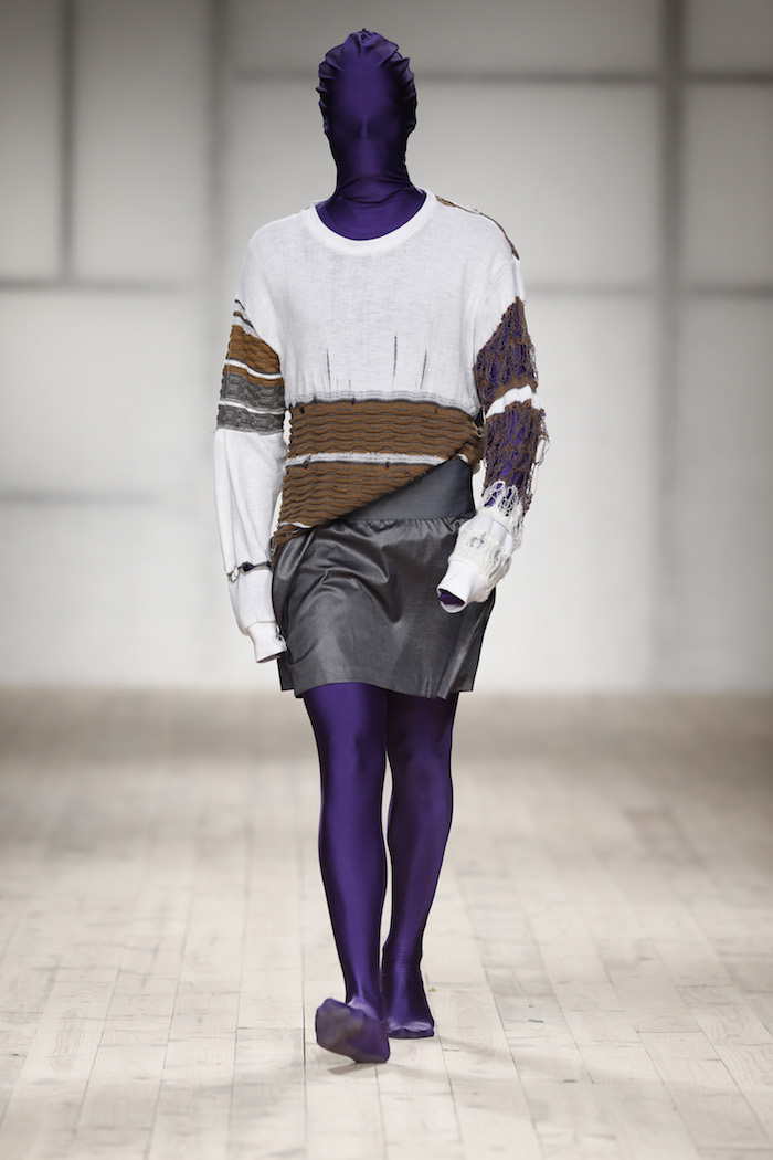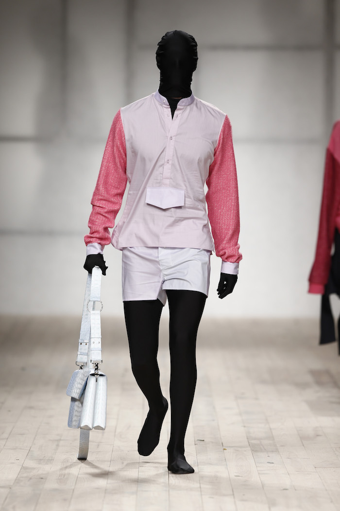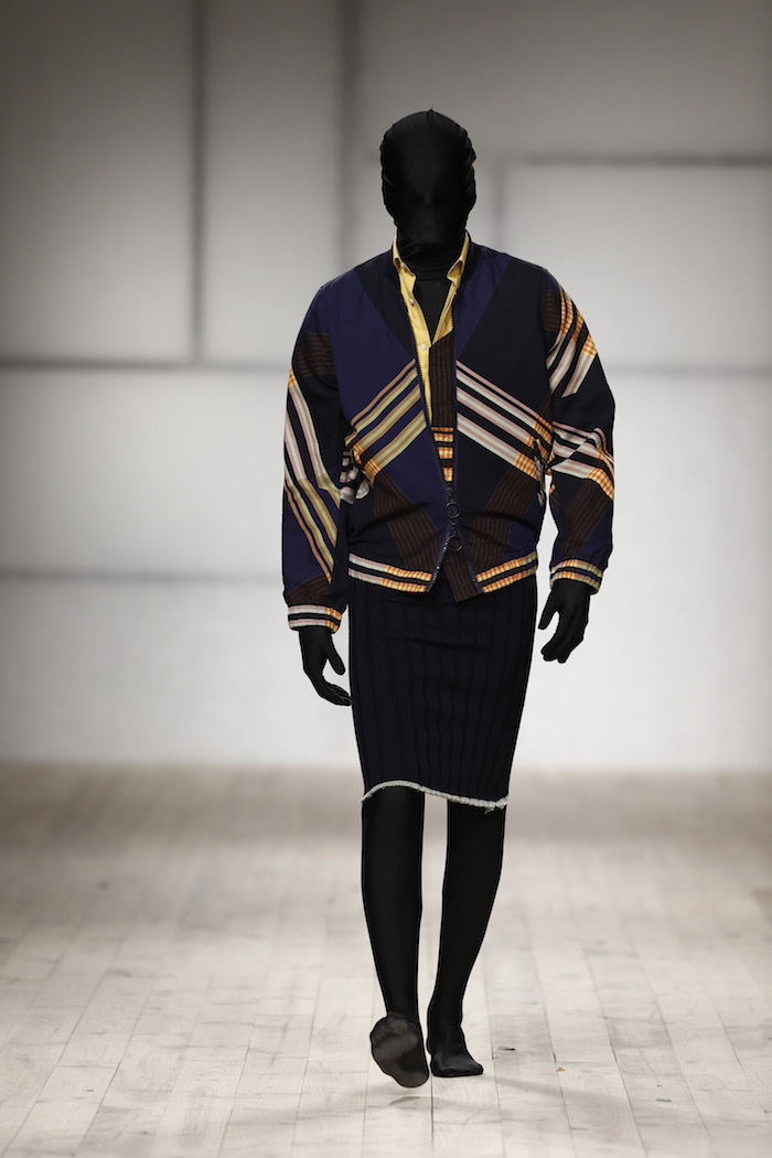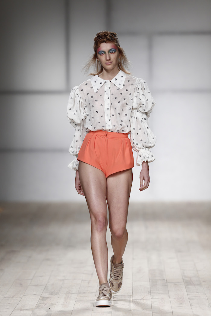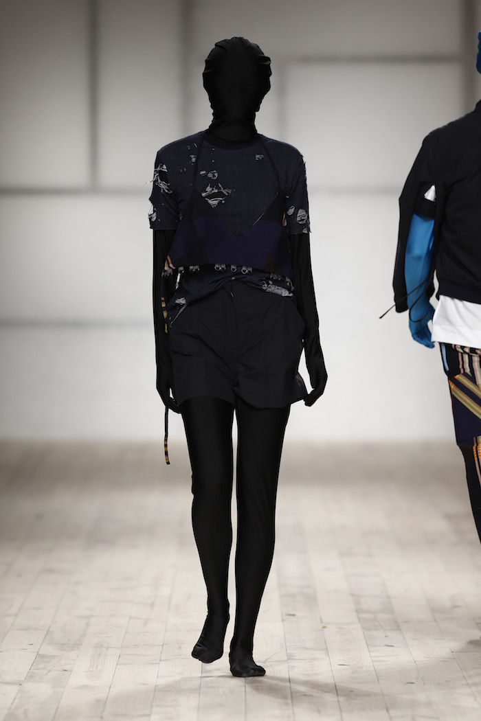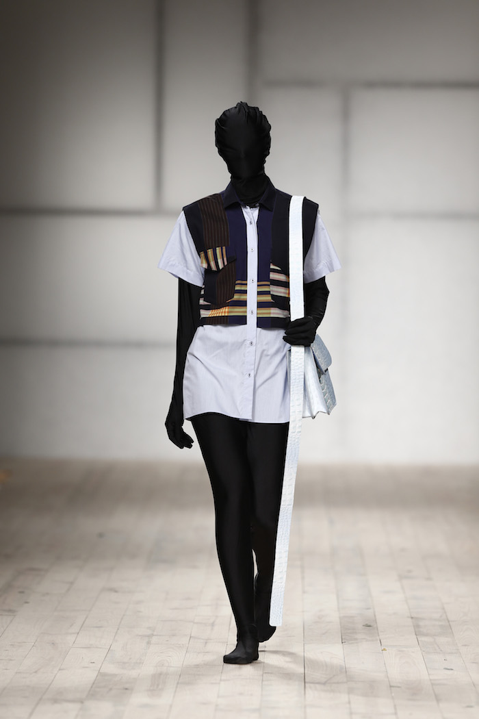 アヴァンギャルドを持ち味にするデザイナーにとって、パブリシティはブランドの成功における必要必須要素だと言えるだろう。だからこそ、才能あるデザイナーはパリやロンドンに拠点を移す。ランウェイで披露されたルックをそのまま着られるコマーシャルブランドと異なり、プレゼンテーションでいかにジャーナリストやスタイリストに強い印象を与えられるか。それによって、スターデザイナーになるか、時代遅れのモード至上主義者になるかが分かれる。それを踏まえた上で、ポルトガルのファッションシーンにおけるアヴァンギャルドの騎手、Richardo Andrez (リチャード・アンドレス) のコレクションを見てみよう。今季で8シーズン目となる2017年春夏コレクションでは、モデル全員が全身タイツを着用し登場。キッチュなプリントと端正な仕立て、そしてパンクスタイルを思わせるディティール使いはなかなかの完成度だが、あまりに異様な “黒子” の演出に、逆に洋服に目が行かなかったというのが正直なところだ。エキセントリックなものを求めてポルトガルに来ている人がどれだけいるかは謎だが、シンプルなヘアメイクで見せた方が洋服の印象が残ったのではないかとも思う。