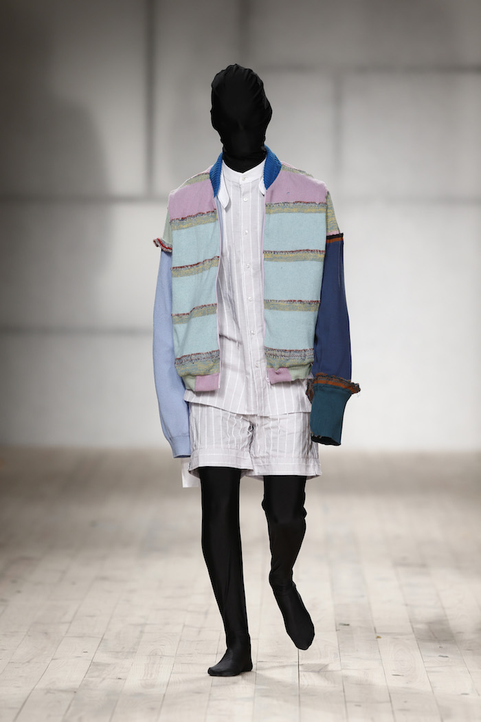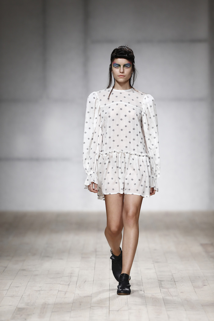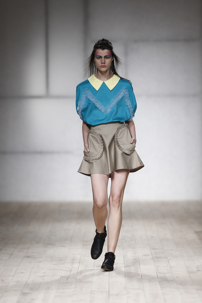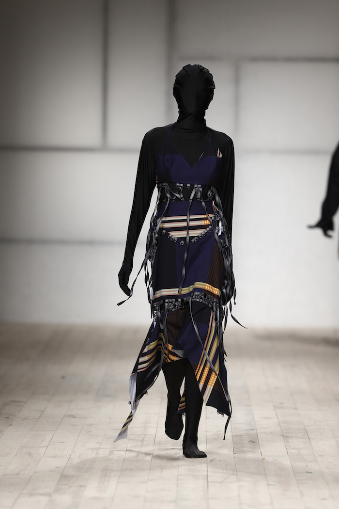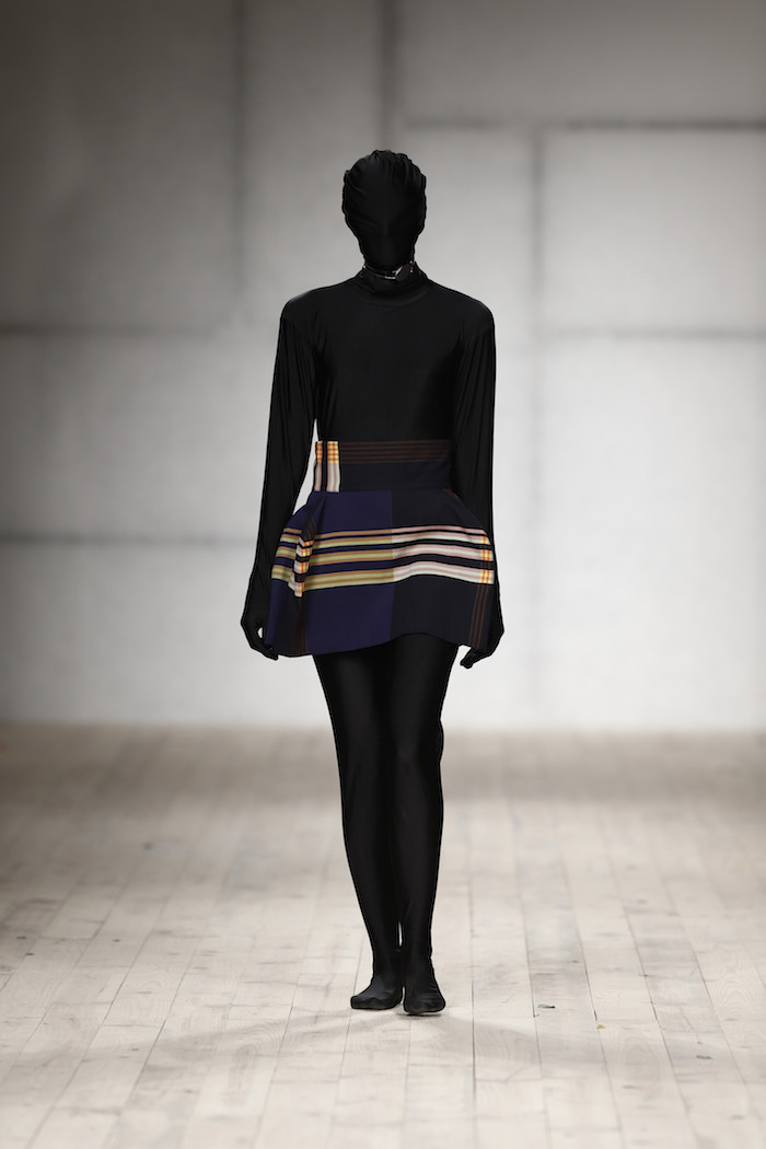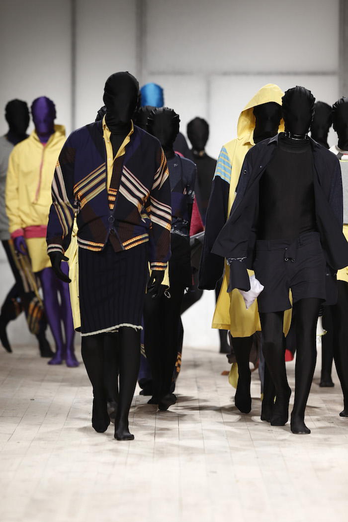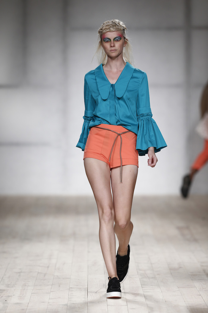 アヴァンギャルドを持ち味にするデザイナーにとって、パブリシティはブランドの成功における必要必須要素だと言えるだろう。だからこそ、才能あるデザイナーはパリやロンドンに拠点を移す。ランウェイで披露されたルックをそのまま着られるコマーシャルブランドと異なり、プレゼンテーションでいかにジャーナリストやスタイリストに強い印象を与えられるか。それによって、スターデザイナーになるか、時代遅れのモード至上主義者になるかが分かれる。それを踏まえた上で、ポルトガルのファッションシーンにおけるアヴァンギャルドの騎手、Richardo Andrez (リチャード・アンドレス) のコレクションを見てみよう。今季で8シーズン目となる2017年春夏コレクションでは、モデル全員が全身タイツを着用し登場。キッチュなプリントと端正な仕立て、そしてパンクスタイルを思わせるディティール使いはなかなかの完成度だが、あまりに異様な “黒子” の演出に、逆に洋服に目が行かなかったというのが正直なところだ。エキセントリックなものを求めてポルトガルに来ている人がどれだけいるかは謎だが、シンプルなヘアメイクで見せた方が洋服の印象が残ったのではないかとも思う。
