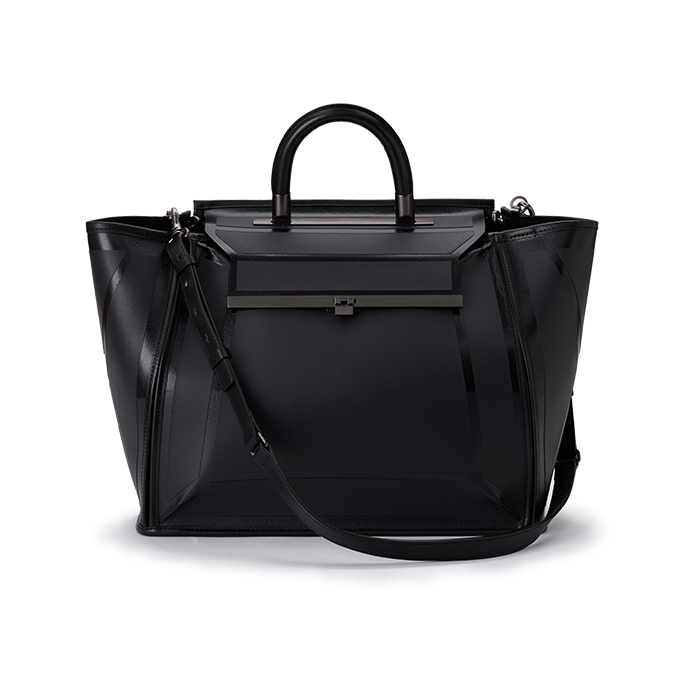 同ブランド設立以来、一貫している概念である “一枚の布”から着想を得て、“一枚の革”で仕立てたバッグシリーズ「GUSTON」。バッグのサイドに付いているファスナーを下ろして裏返すと全く違う表情のバッグとして生まれ変わるリバーシブル機能や、カラーインクを重ねて刷る積層プリントの技法により、インクを厚く盛った部分と薄い部分の高低差の目地がガイドラインとなり、バッグのフォルムの変化やカラーをより愉しむことができる。新作のオールブラックカラーは、これまでの鮮やかなカラーを一切なくし、より積層部分の光沢感を際立たせることによってスタイリッシュに洗練されたデザインとなっている。