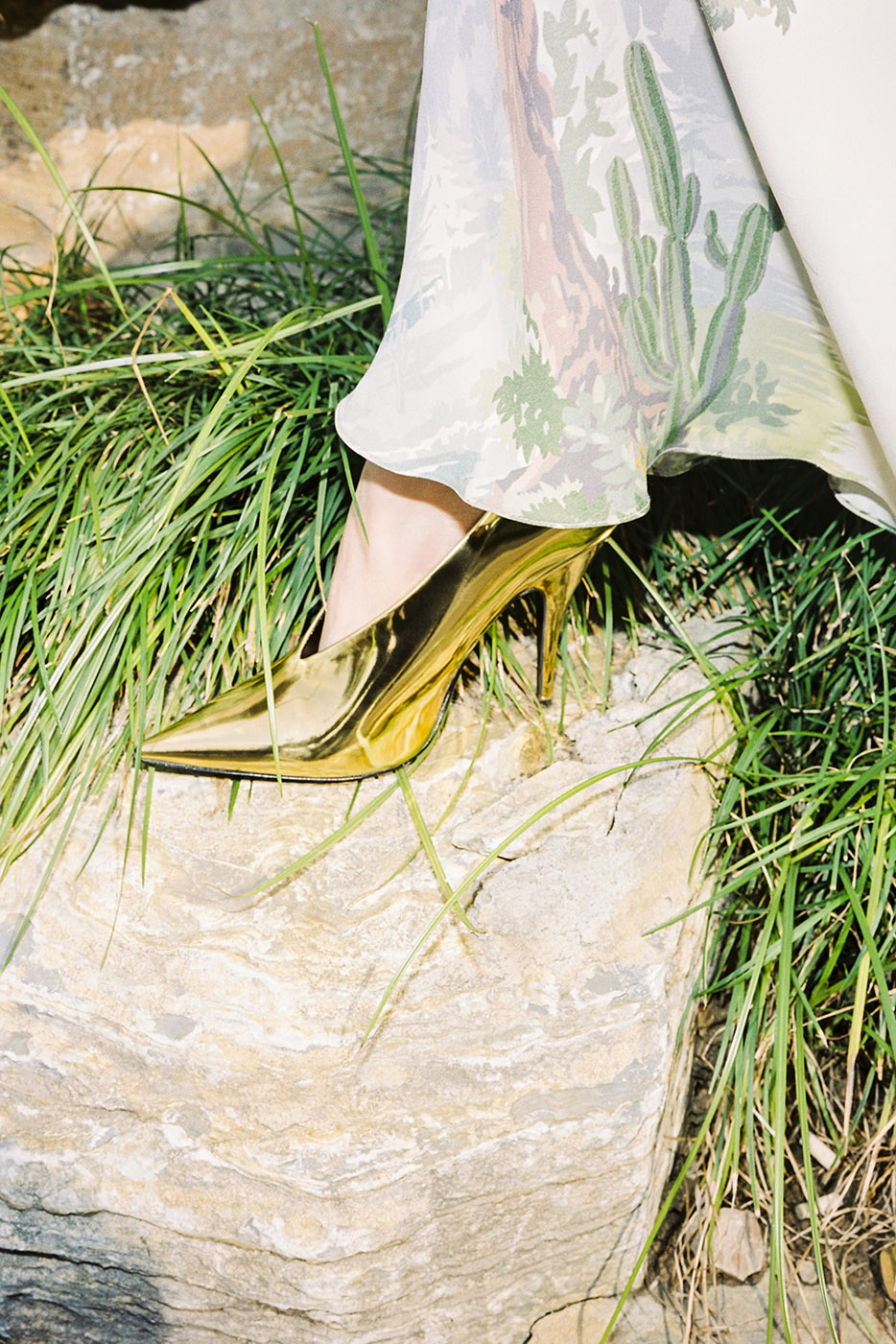 ランドスケーププリントのドレスがとても気に入りました。撮影を行った橋ではこのドレスがとても美しく見えました。とてもスペシャルなルックです。また、メタリックゴールドのヒールも大好きです!