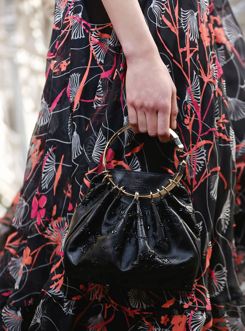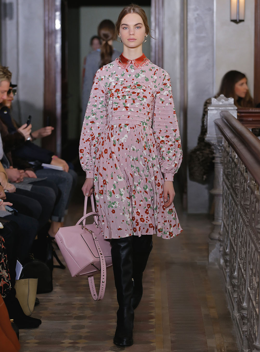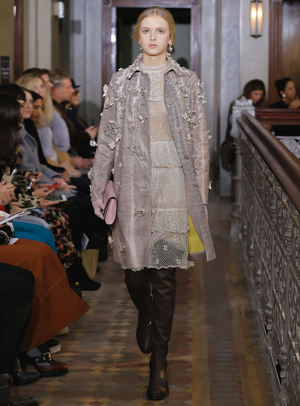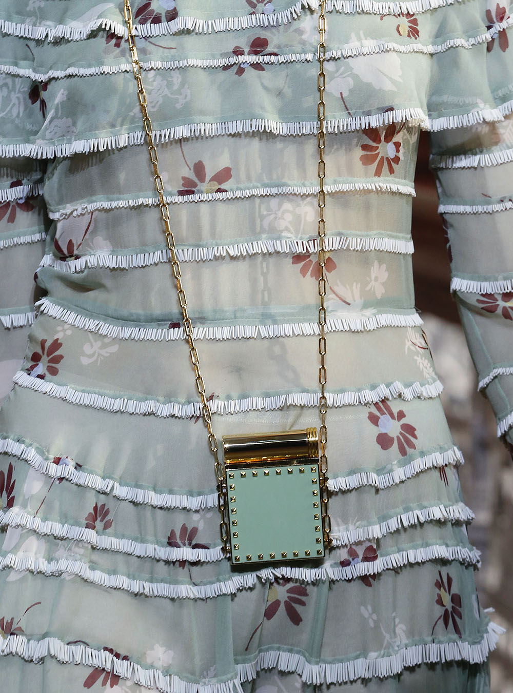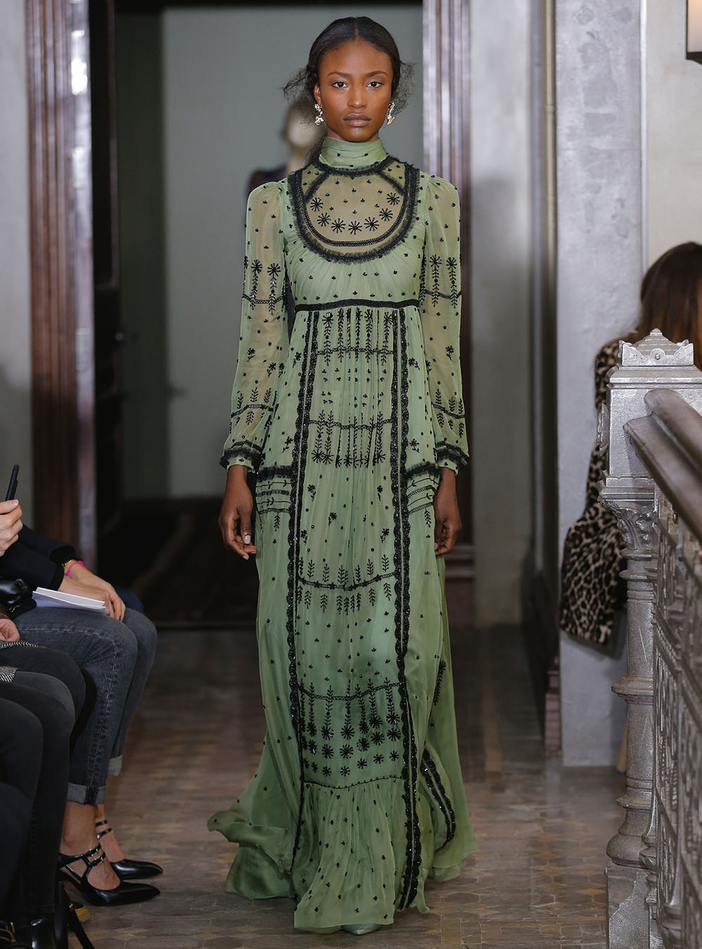 Pierpaolo Piccioli (ピエールパオロ・ピッチョーリ) が今回発表したのは、ノスタルジックなフラワーモチーフをプリントやレース、繊細なエンブロイダリーワークで表現したワードローブ。高い位置でマークされたウエストが至極フェミニンな印象の洋服には、対照的にワイルドなライディングブーツやアイコニックな「ロックスタッズ」のバッグ、アクセサリー、そしてフラットのスリッポンが合わせられた。