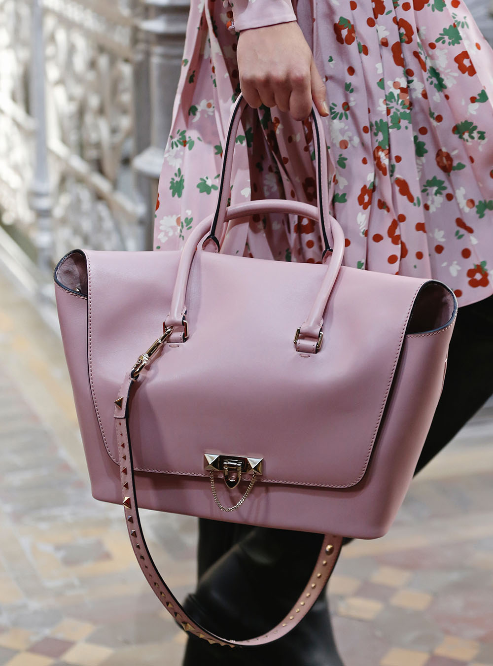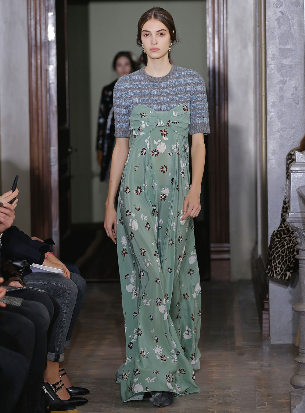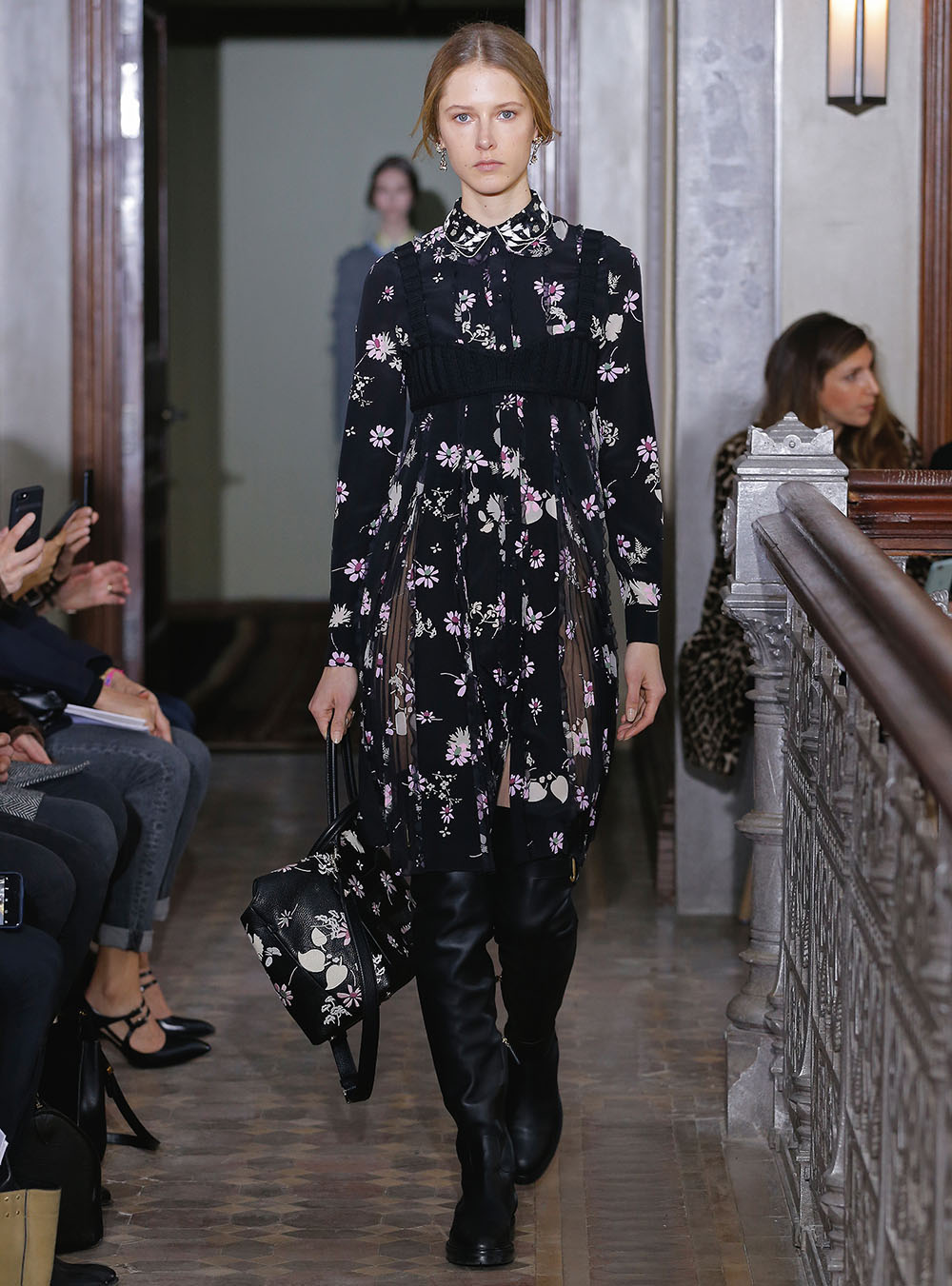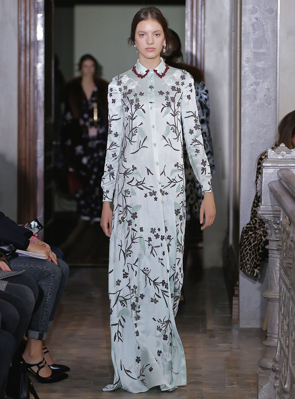 Pierpaolo Piccioli (ピエールパオロ・ピッチョーリ) が今回発表したのは、ノスタルジックなフラワーモチーフをプリントやレース、繊細なエンブロイダリーワークで表現したワードローブ。高い位置でマークされたウエストが至極フェミニンな印象の洋服には、対照的にワイルドなライディングブーツやアイコニックな「ロックスタッズ」のバッグ、アクセサリー、そしてフラットのスリッポンが合わせられた。