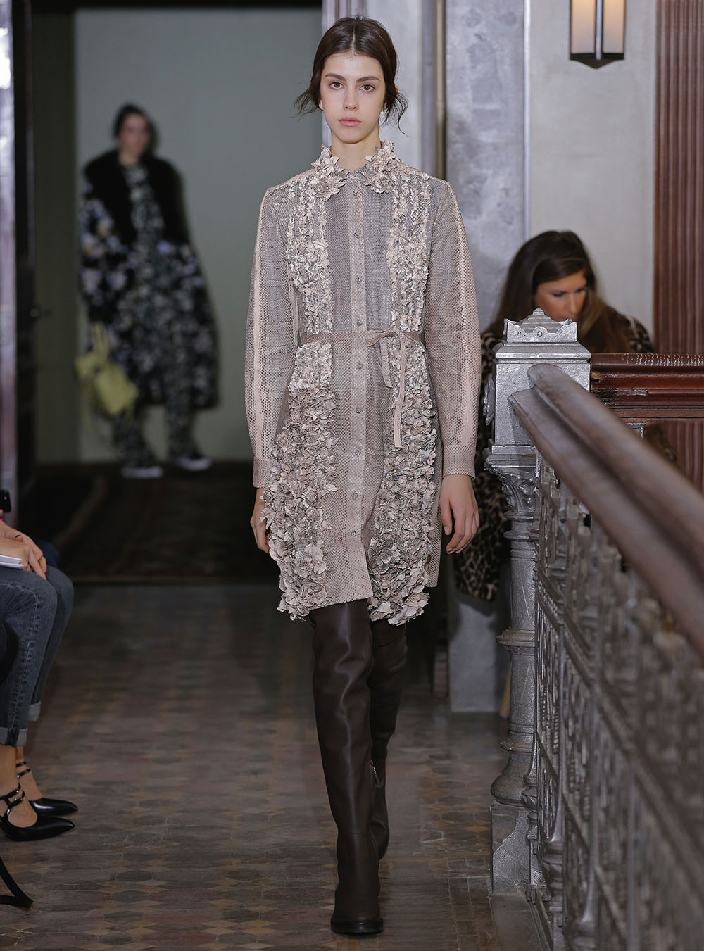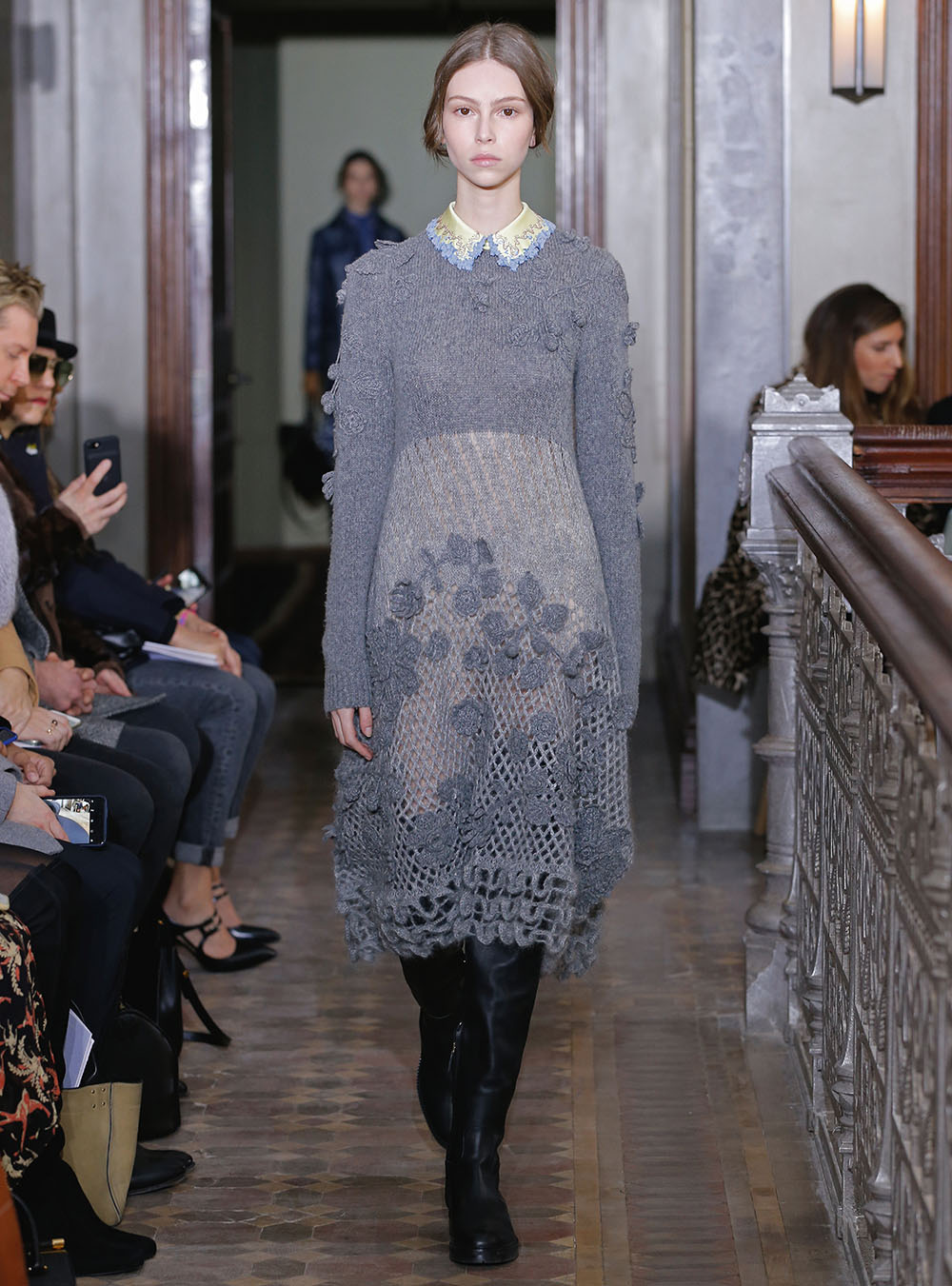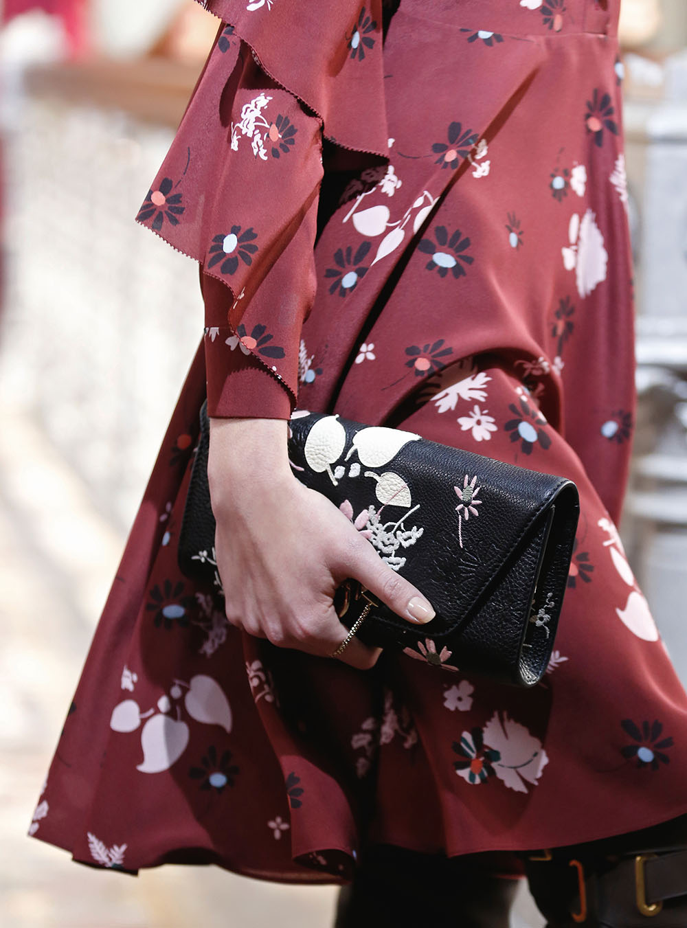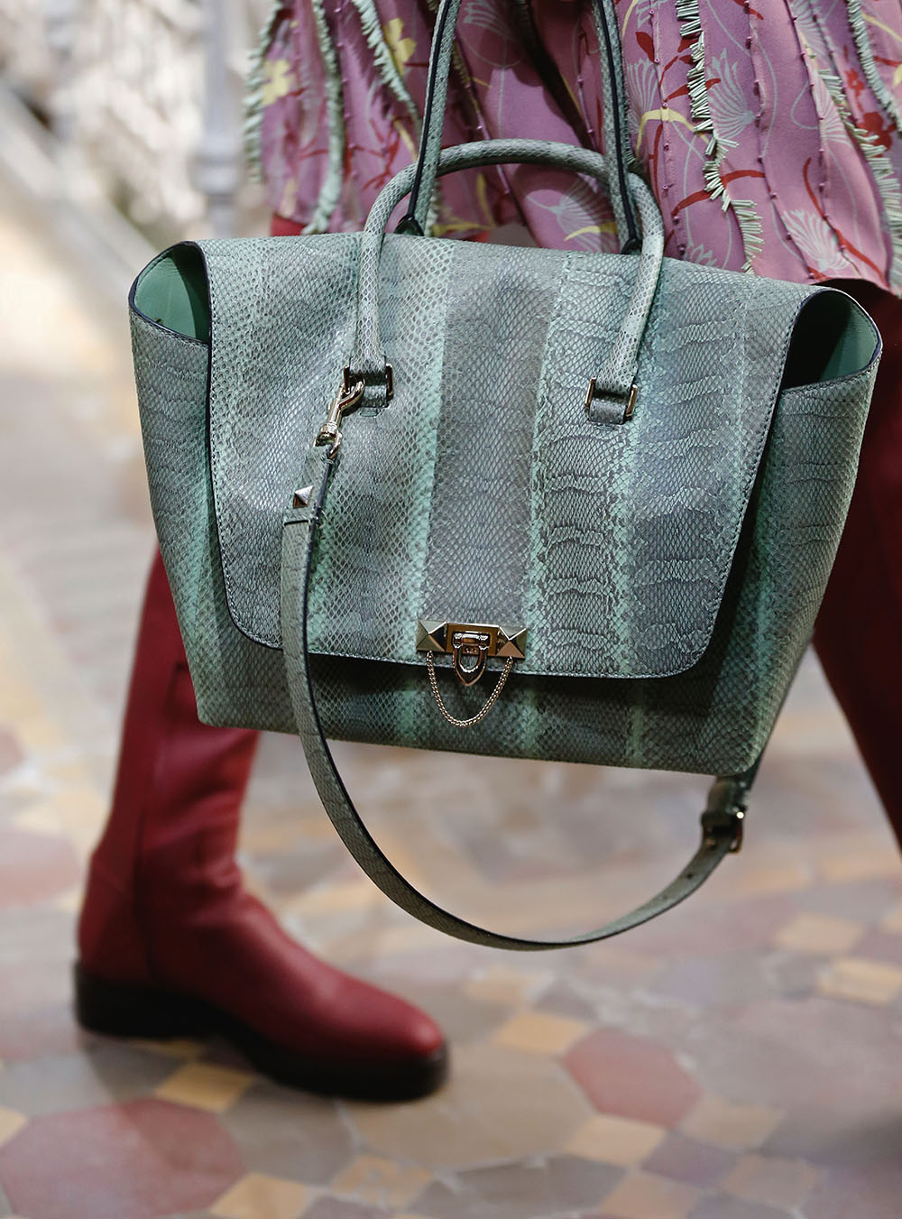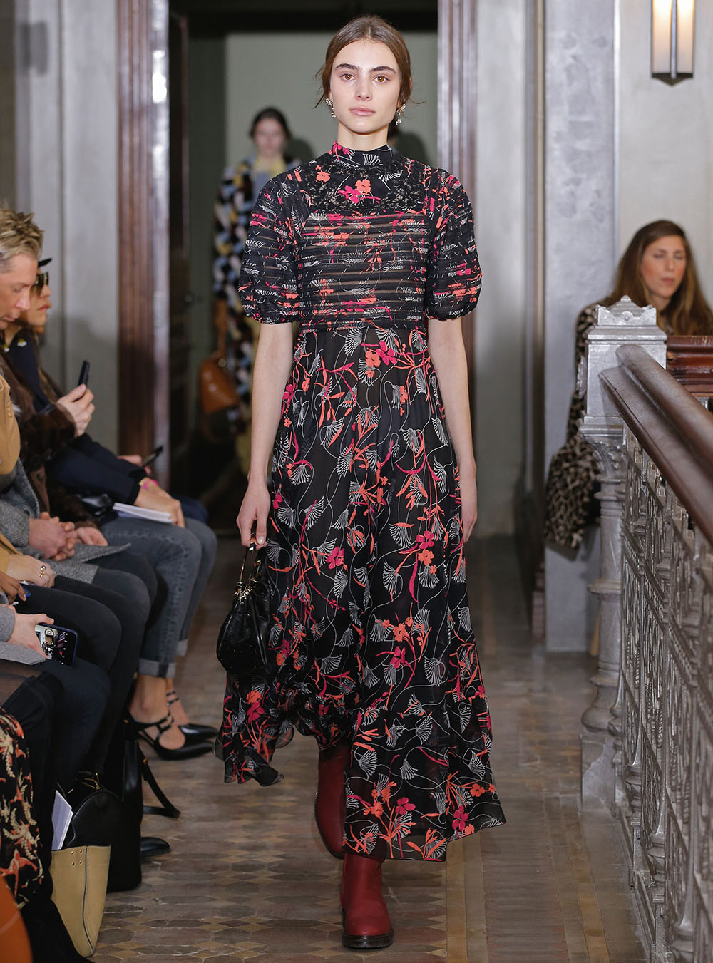 Pierpaolo Piccioli (ピエールパオロ・ピッチョーリ) が今回発表したのは、ノスタルジックなフラワーモチーフをプリントやレース、繊細なエンブロイダリーワークで表現したワードローブ。高い位置でマークされたウエストが至極フェミニンな印象の洋服には、対照的にワイルドなライディングブーツやアイコニックな「ロックスタッズ」のバッグ、アクセサリー、そしてフラットのスリッポンが合わせられた。