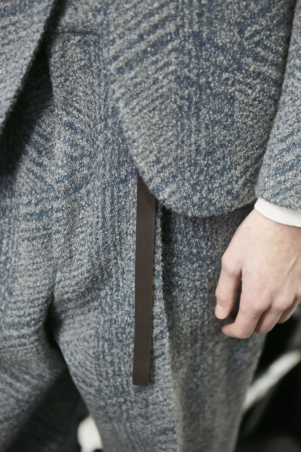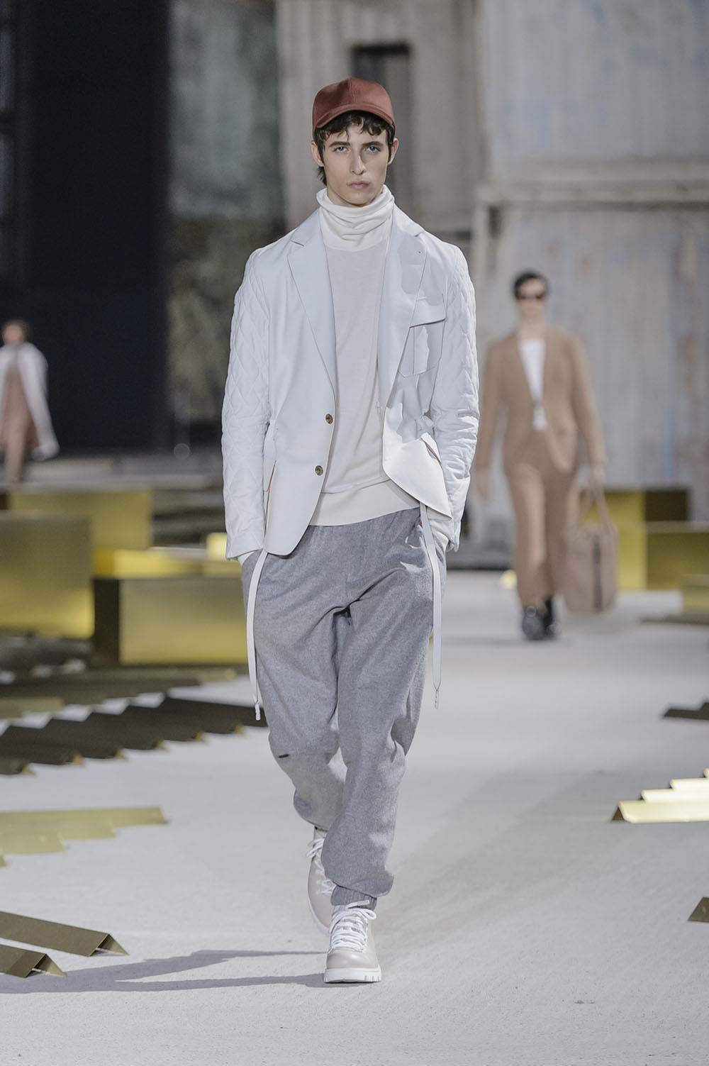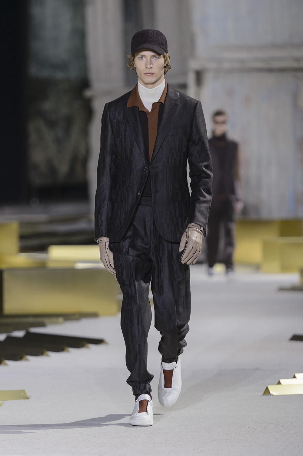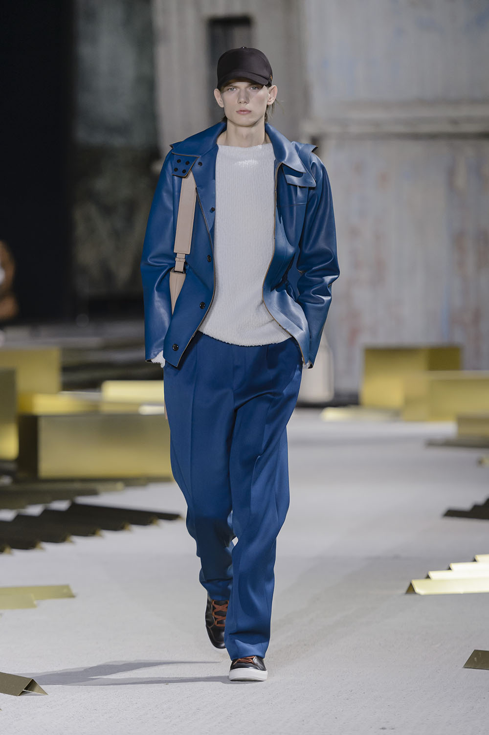 Anselm Kiefer (アンゼルム・キーファー) の空間作品「Seven Heavenly Palaces」を用いた会場では、軽やかなウィンターホワイトやライトグレーをはじめ、ディープなオックスブラッドやピーコックグリーン、ジャーナル ブルーなど力強いカラーコントラストが効いたワードローブが彩りを演出。最高級のメンズウェアとして名高い同ブランドらしく、キャメルやビキューナ、そしてナッパレザーを驚くほど細い糸状にカットして織機で織り上げた「ペッレ テスータ」と呼ばれる独自のファブリックなど、贅を尽くした素材使いが印象的だ。