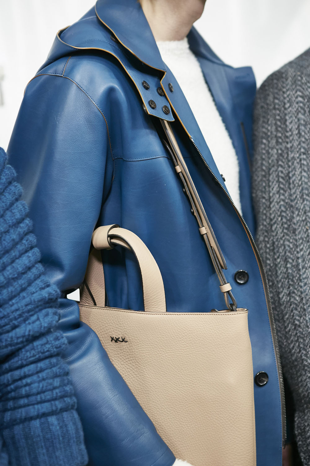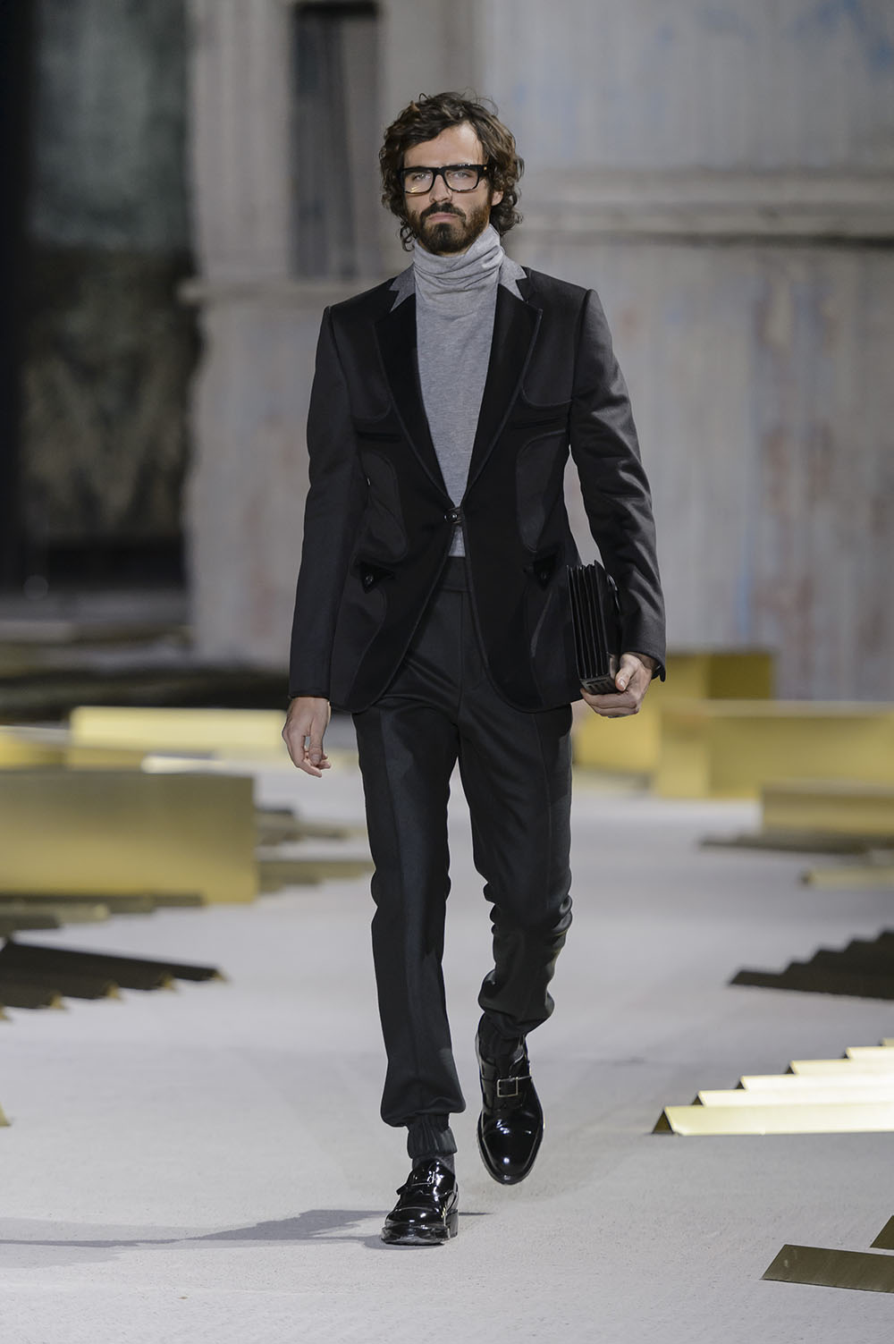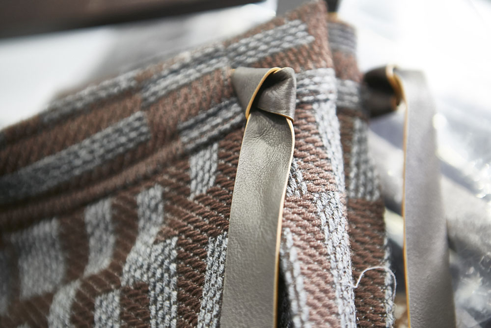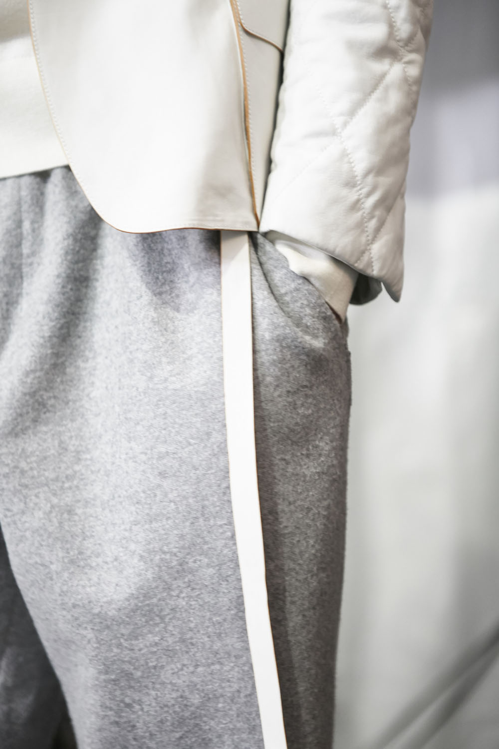 Anselm Kiefer (アンゼルム・キーファー) の空間作品「Seven Heavenly Palaces」を用いた会場では、軽やかなウィンターホワイトやライトグレーをはじめ、ディープなオックスブラッドやピーコックグリーン、ジャーナル ブルーなど力強いカラーコントラストが効いたワードローブが彩りを演出。最高級のメンズウェアとして名高い同ブランドらしく、キャメルやビキューナ、そしてナッパレザーを驚くほど細い糸状にカットして織機で織り上げた「ペッレ テスータ」と呼ばれる独自のファブリックなど、贅を尽くした素材使いが印象的だ。
