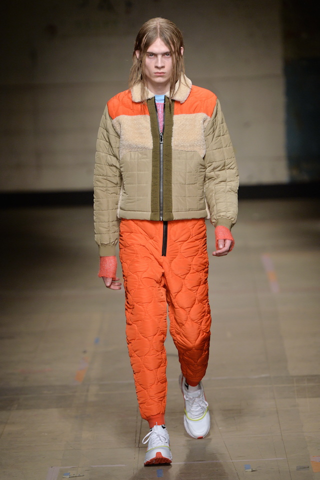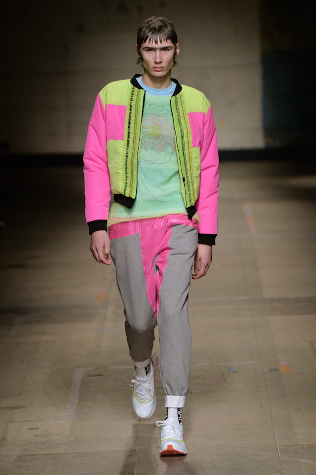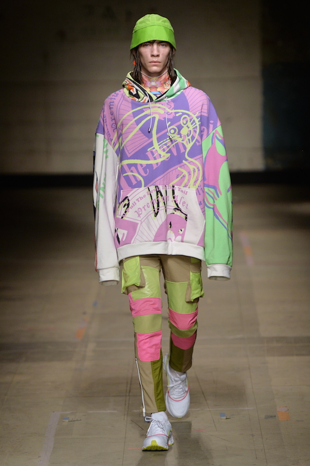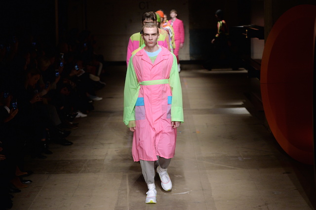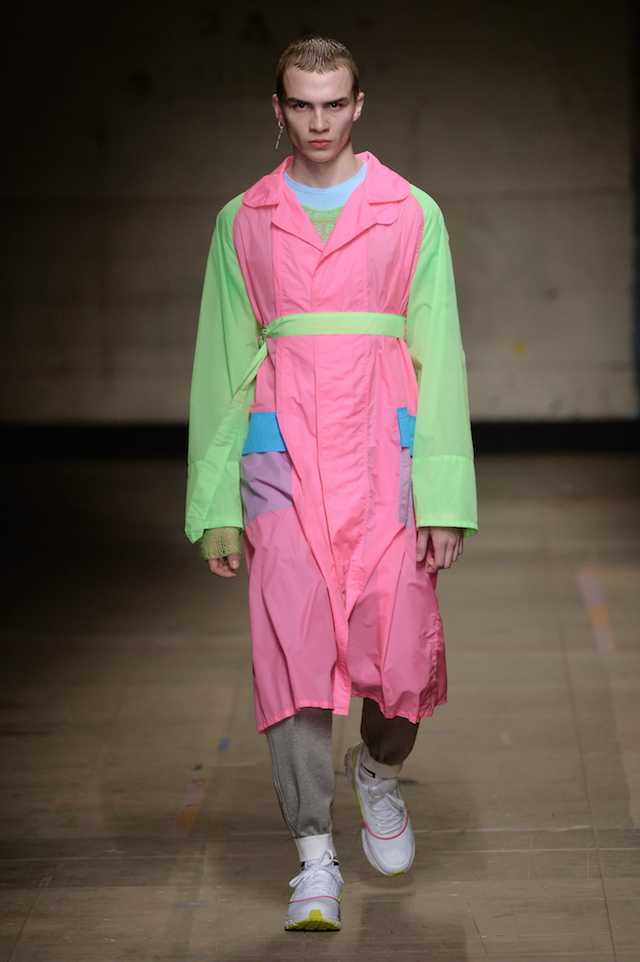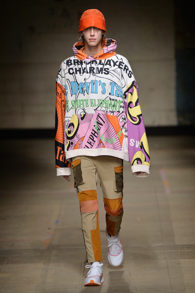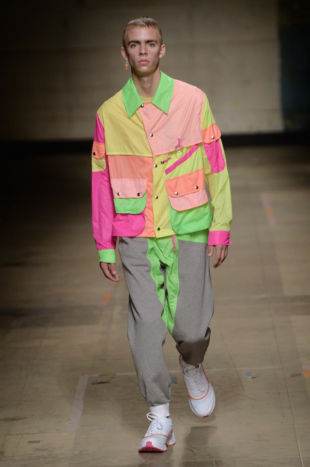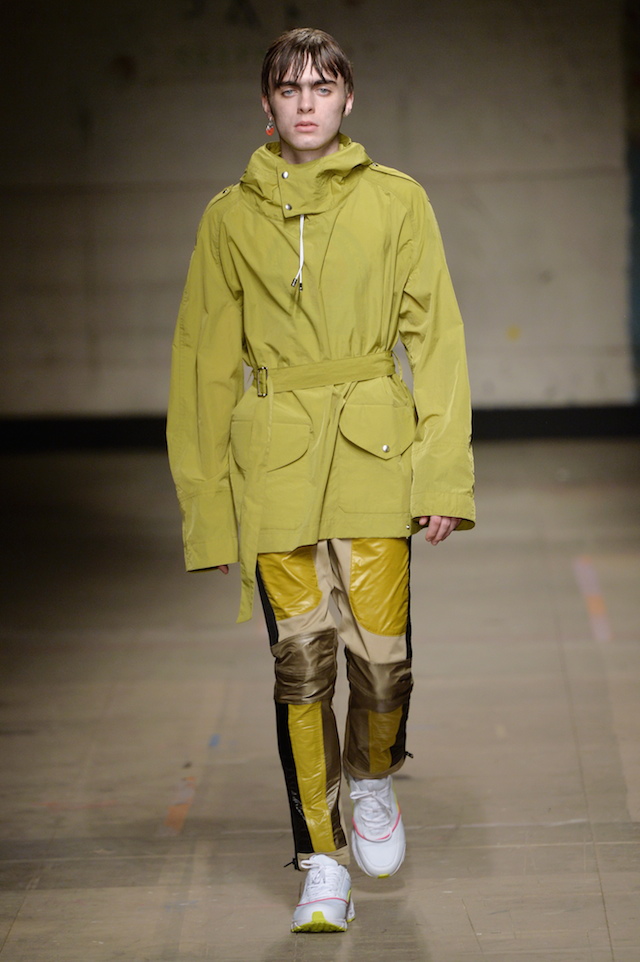 テムズ川沿いの港湾や造船所でかつて見られた労働者の作業着、そして英国のナイトシーンやユースカルチャー、特に90年代のレイヴカルチャーに見られたネオンカラーやグラフィックをインスピレーションにした今季。英国の国民的ブランドが魅せたのは、自国が誇る伝統的なテラーリングとパンクな反骨精神をミックスさせた変幻自在なストリートスタイル。音楽は、ヨーロッパ随一のエレクトロ・ミュージック・レーベル Output (アウトプット) のオーナー兼音楽プロデューサーの Trevor Jackson (トレヴァー・ジャクソン)。