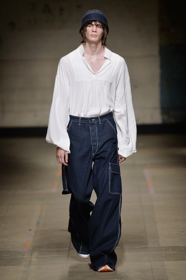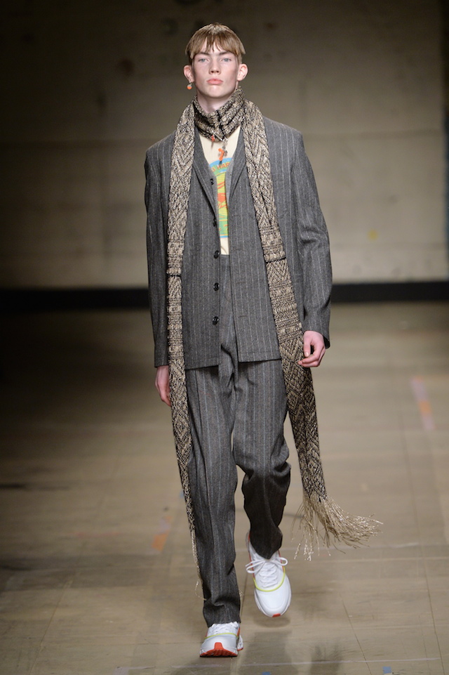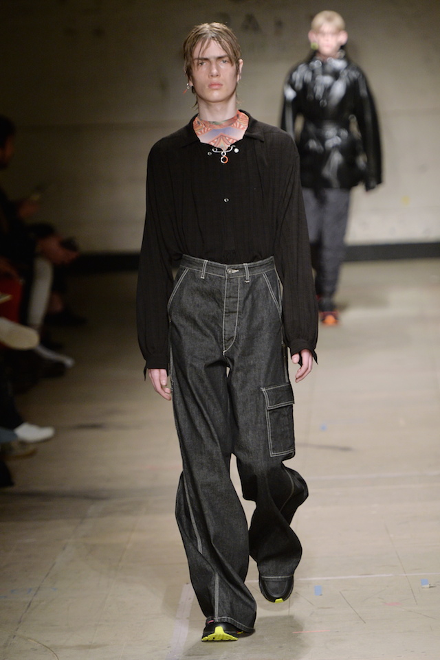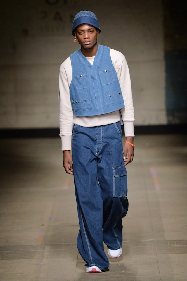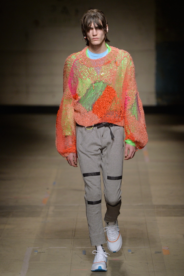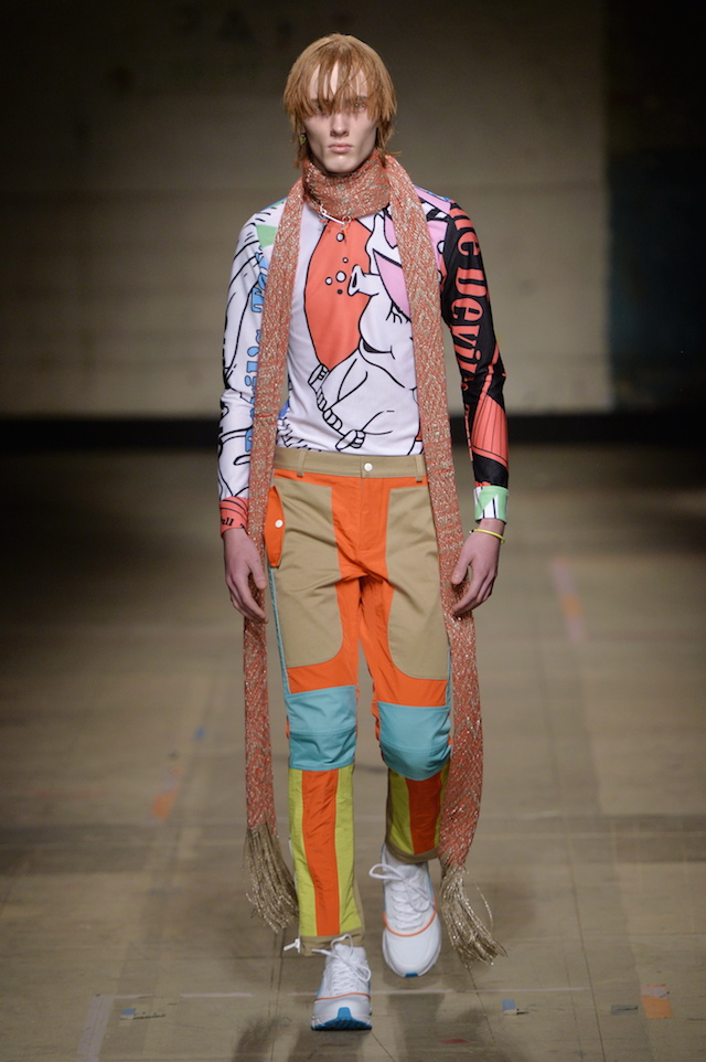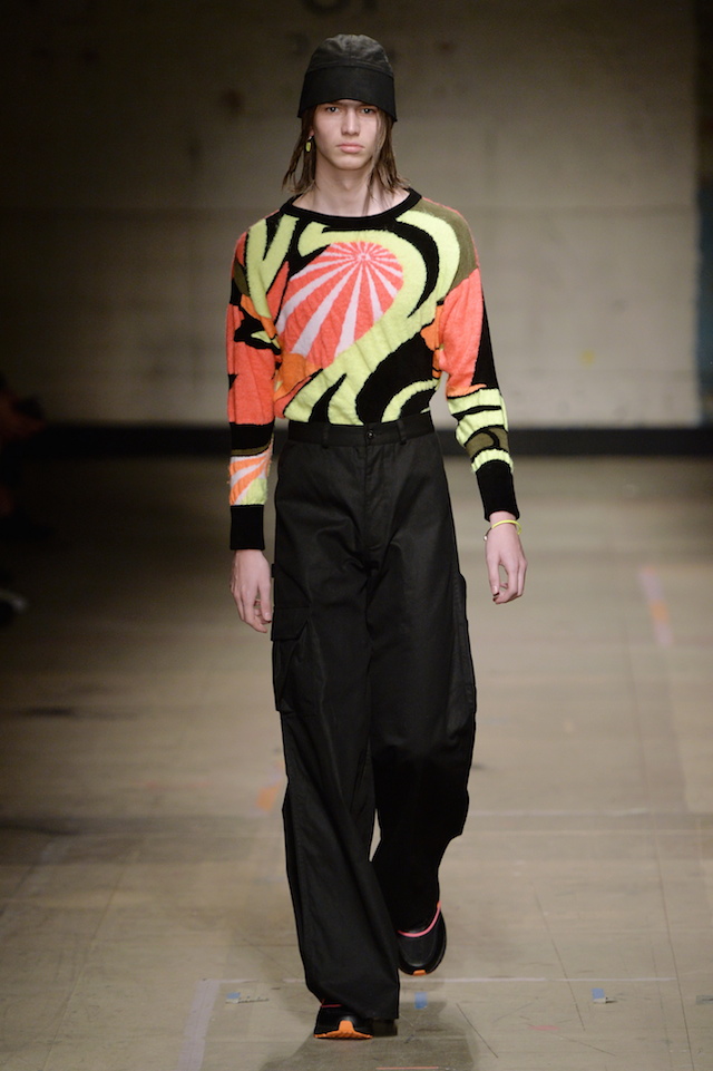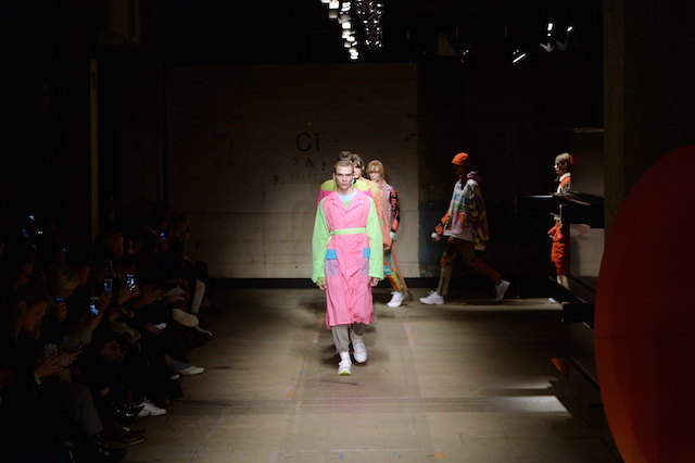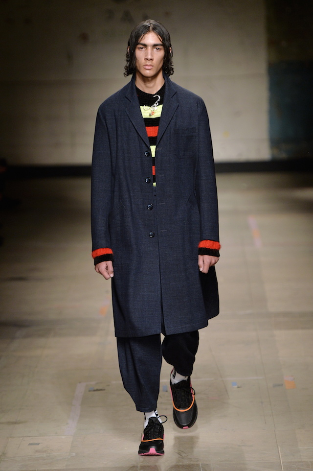 テムズ川沿いの港湾や造船所でかつて見られた労働者の作業着、そして英国のナイトシーンやユースカルチャー、特に90年代のレイヴカルチャーに見られたネオンカラーやグラフィックをインスピレーションにした今季。英国の国民的ブランドが魅せたのは、自国が誇る伝統的なテラーリングとパンクな反骨精神をミックスさせた変幻自在なストリートスタイル。音楽は、ヨーロッパ随一のエレクトロ・ミュージック・レーベル Output (アウトプット) のオーナー兼音楽プロデューサーの Trevor Jackson (トレヴァー・ジャクソン)。