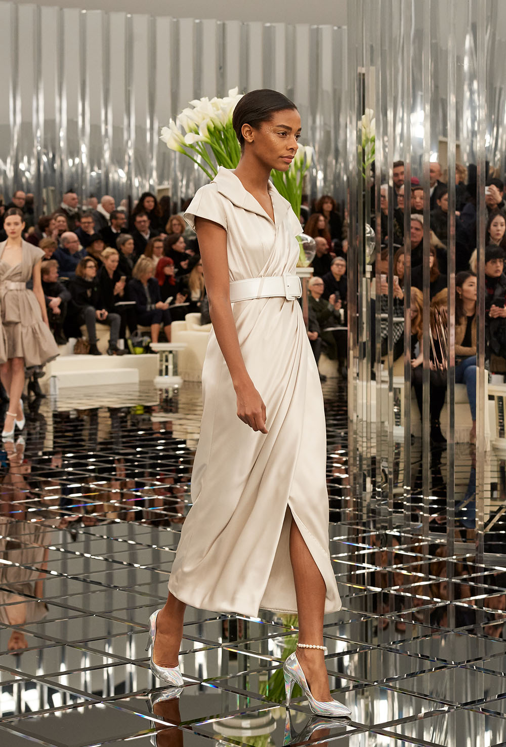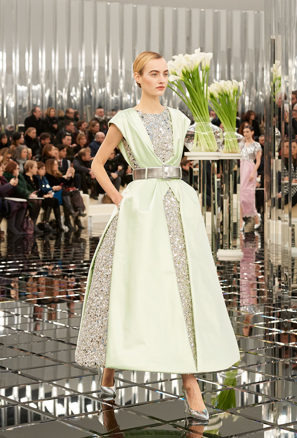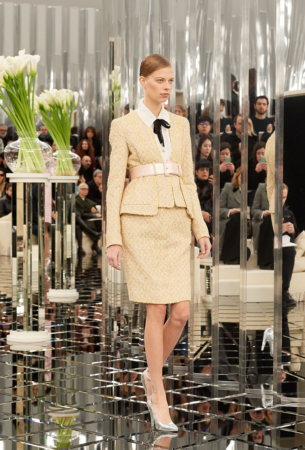 今回 Karl Lagerfeld ( カール・ラガーフェルド) がコレクションで表現したのは、生前のマドモアゼルが足を運んだこの地のヘリテージを現代へと蘇らせること。それは即ち30 年代のアールデコ洋式に見る簡潔さと絢爛さが両立するクチュールのサヴォアフェールであり、また一方でマドモアゼルの最もよく知られるポートレートの一つを彷彿とさせる鏡張りのステージを指すのであろう。過去と現在、未来が交錯するランウェイでは、アイコニックなツイードジャケットを軽やかなパステルトーンでアップデートさせたデイルックから、プリーツからレース装飾、エンブロイダリー、スモッギング、その他ありとあらゆる技巧を駆使して究極のフェミニニティを表現したイヴニングルックまで、全66 体が登場した。