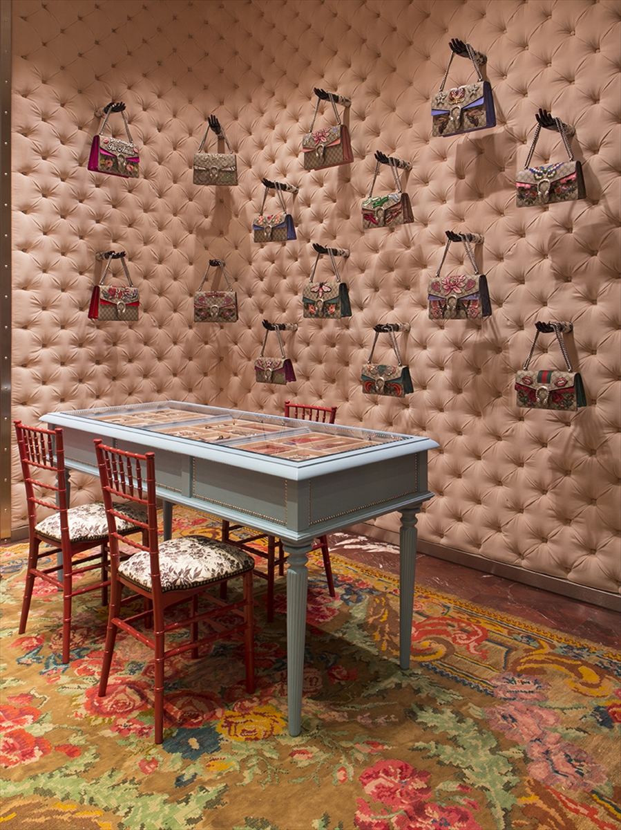 DIYプログラムの展開にあたり、Guci 青山の2階には専用のスペースが設けられ、ゆっくりとカスタマイズを楽しむことができる。DIY専用スペースは、Alessandro Michele (アレッサンドロ・ミケーレ) による新しいストアコンセプトに基づいてデザインされ、コンテンポラリーラグジュアリーをテーマに、ヴィンテージのオリエンタルラグやソフトベルベットなど、Gucci 特有の美しいファニチャーやショーケースが用いられている一方で、装飾的な大理石といった硬質なサーフェスや、リベットといったインダストリアルなエレメントと組み合わされ、見事にテーマを表現している。