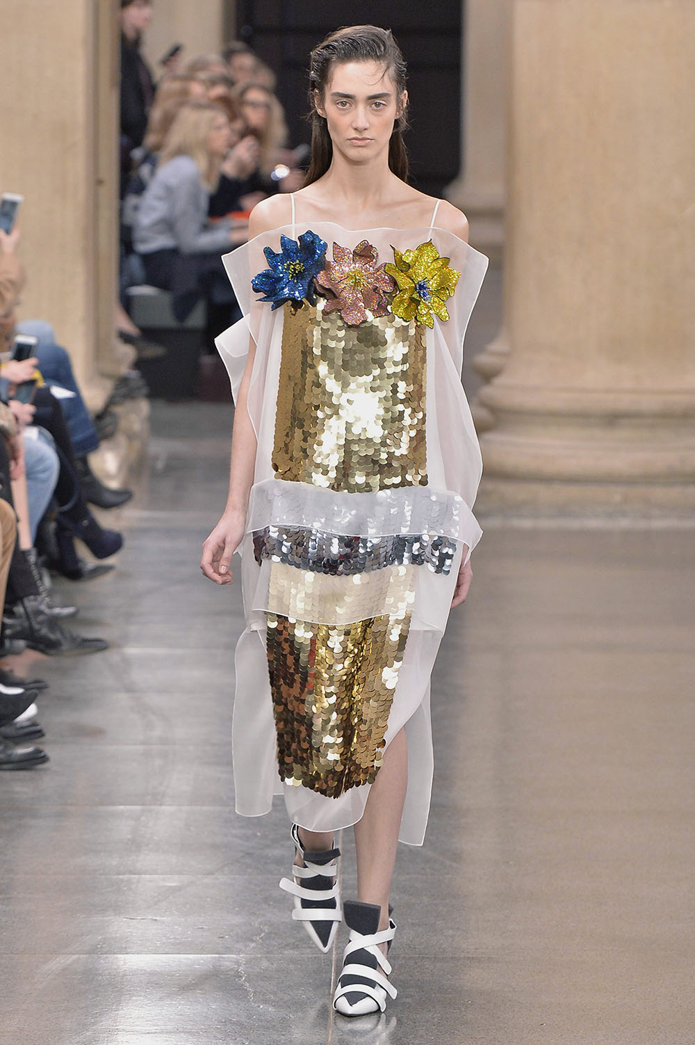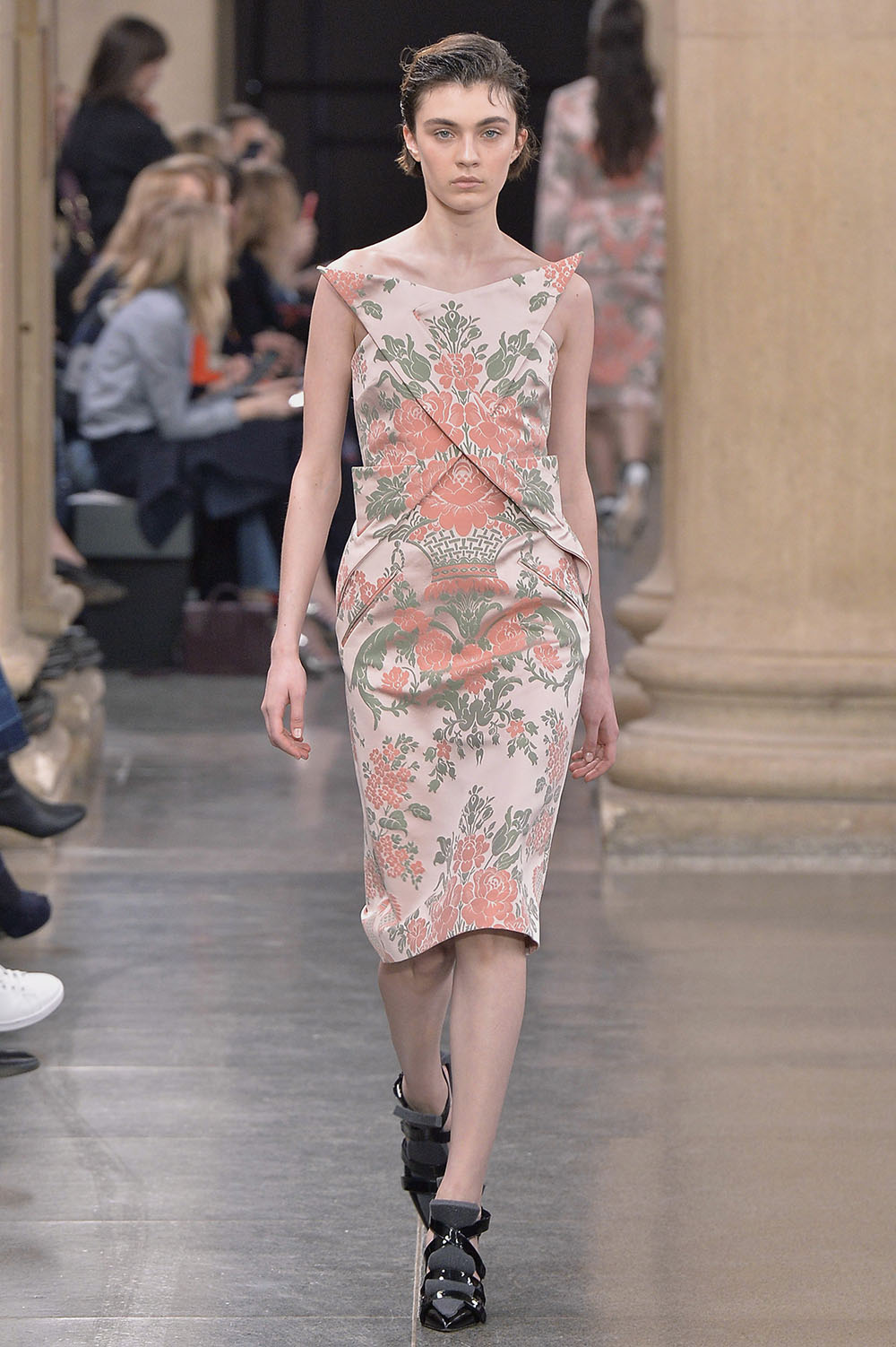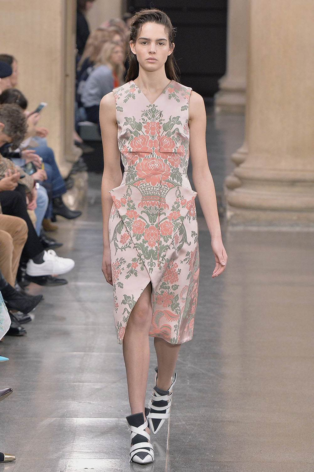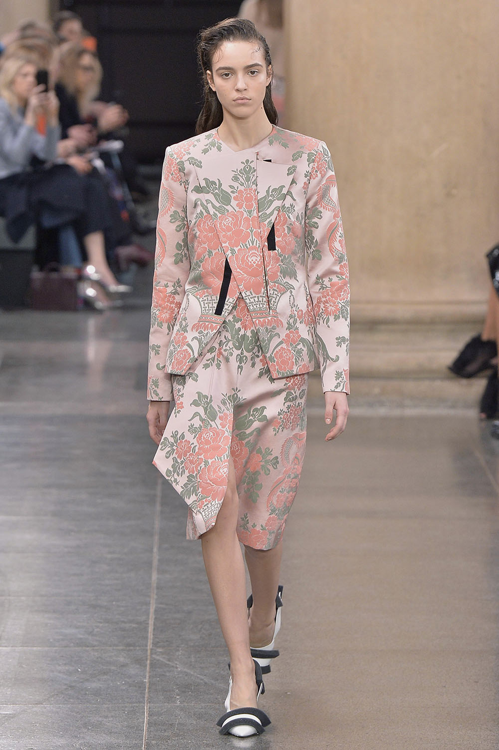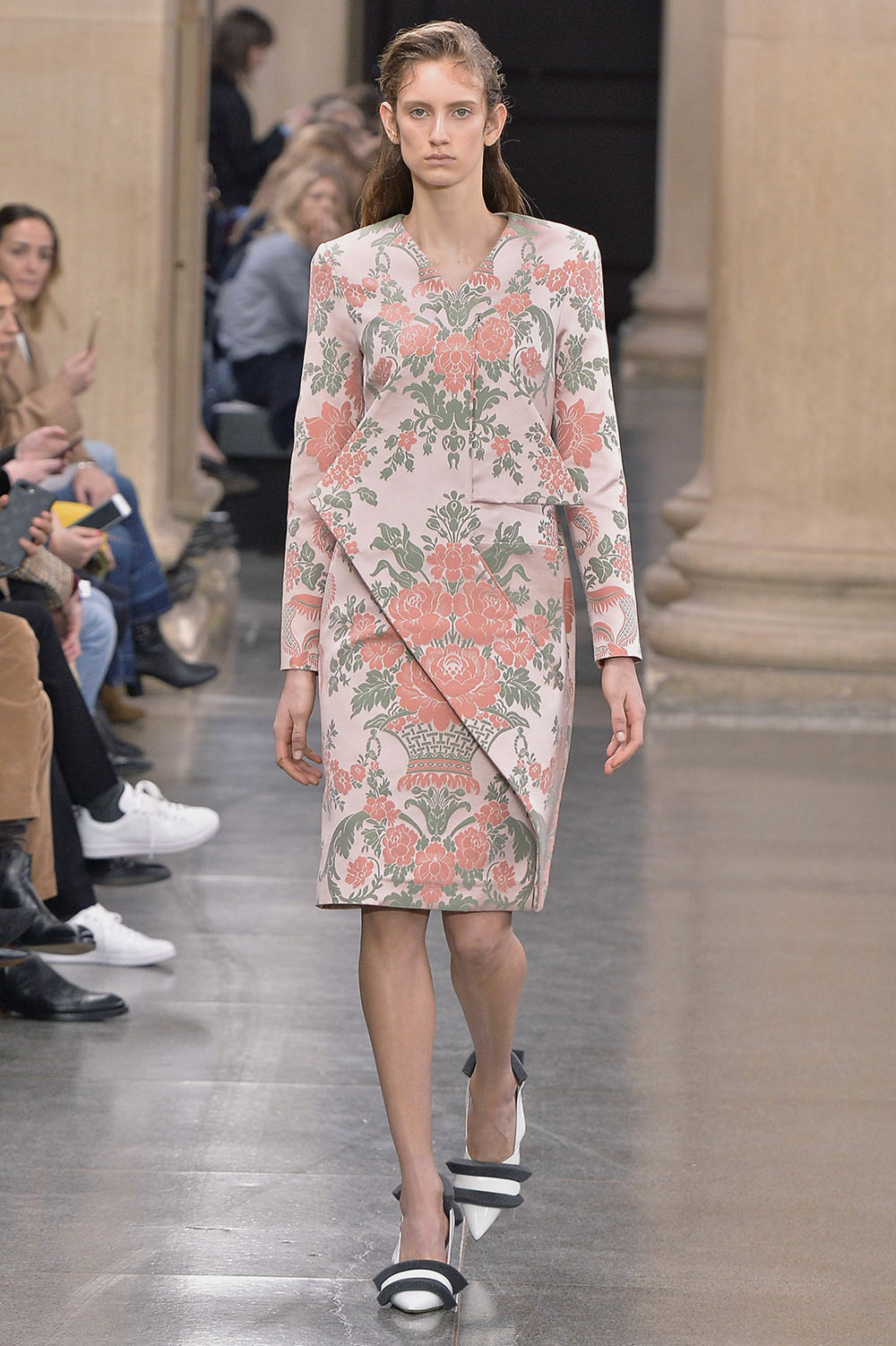 ロンドンファッションウィーク期間中にあたる20日、Christopher Kane (クリストファー・ケイン) による2017-18年秋冬ウィメンズウェア コレクションが発表された。今季ランウェイで発表されたのは45体。前半ではどこか懐かしさを覚えるフラワーモチーフのジャカードファブリックで仕立てたノスタルジックなルックが登場。ほっこりした素材感とは対照的に、折り紙のようにジオメトリックなパネル使いがどこか近未来的な佇まいだ。