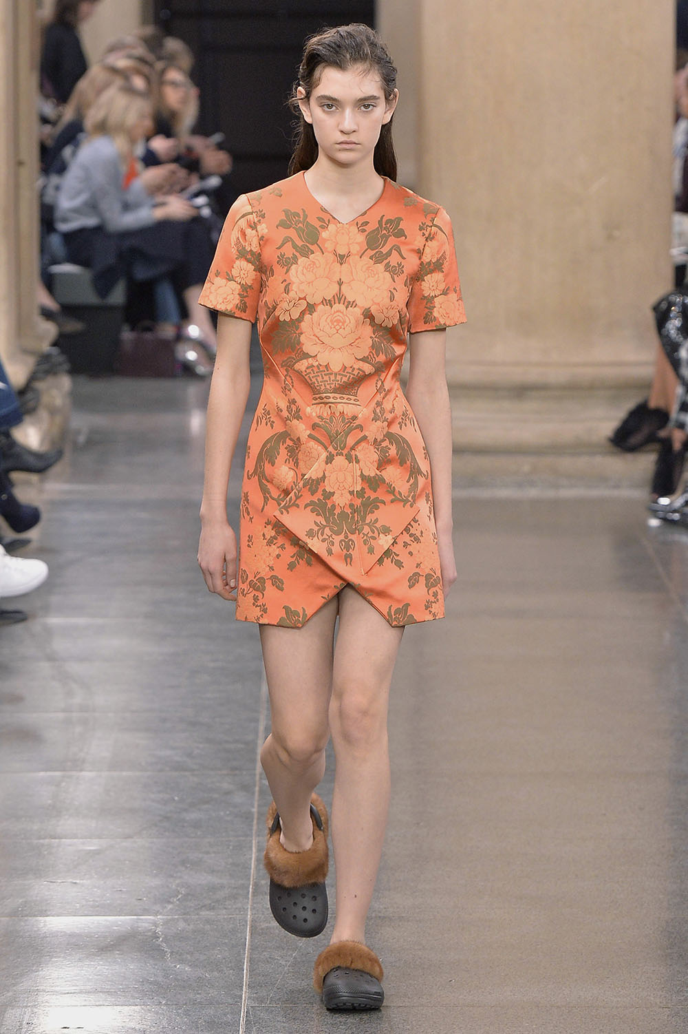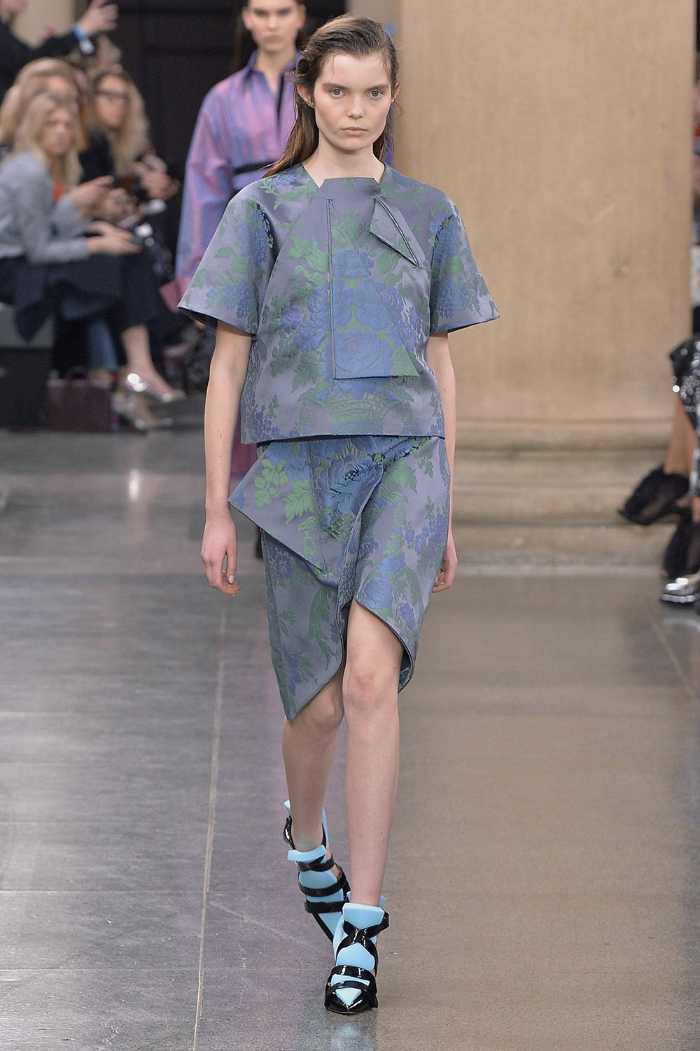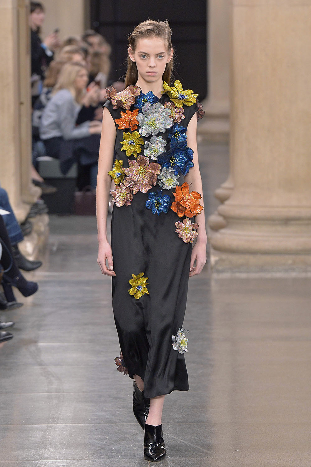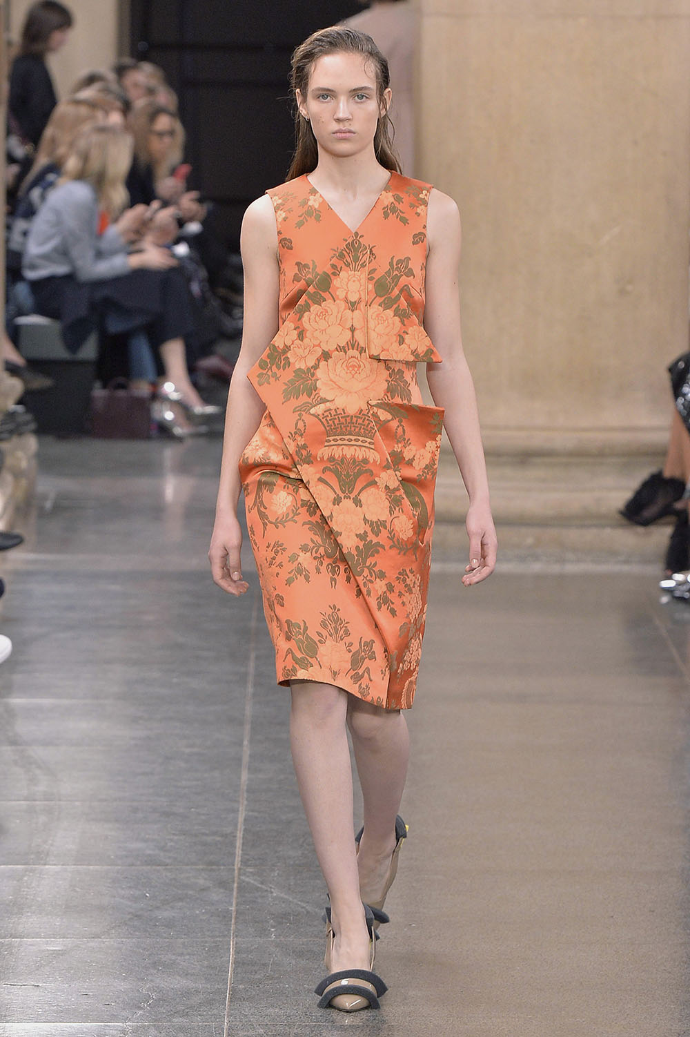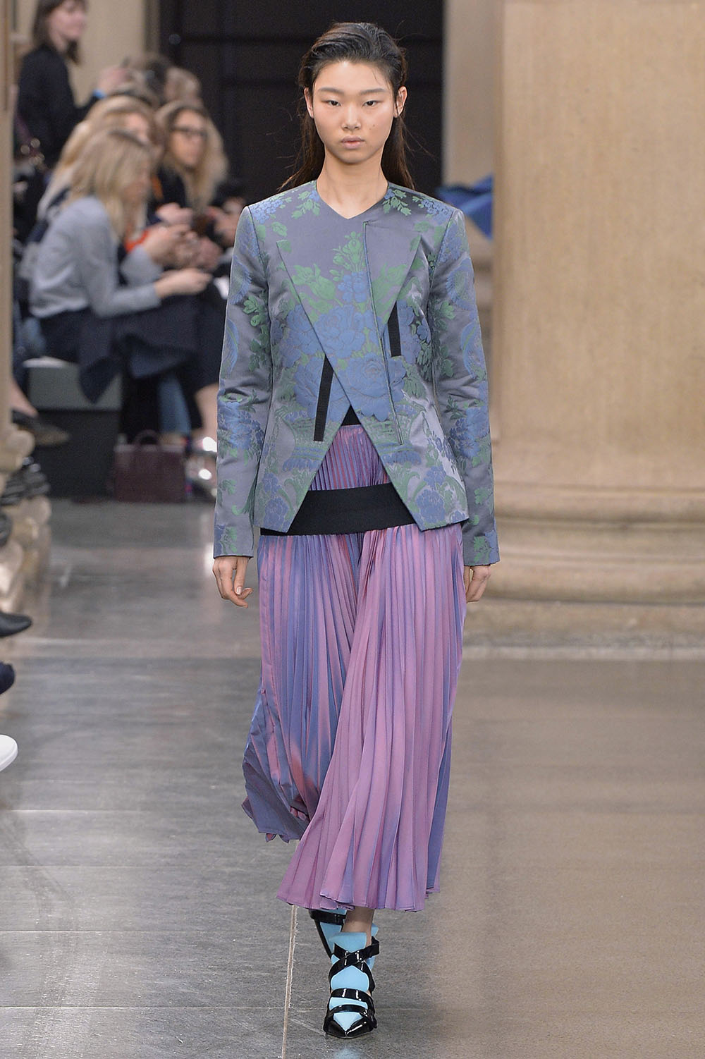 ロンドンファッションウィーク期間中にあたる20日、Christopher Kane (クリストファー・ケイン) による2017-18年秋冬ウィメンズウェア コレクションが発表された。今季ランウェイで発表されたのは45体。前半ではどこか懐かしさを覚えるフラワーモチーフのジャカードファブリックで仕立てたノスタルジックなルックが登場。ほっこりした素材感とは対照的に、折り紙のようにジオメトリックなパネル使いがどこか近未来的な佇まいだ。
