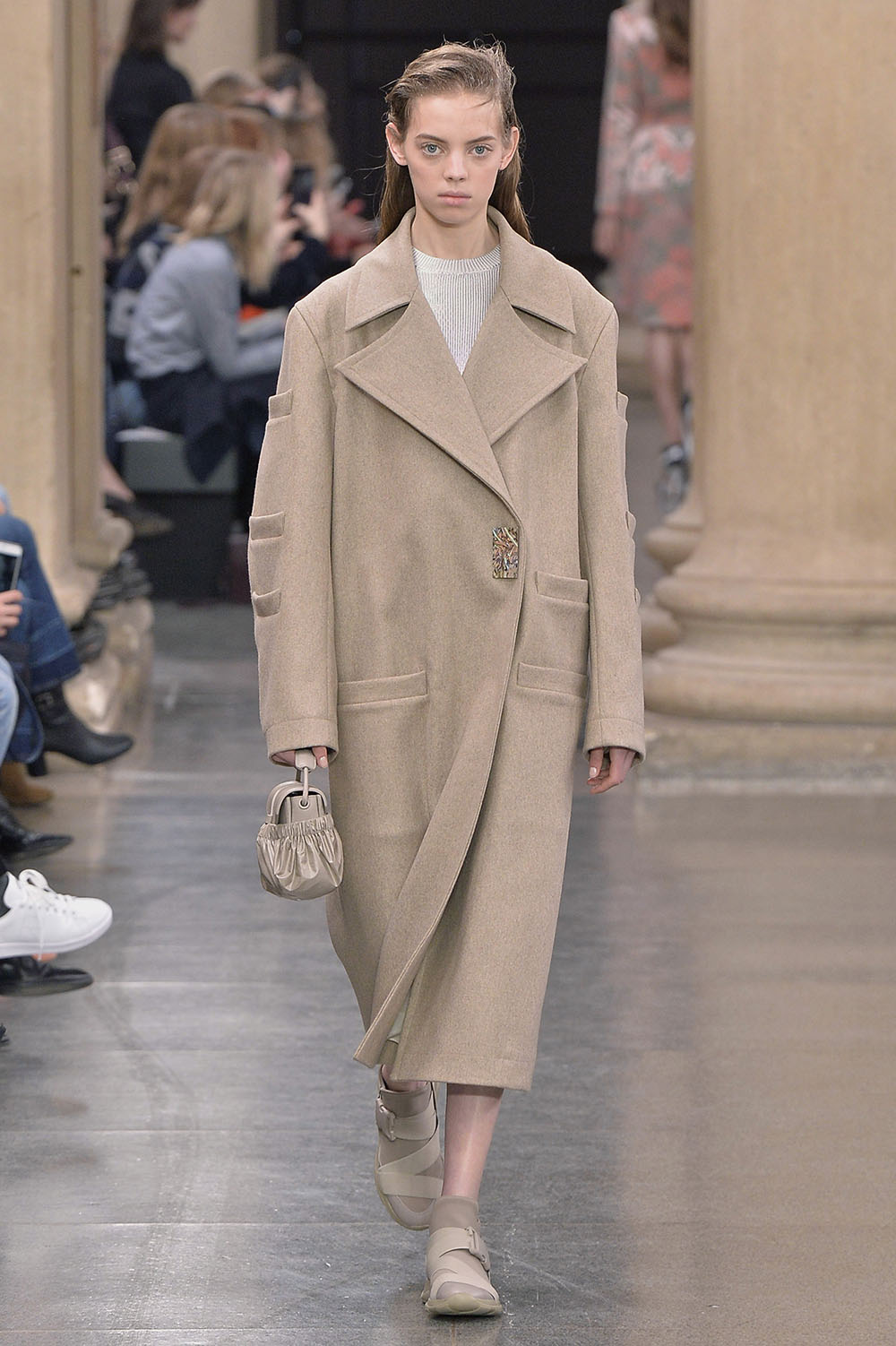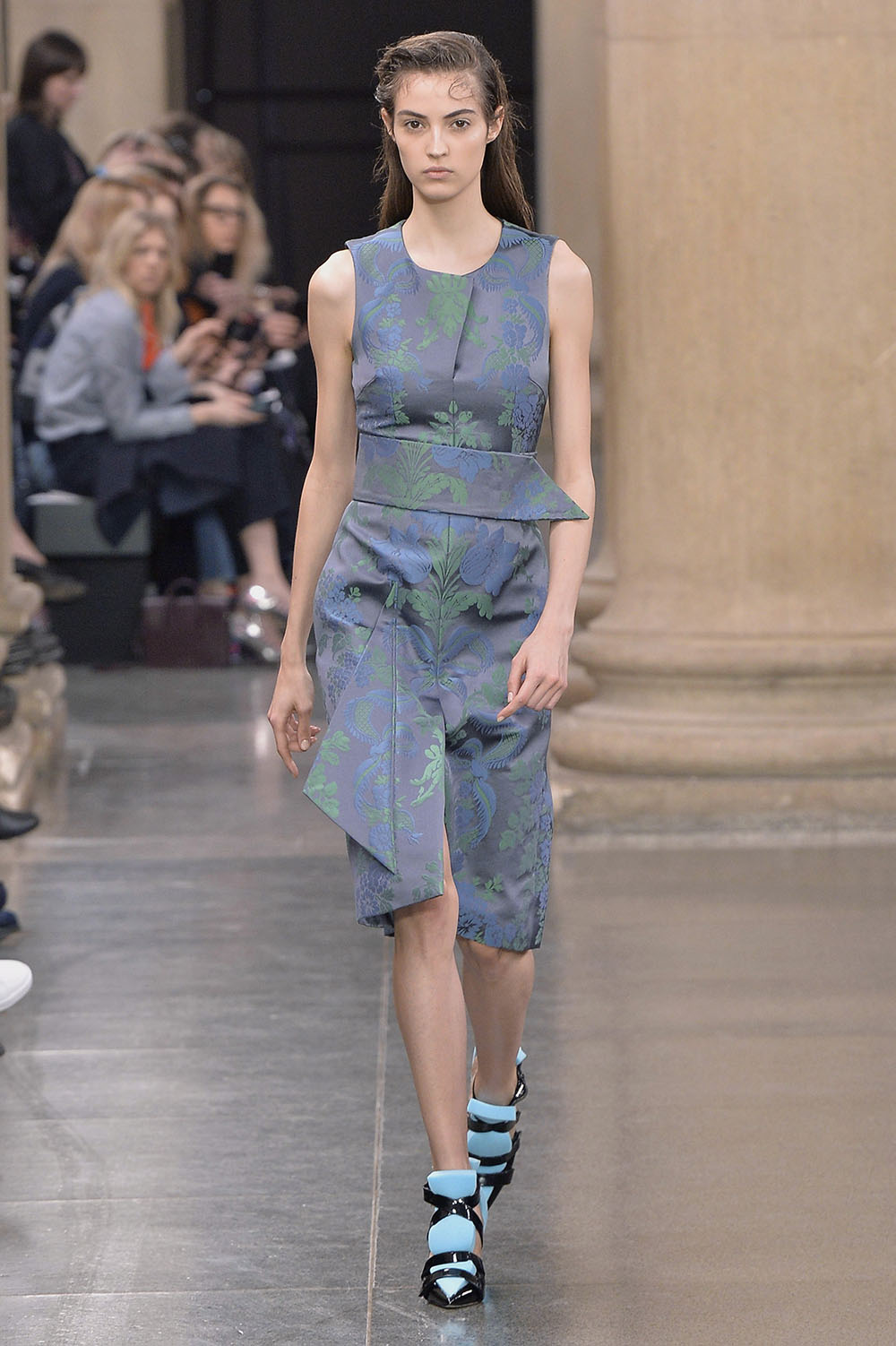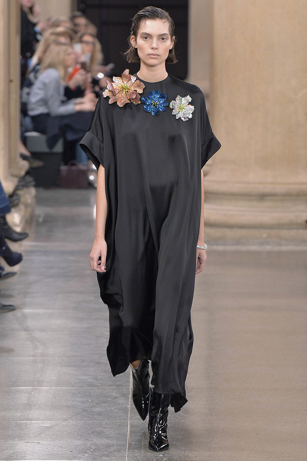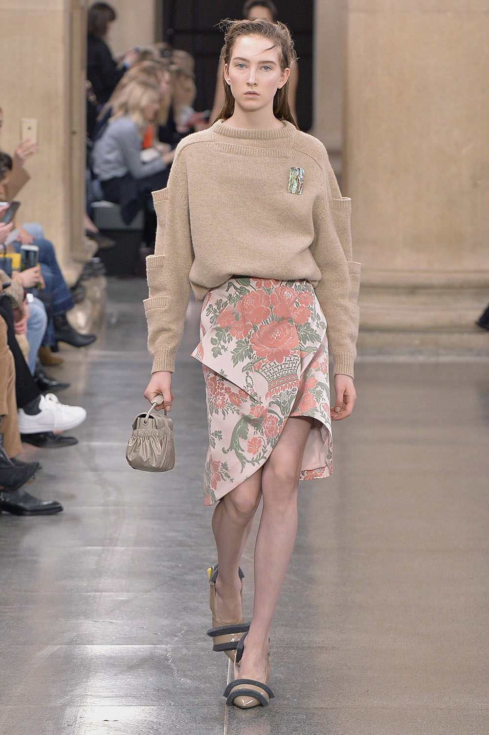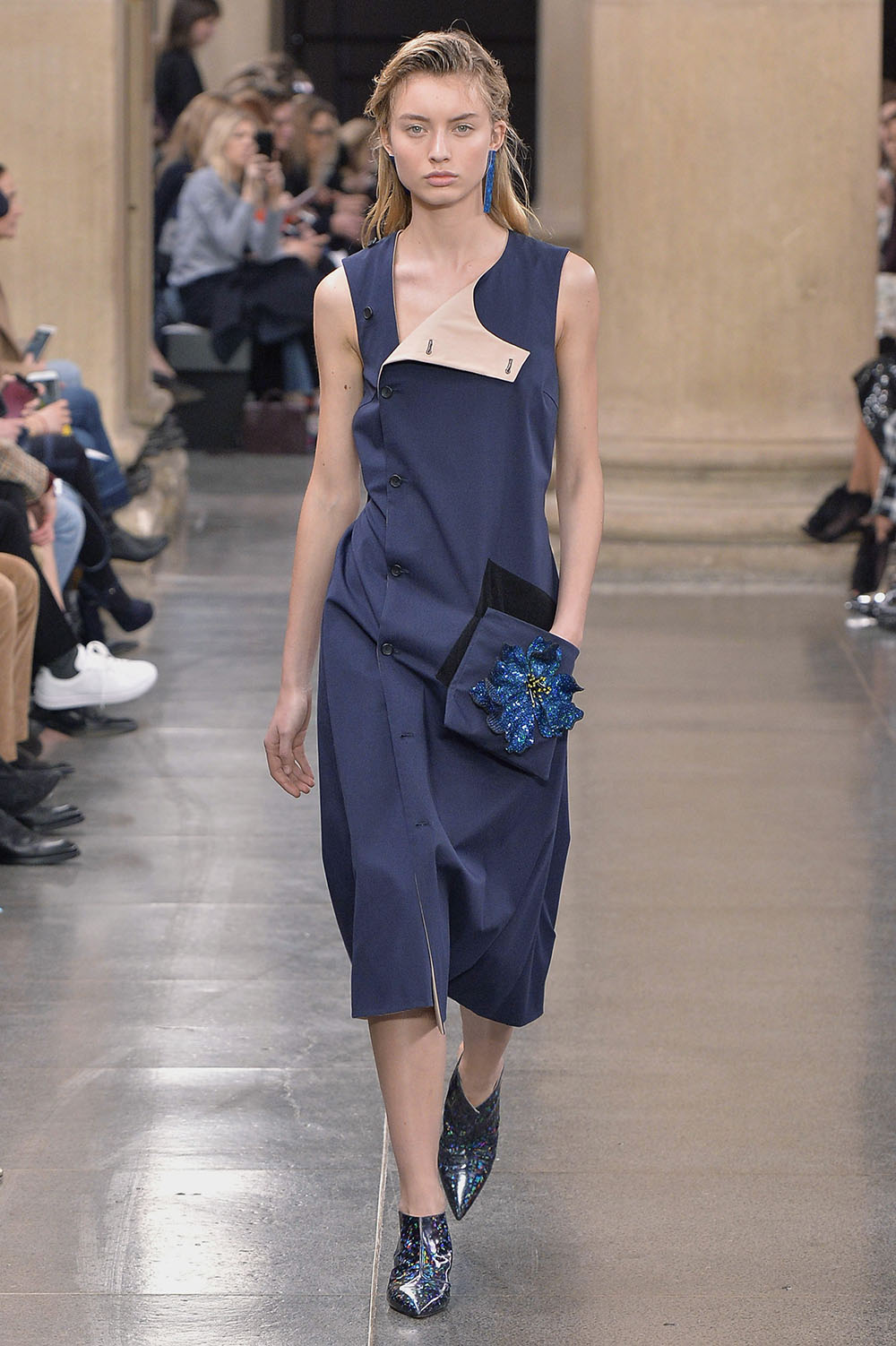ロンドンファッションウィーク期間中にあたる20日、Christopher Kane (クリストファー・ケイン) による2017-18年秋冬ウィメンズウェア コレクションが発表された。今季ランウェイで発表されたのは45体。前半ではどこか懐かしさを覚えるフラワーモチーフのジャカードファブリックで仕立てたノスタルジックなルックが登場。ほっこりした素材感とは対照的に、折り紙のようにジオメトリックなパネル使いがどこか近未来的な佇まいだ。