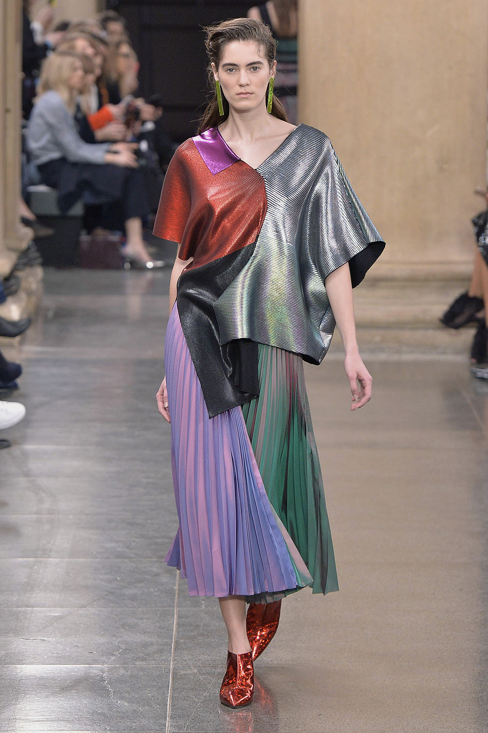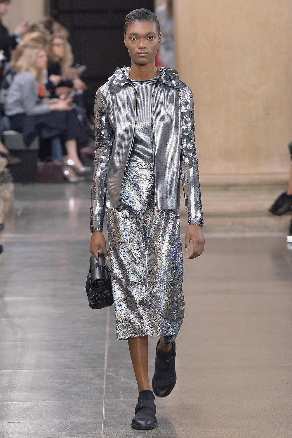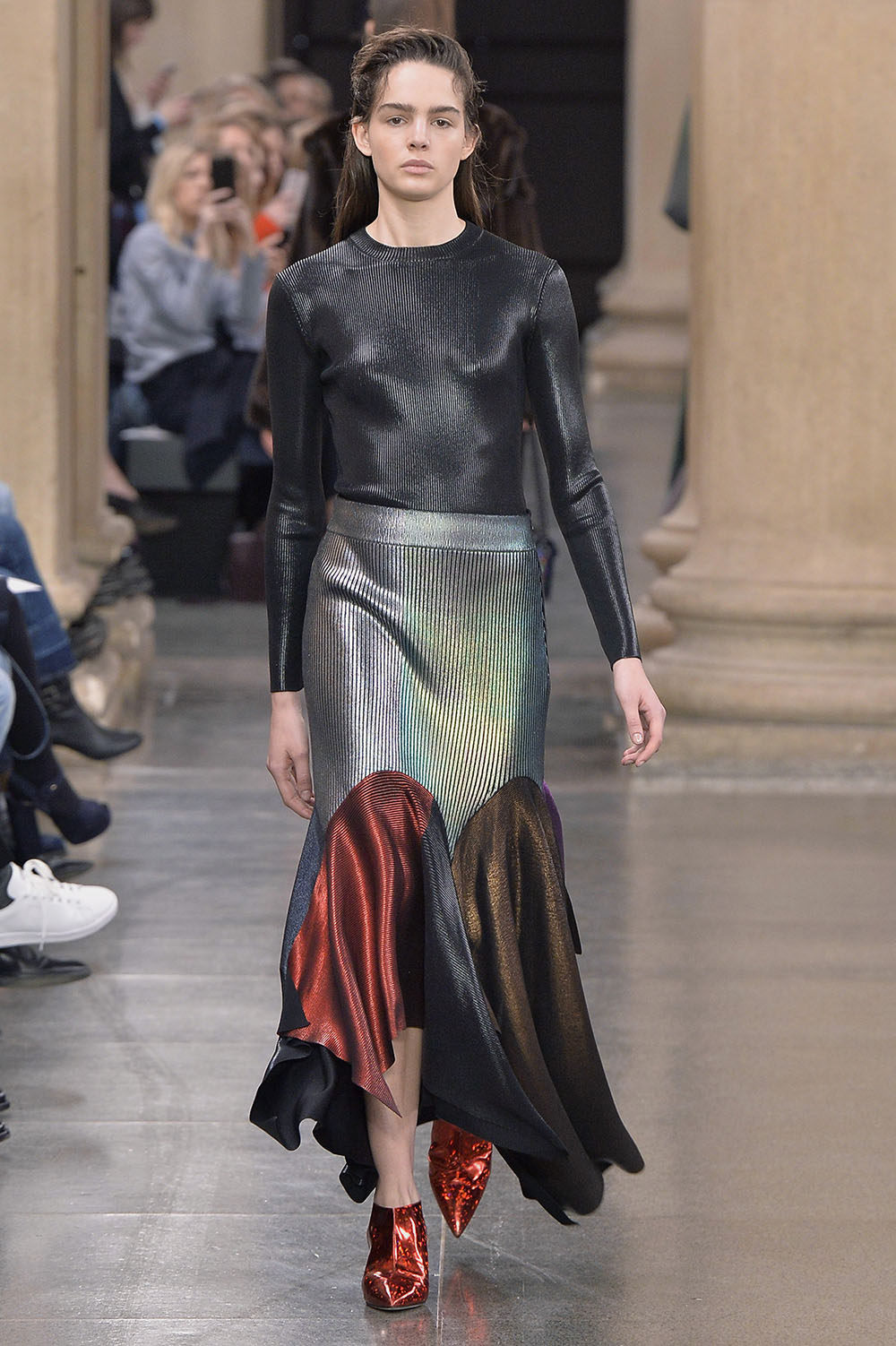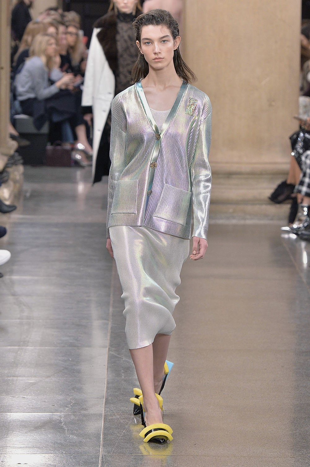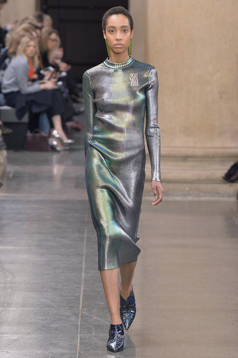 ブランドのお家芸であるフューチャリスティックなスタイルは後半にかけて徐々に顕著になり、入りデッセントな光沢感を放つプリーツのセットアップや、ホログラムのスパンコール装飾が施されたイヴニングなど、今季秋冬のトレンドの一つである80年代のグラムロックを彷彿とさせるルックが華やぎを添えた。