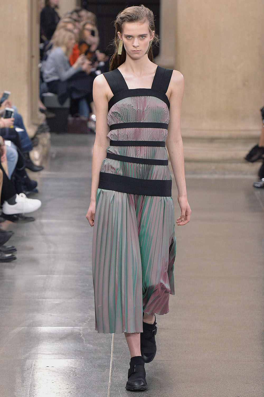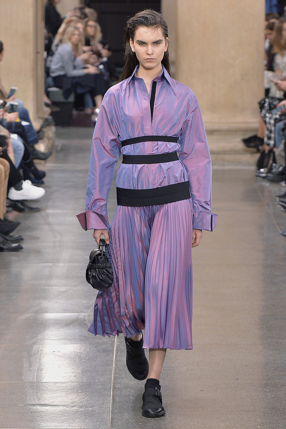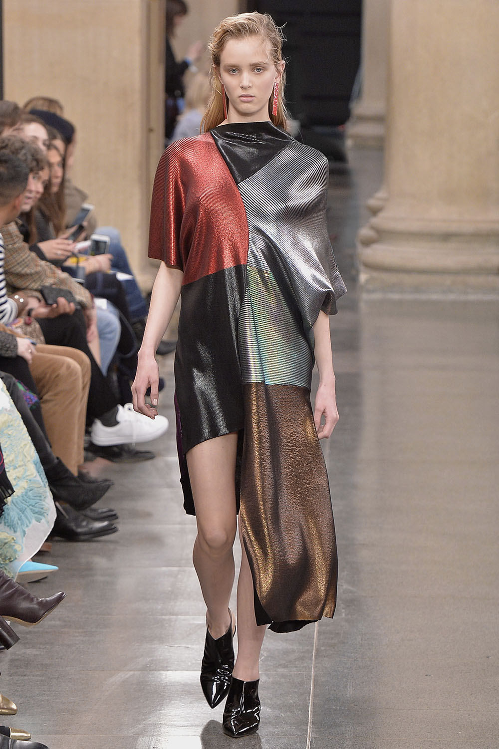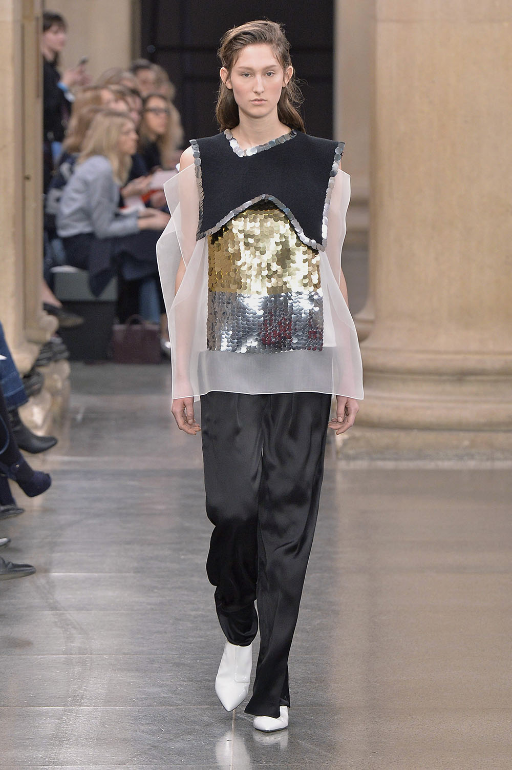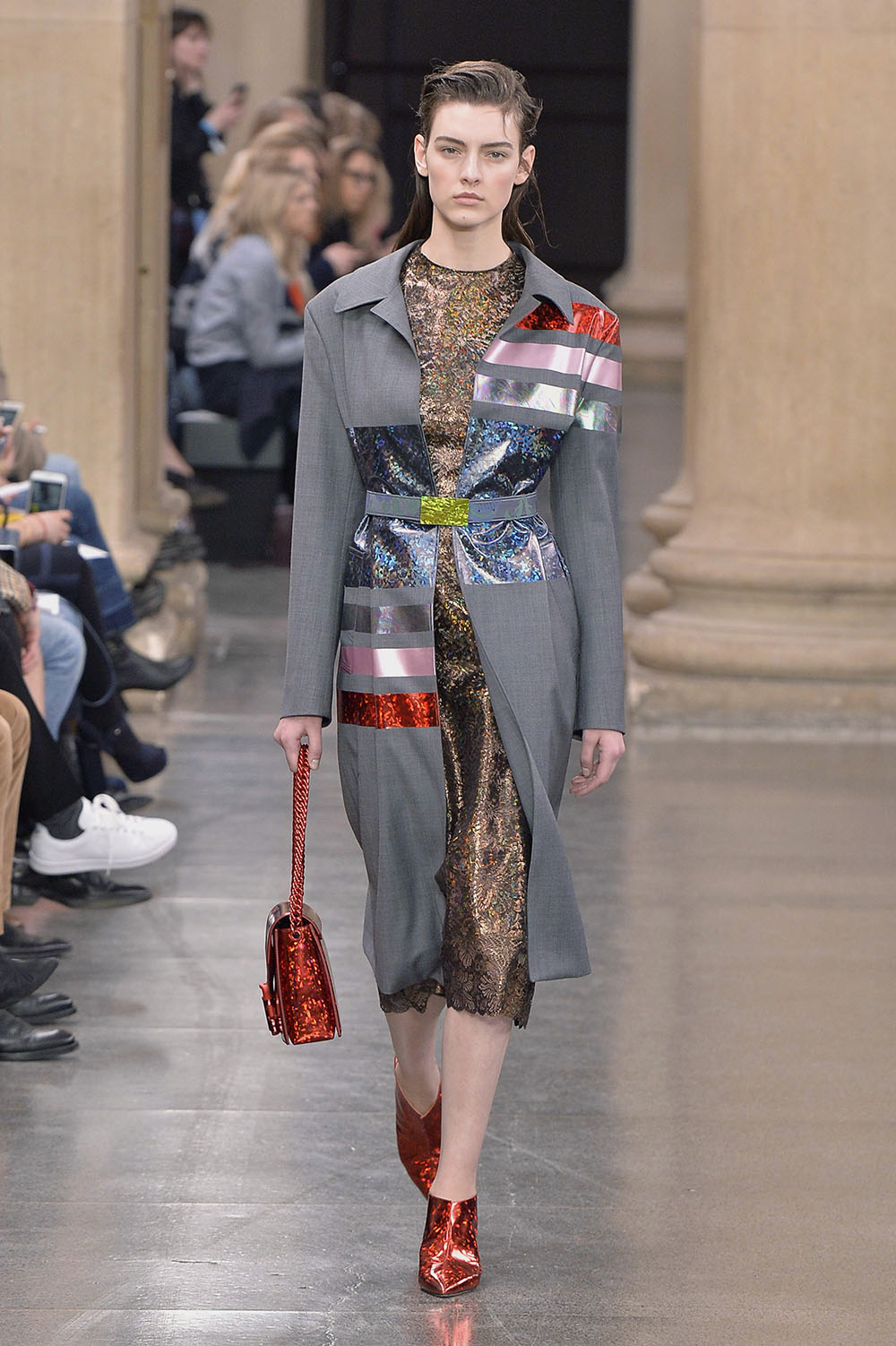 ブランドのお家芸であるフューチャリスティックなスタイルは後半にかけて徐々に顕著になり、入りデッセントな光沢感を放つプリーツのセットアップや、ホログラムのスパンコール装飾が施されたイヴニングなど、今季秋冬のトレンドの一つである80年代のグラムロックを彷彿とさせるルックが華やぎを添えた。