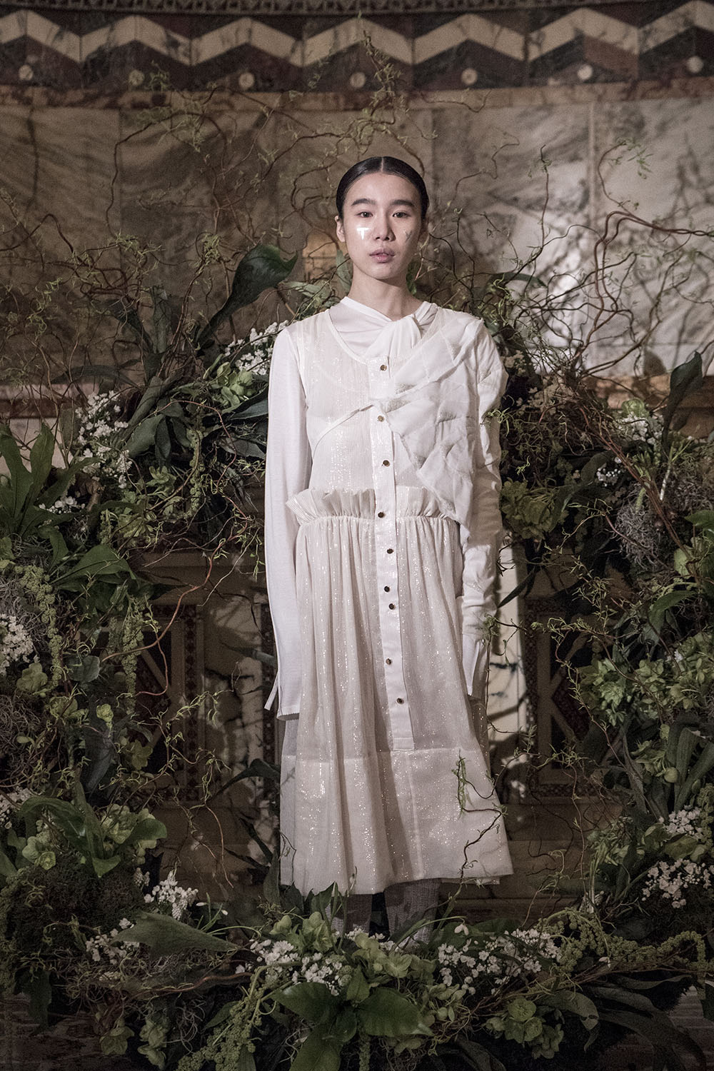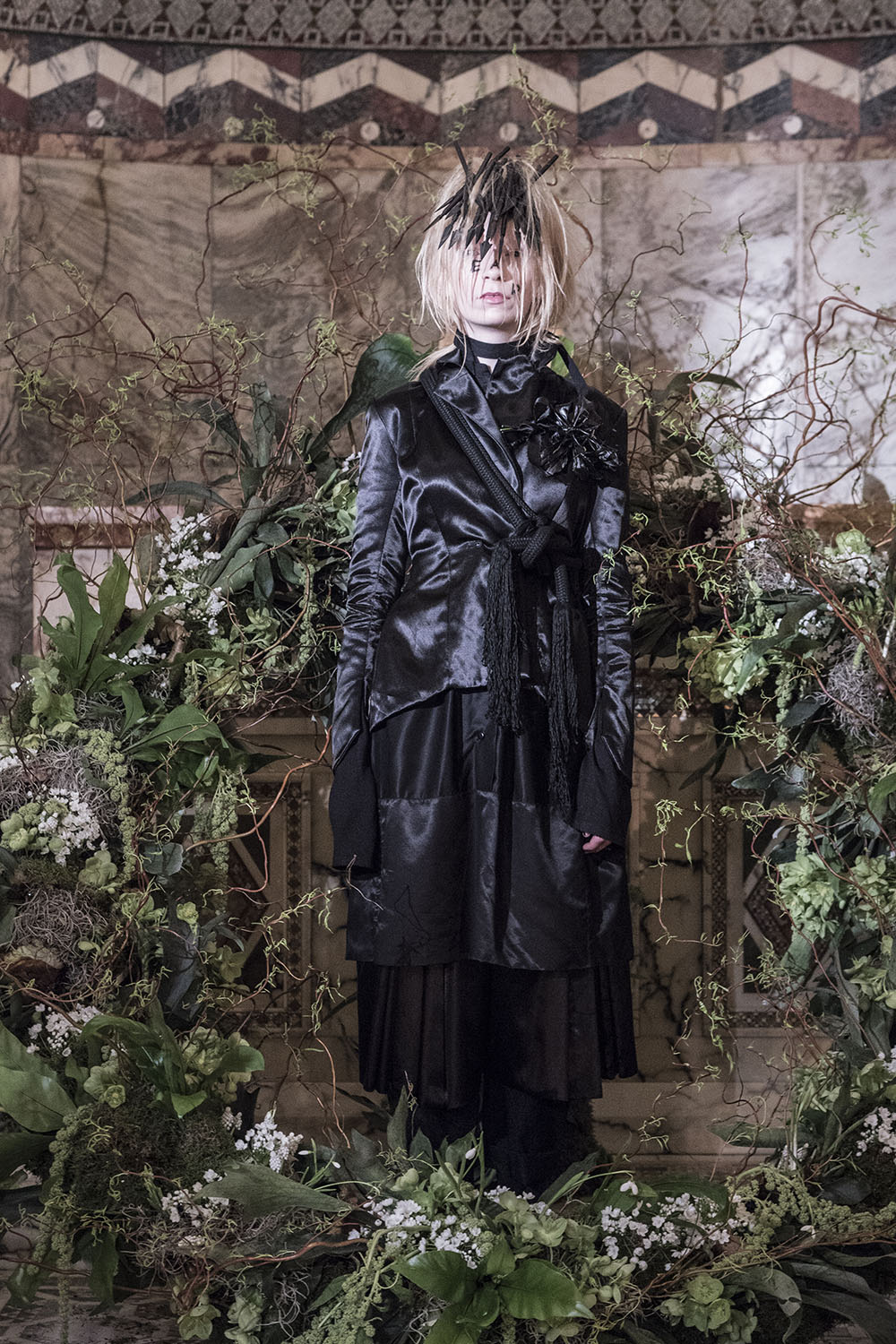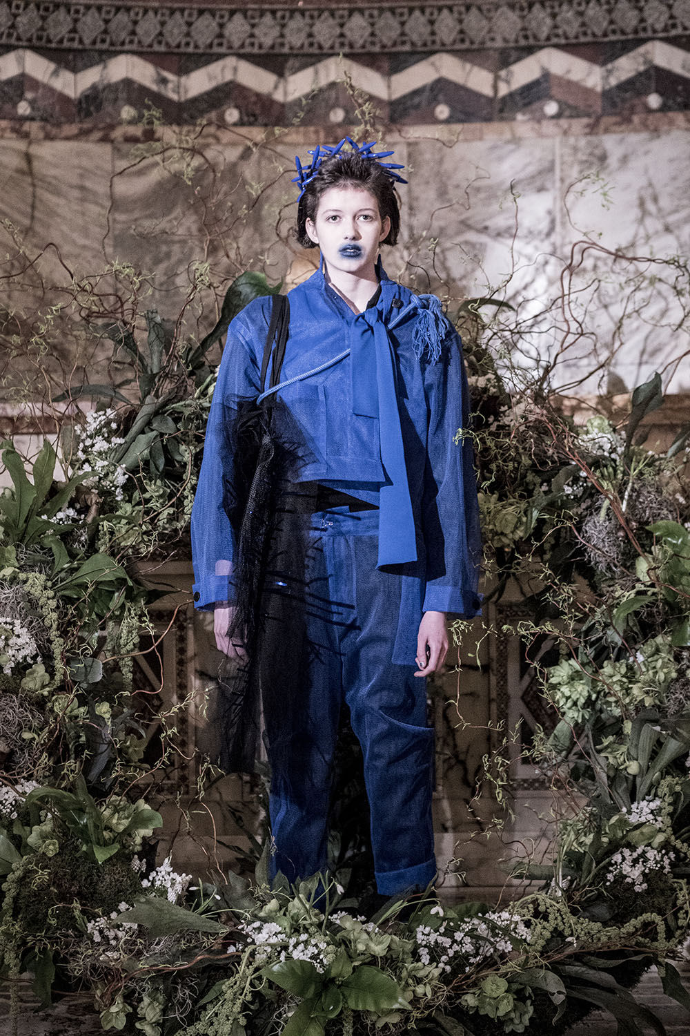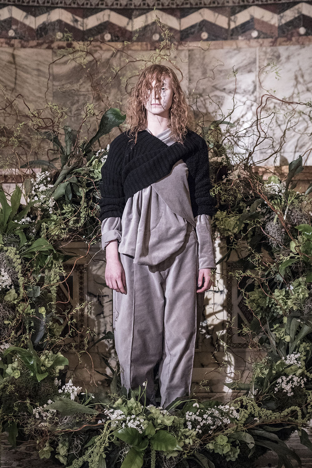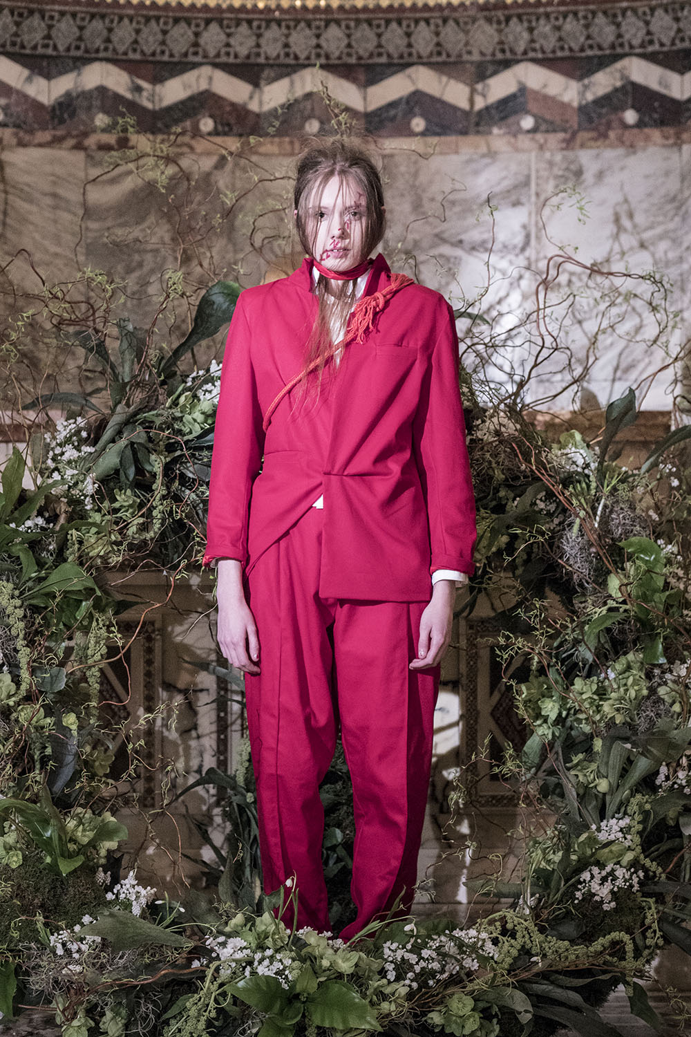 今季コレクションのインスピレーションとなったのは、「tyranny and unity (独裁と結束)」。プレゼンテーション形式で発表されたコレクションでは、フラワーアーティストの Maison de Fleurs (メゾン・ドゥ・フルール) によるガーデンディスプレイ、そして今季で3度目となる John Smedley (ジョン・スメドレー) とのコラボアイテムも登場した。