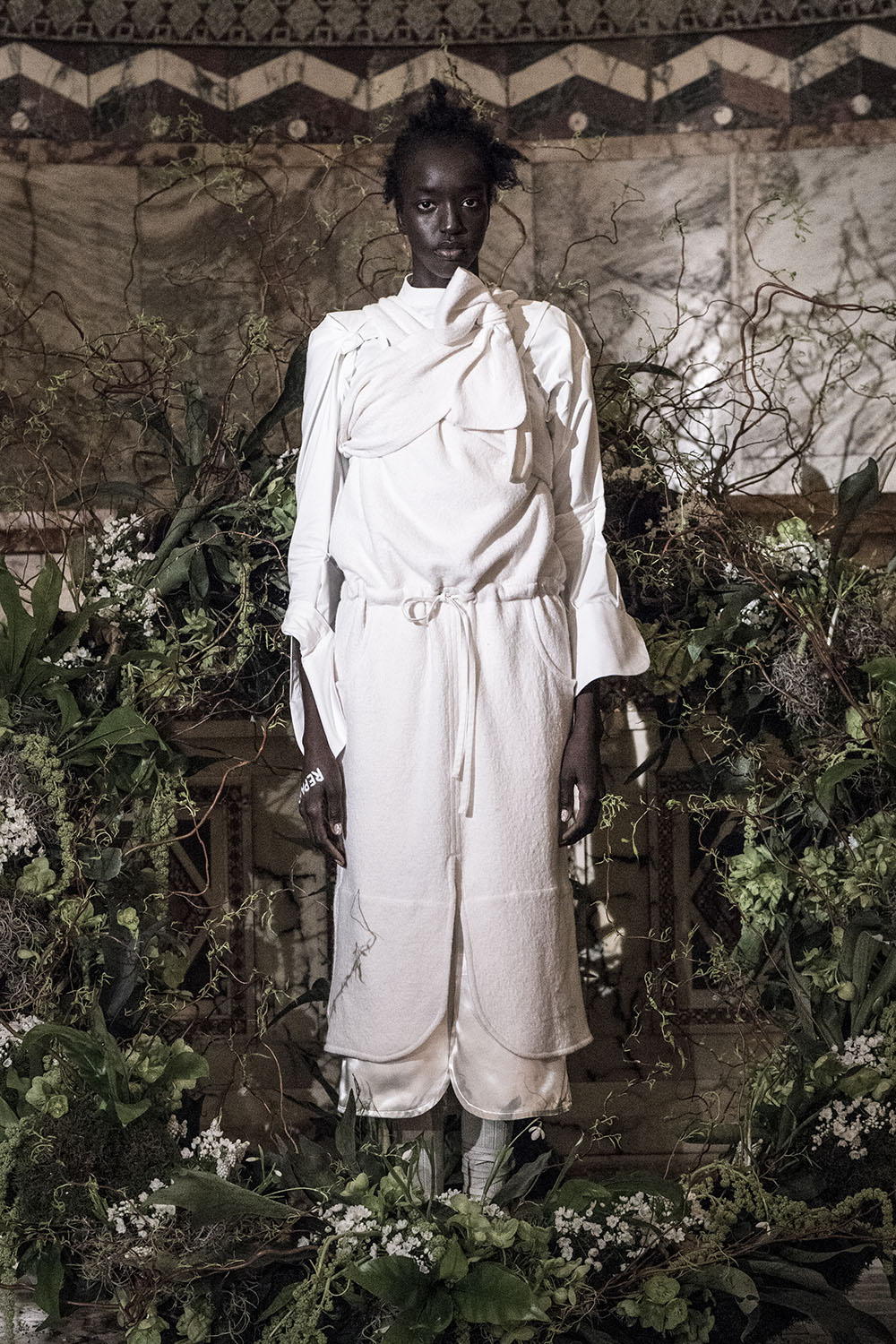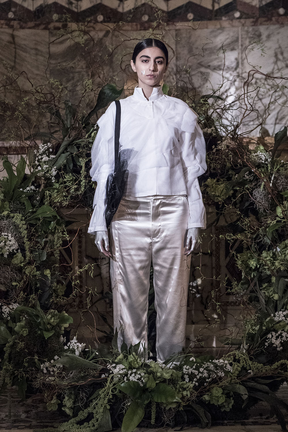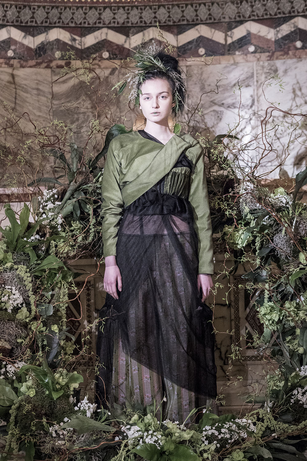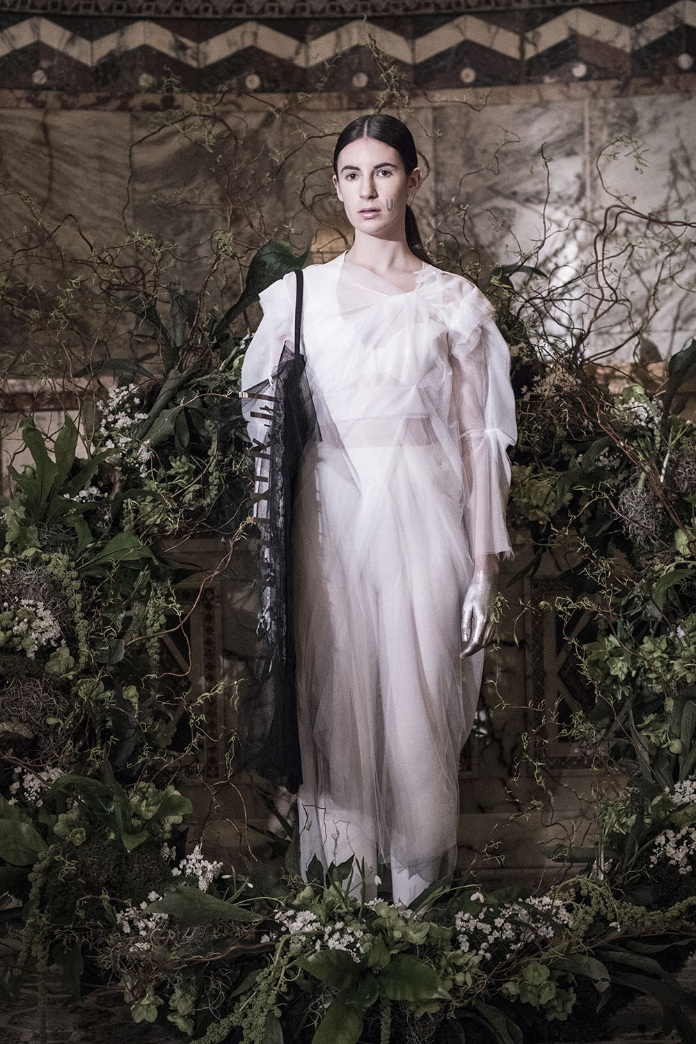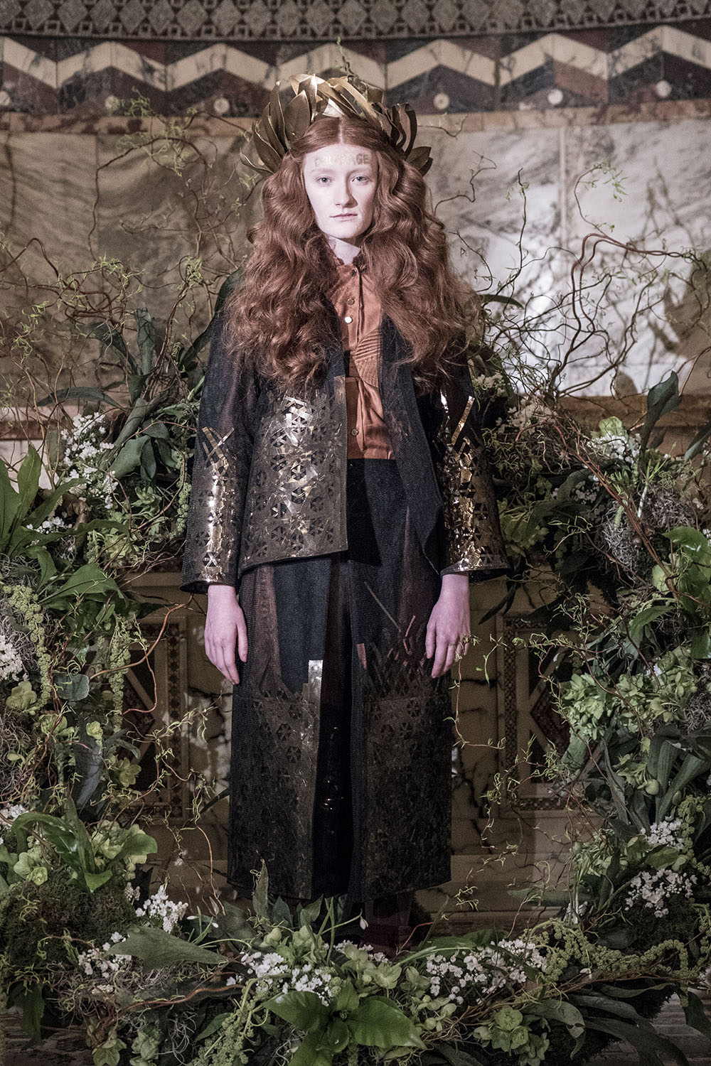 今季コレクションのインスピレーションとなったのは、「tyranny and unity (独裁と結束)」。プレゼンテーション形式で発表されたコレクションでは、フラワーアーティストの Maison de Fleurs (メゾン・ドゥ・フルール) によるガーデンディスプレイ、そして今季で3度目となる John Smedley (ジョン・スメドレー) とのコラボアイテムも登場した。